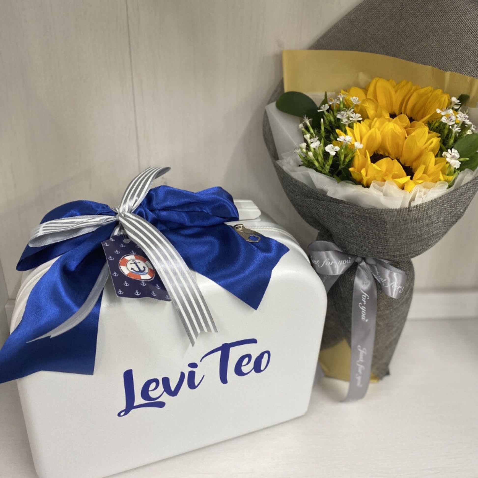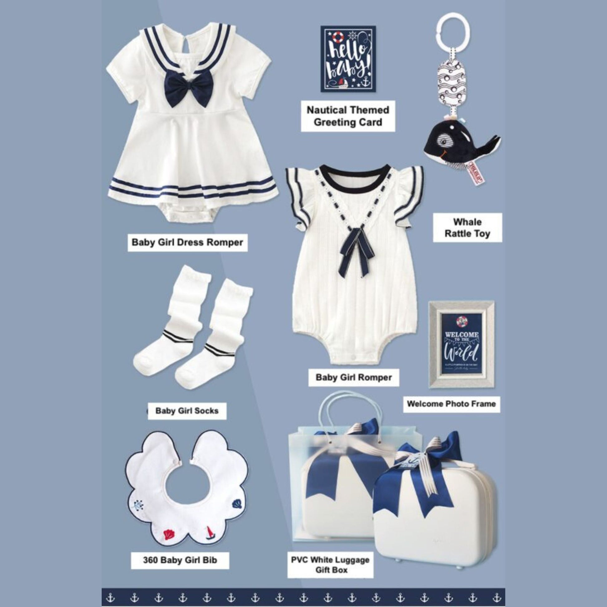 Welcome your little sailor with this nautical-themed baby gift set! The Ahoy Girl Baby Gift Set is a charming collection of 8 essentials, all tucked away in a beautiful white mini luggage bag. From a comfy romper to a sweet welcome photo frame, this set is the perfect way to celebrate your "little matey's" arrival.