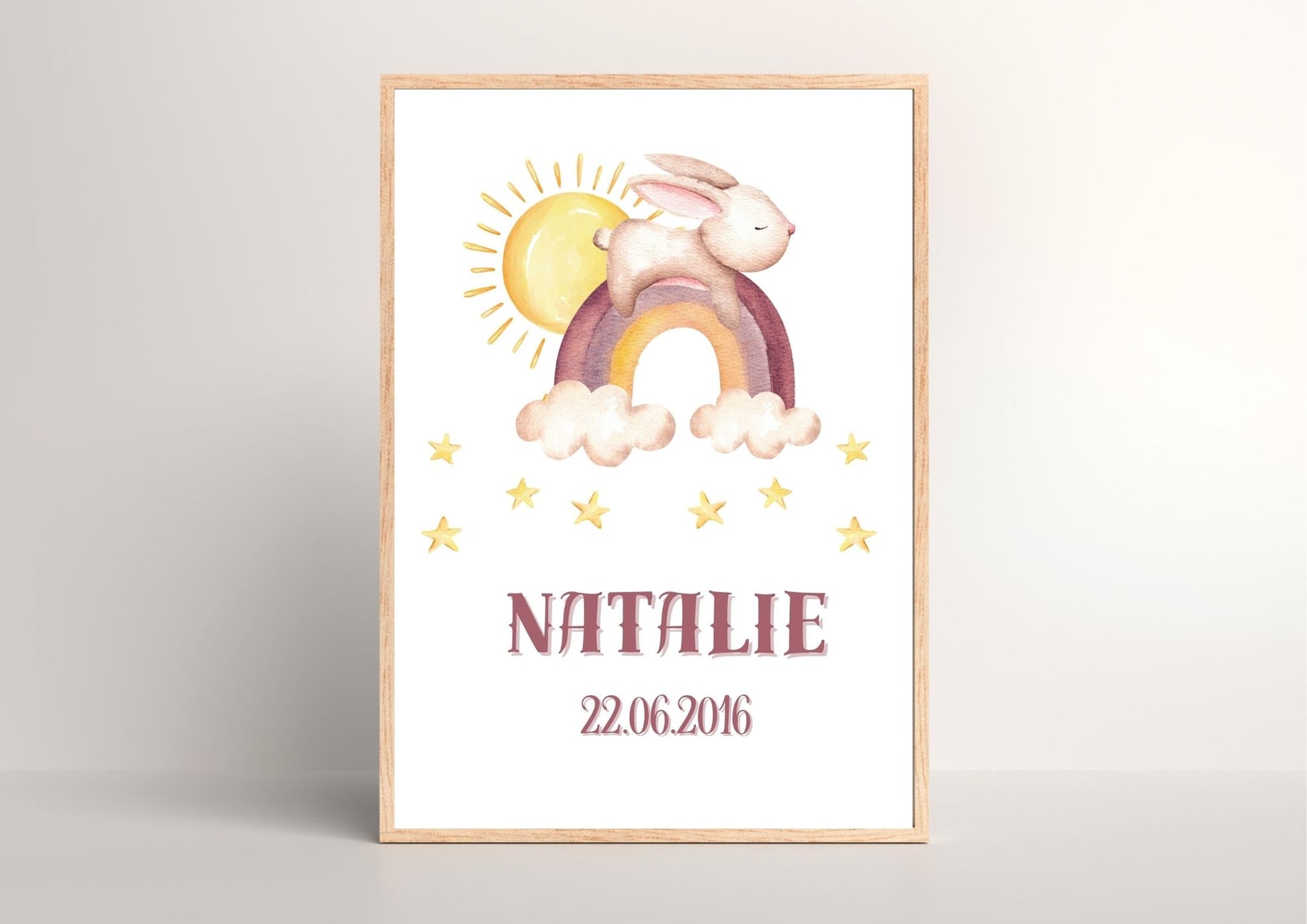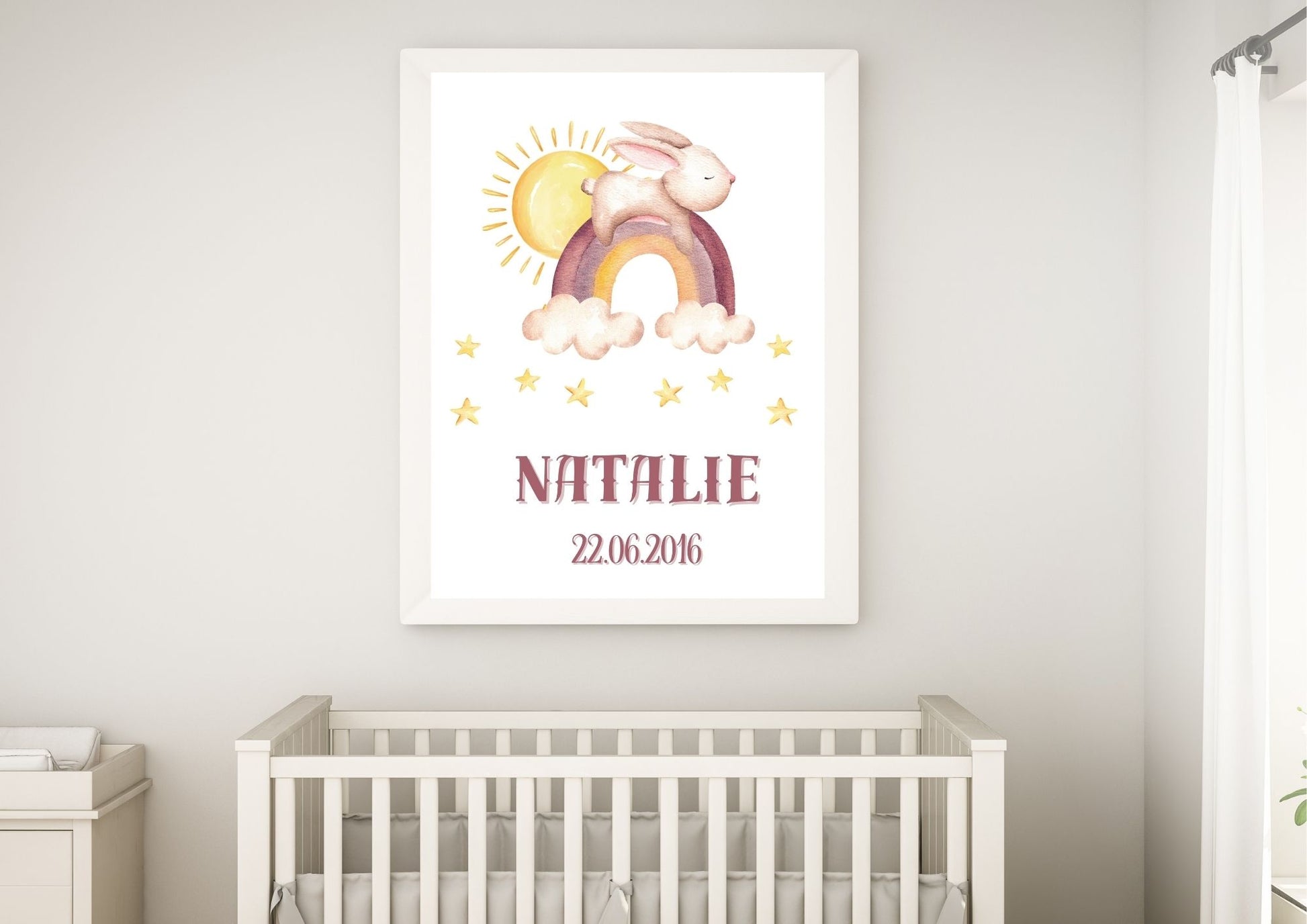 Join our adorable Bunny on a whimsical journey across the skies with our Bunny's Rainbow Journey Personalized Poster! This charming poster features a cute bunny rabbit hopping across a vibrant rainbow, surrounded by the warmth of the sun, fluffy clouds, and twinkling stars. Personalize it with your baby's name and birthdate below the rainbow, creating a unique and delightful addition to their nursery decor. Perfect for adding a touch of magic and joy to your little one's room, this poster is sure to captivate their imagination and bring smiles for years to come..
