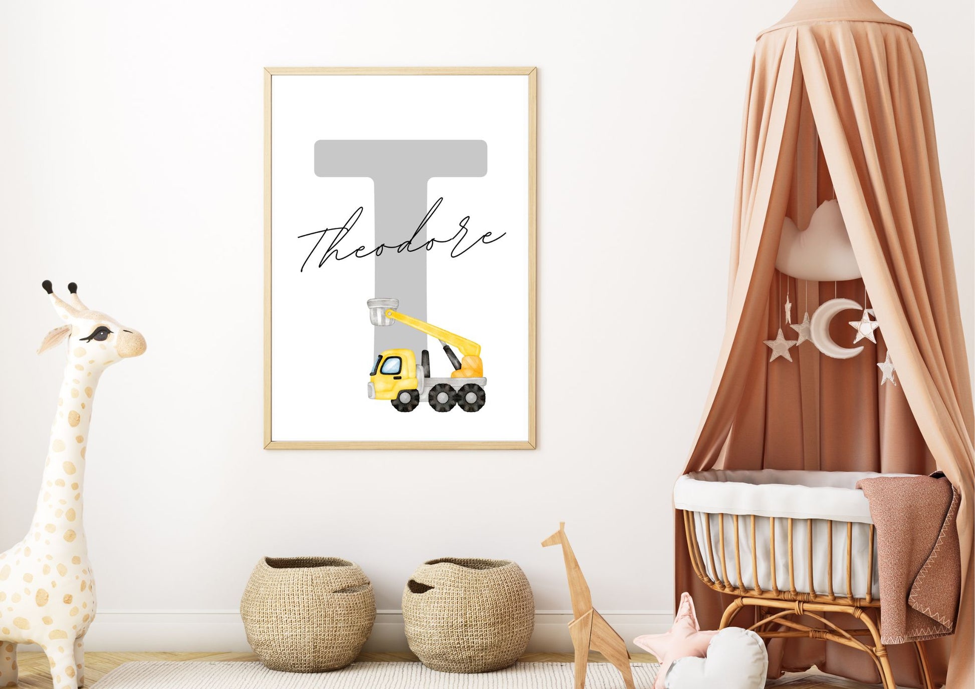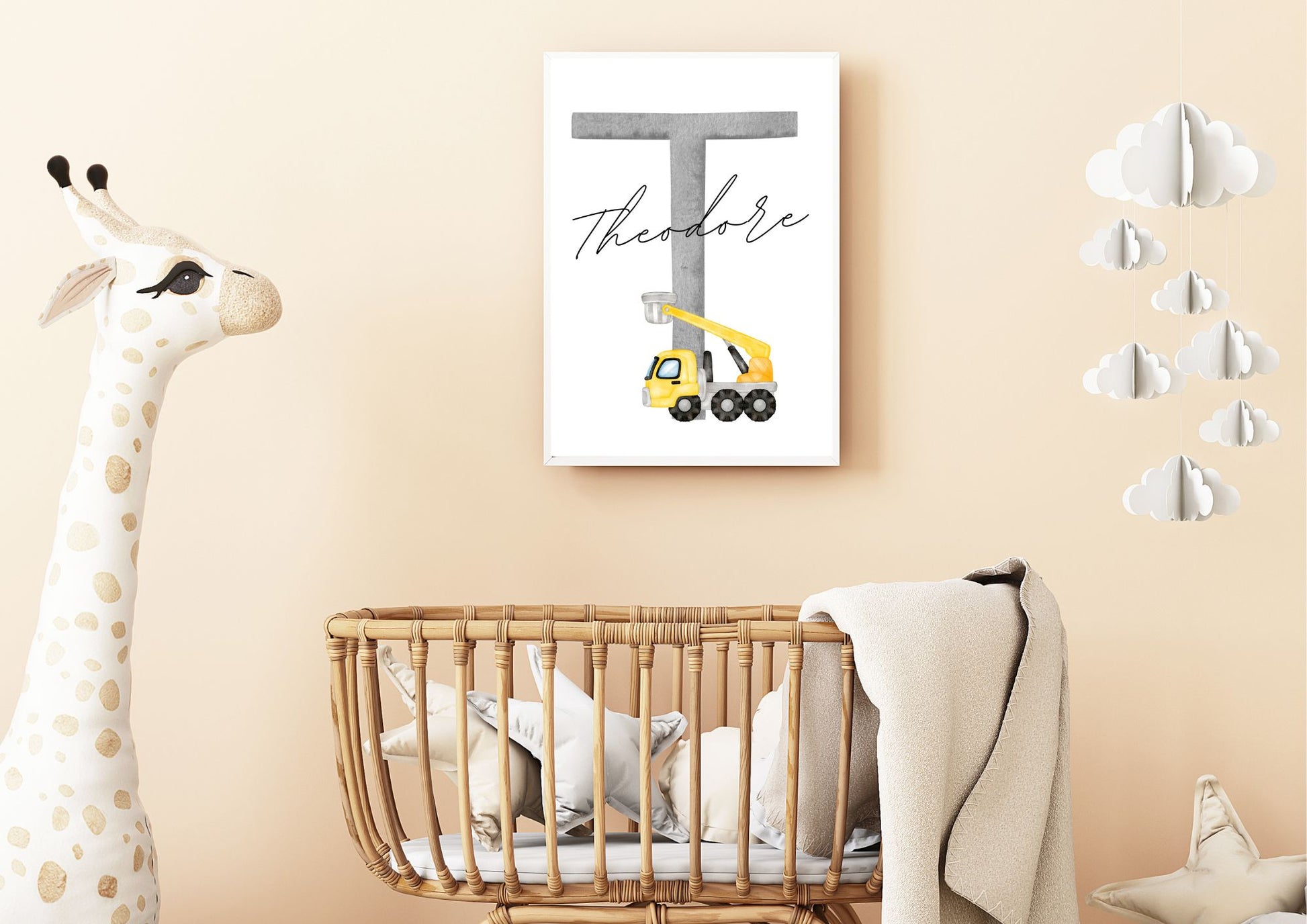 Welcome your little one to a world of wonder with the "Construction Vehicles" themed nursery poster! This whimsical design features your baby's initial adorned with a charming watercolour painted crane.