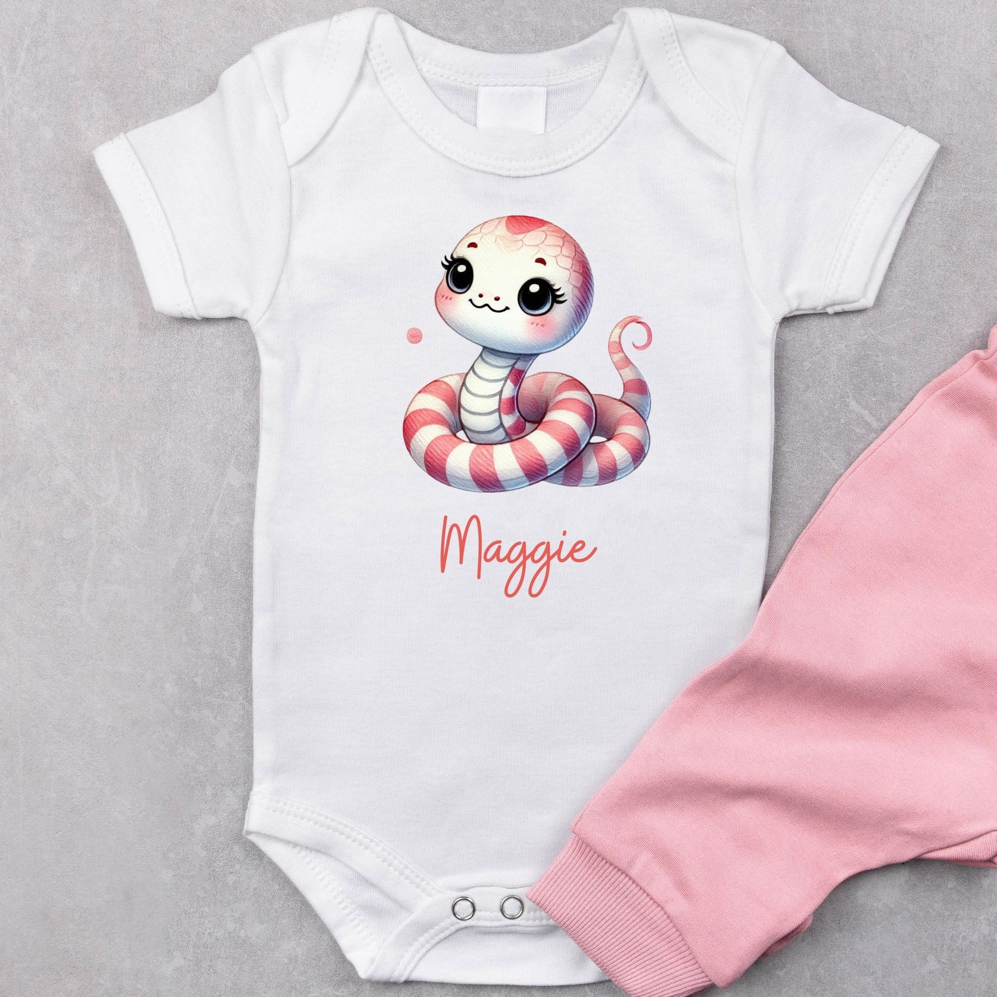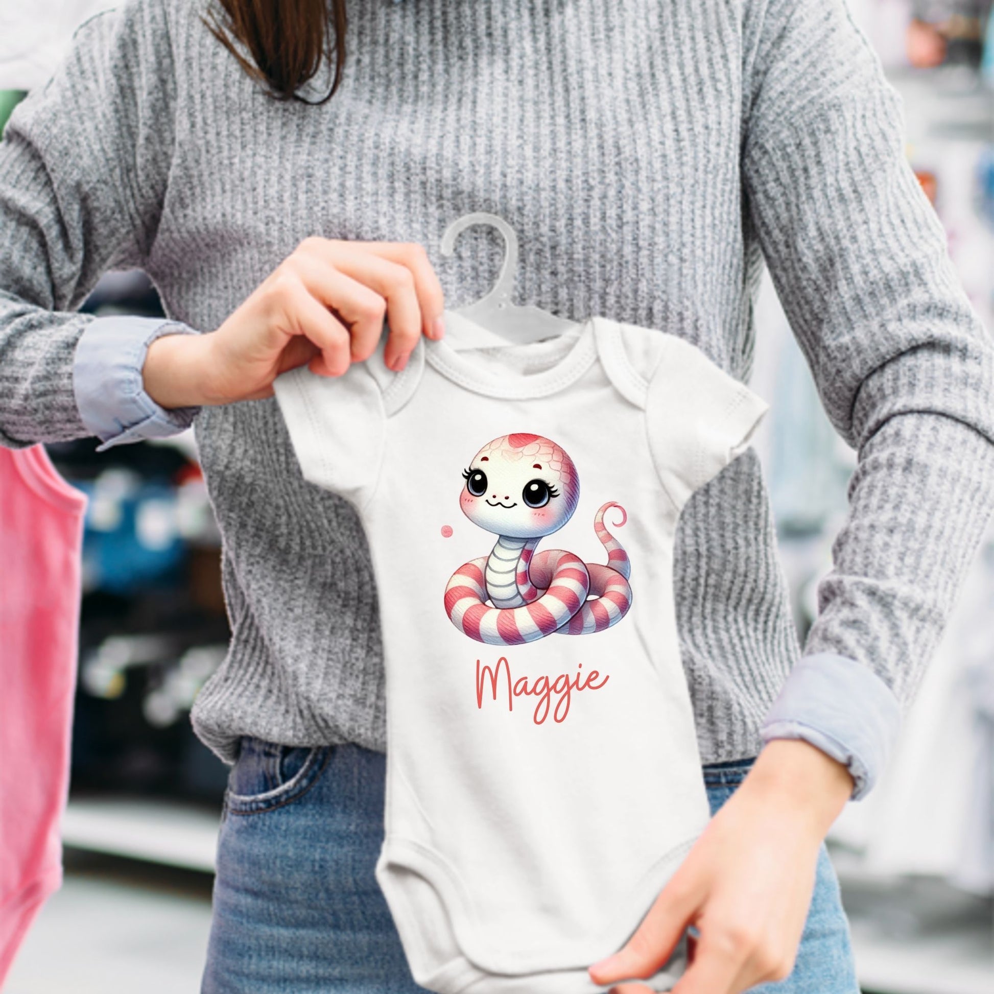 Bring a smile to parents’ faces with this adorable personalized baby romper, designed with a cute snake motif and customizable with your baby’s name.