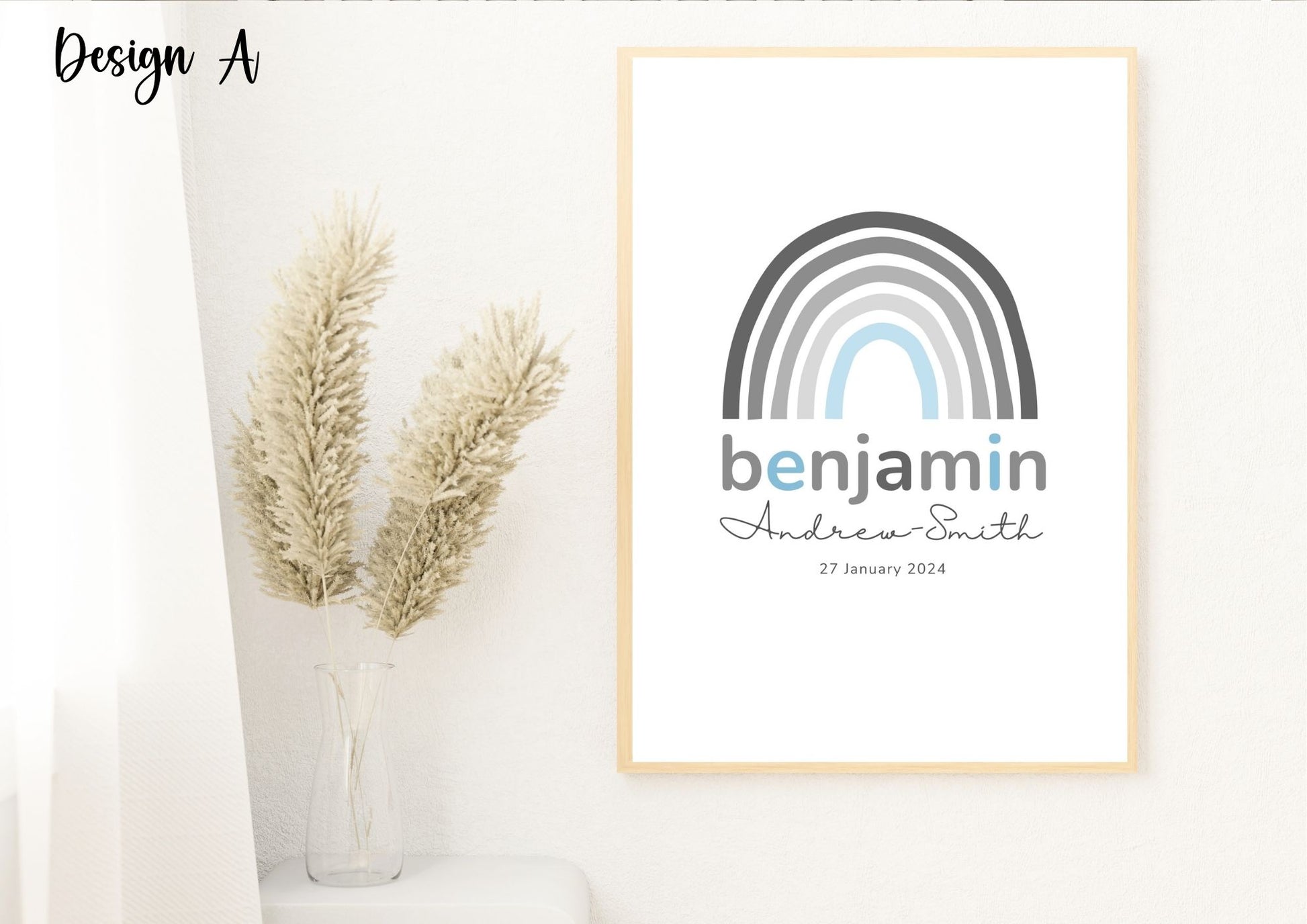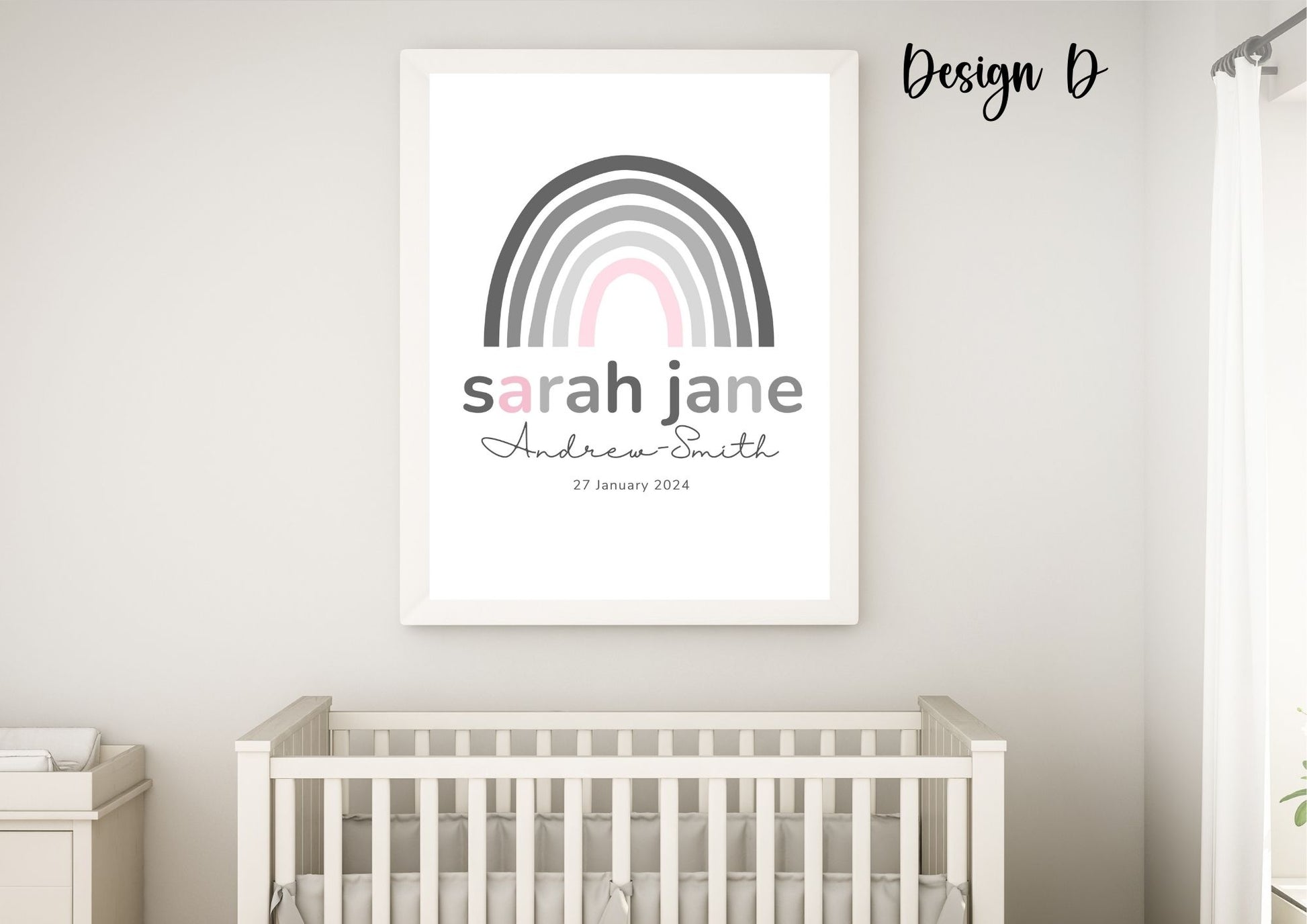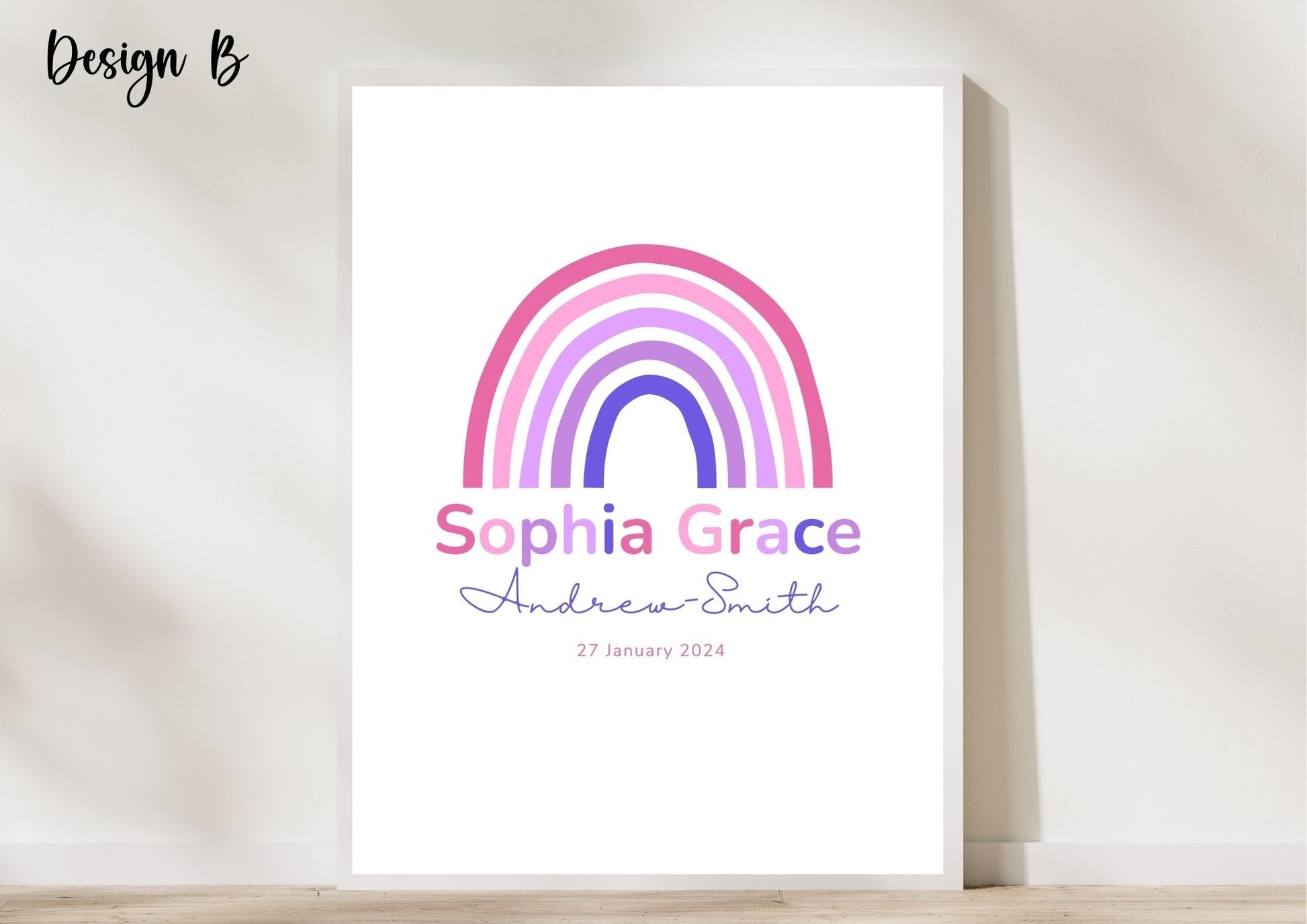 Celebrate your baby's arrival with our Rainbow Nursery Poster. This custom baby name poster beautifully displays your baby's name and birthdate in a charming font, accompanied by a simple yet vibrant rainbow design. Perfect for adding a pop of color and joy to your nursery decor, this personalized poster is a delightful keepsake to cherish for years to come.