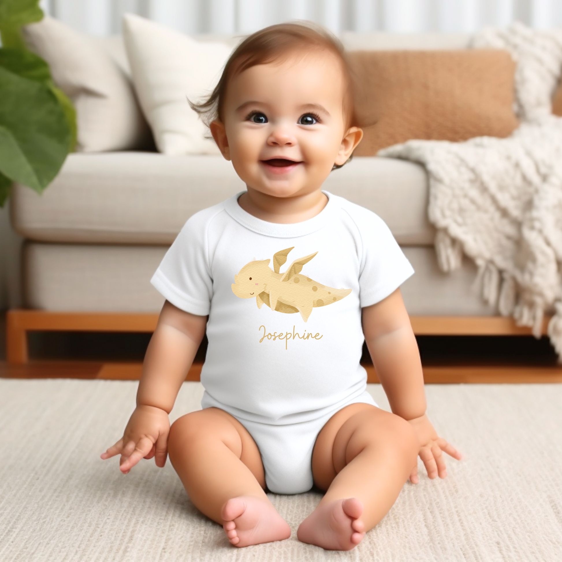 Turn your precious child into a dazzling dragon with our delightful "Golden Dragon" customized onesie! This cozy outfit showcases an enchanting illustration of a golden baby dragon in flight. Its cozy warmth and cheerful expression make it an ideal choice for any infant, particularly those born in the Year of the Dragon.
