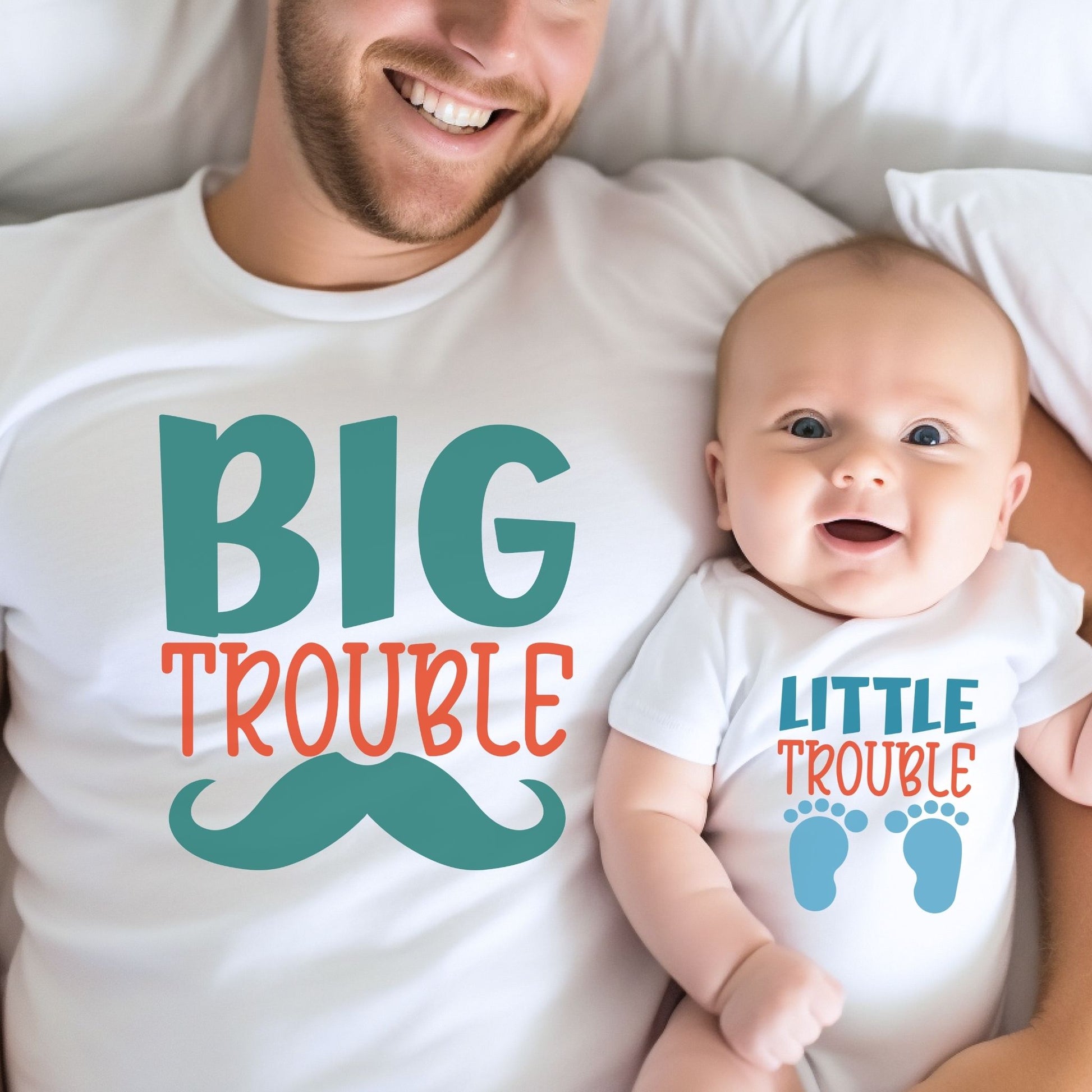 Dads and little ones, get ready for some serious cuteness overload! Introducing our "Big Trouble" & "Little Trouble" T-Shirt and Baby Romper Set. Available in Baby Boy or Girl designs!