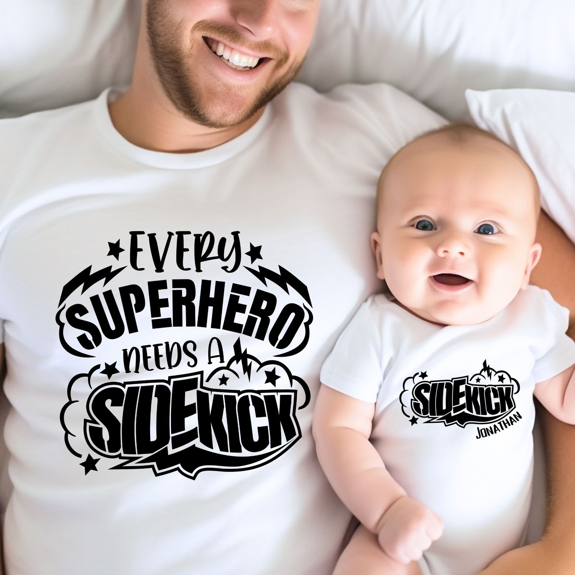 Celebrate the special bond between father and child with our personalized "Every Superhero Needs a Sidekick" matching outfit set. Order yours today and create unforgettable memories with your favorite sidekick.