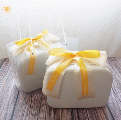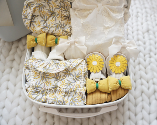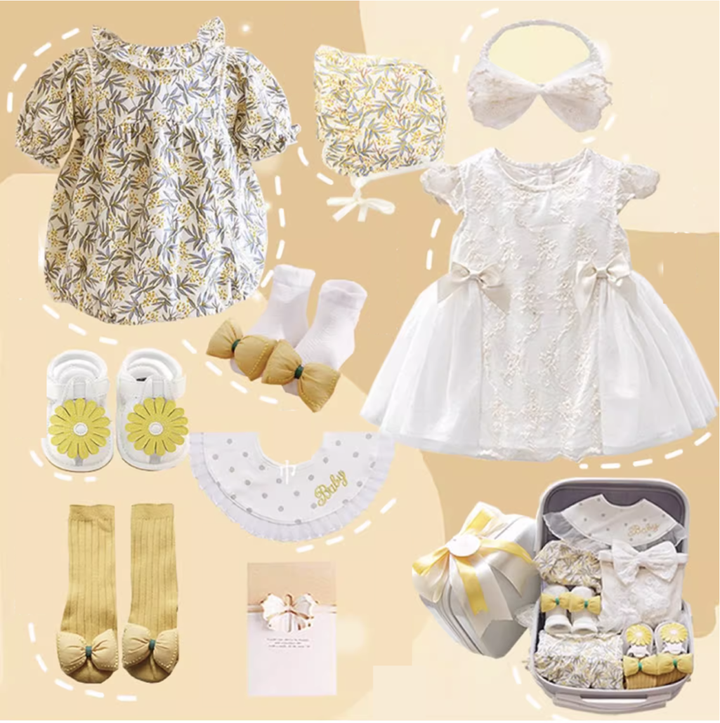 Celebrate your precious newborn girl's arrival in style with this Gorgeous Yellow Baby Girl Gift Set! This exquisite 8-piece collection, presented in a charming white mini luggage bag, offers a curated selection of elegant essentials for your little princess.