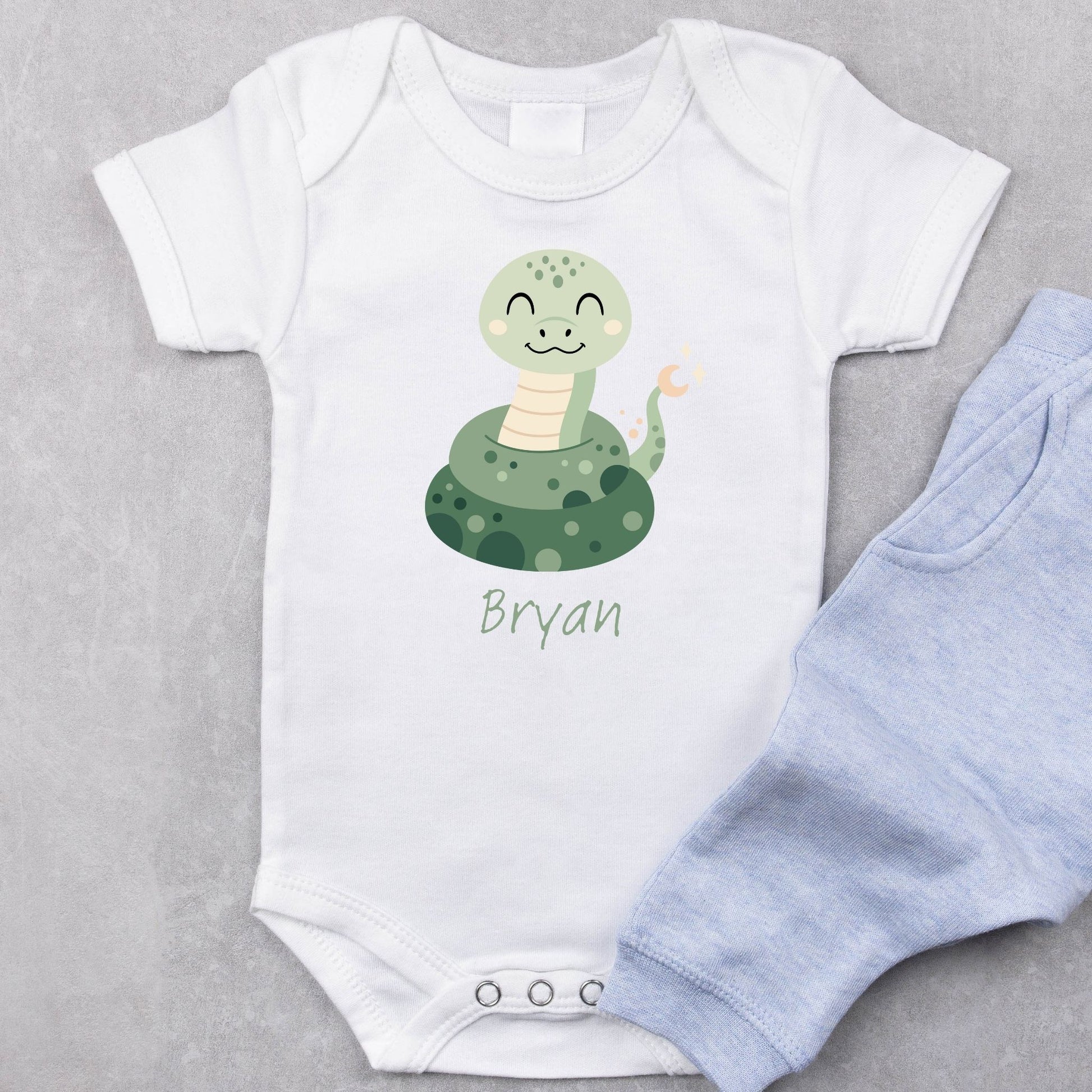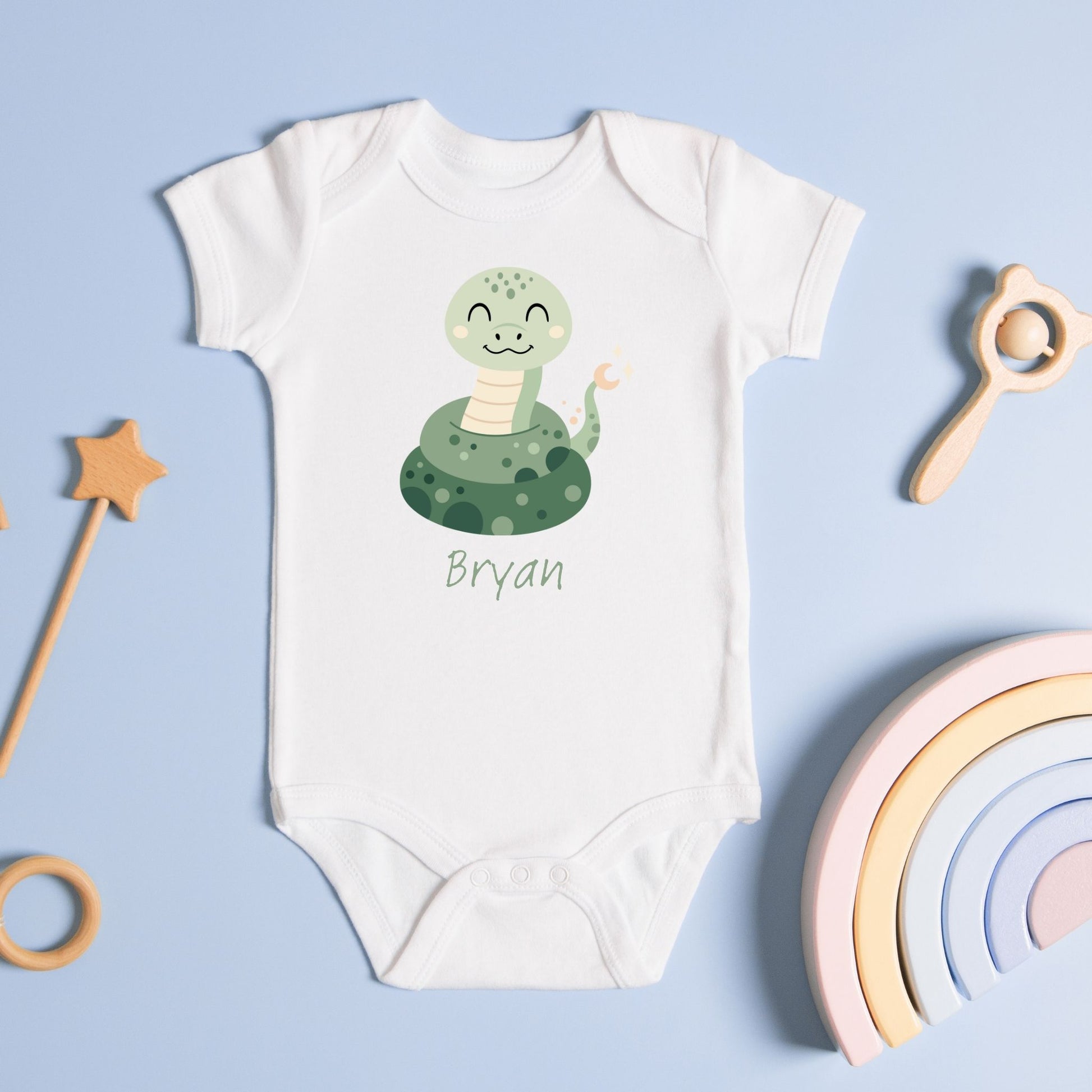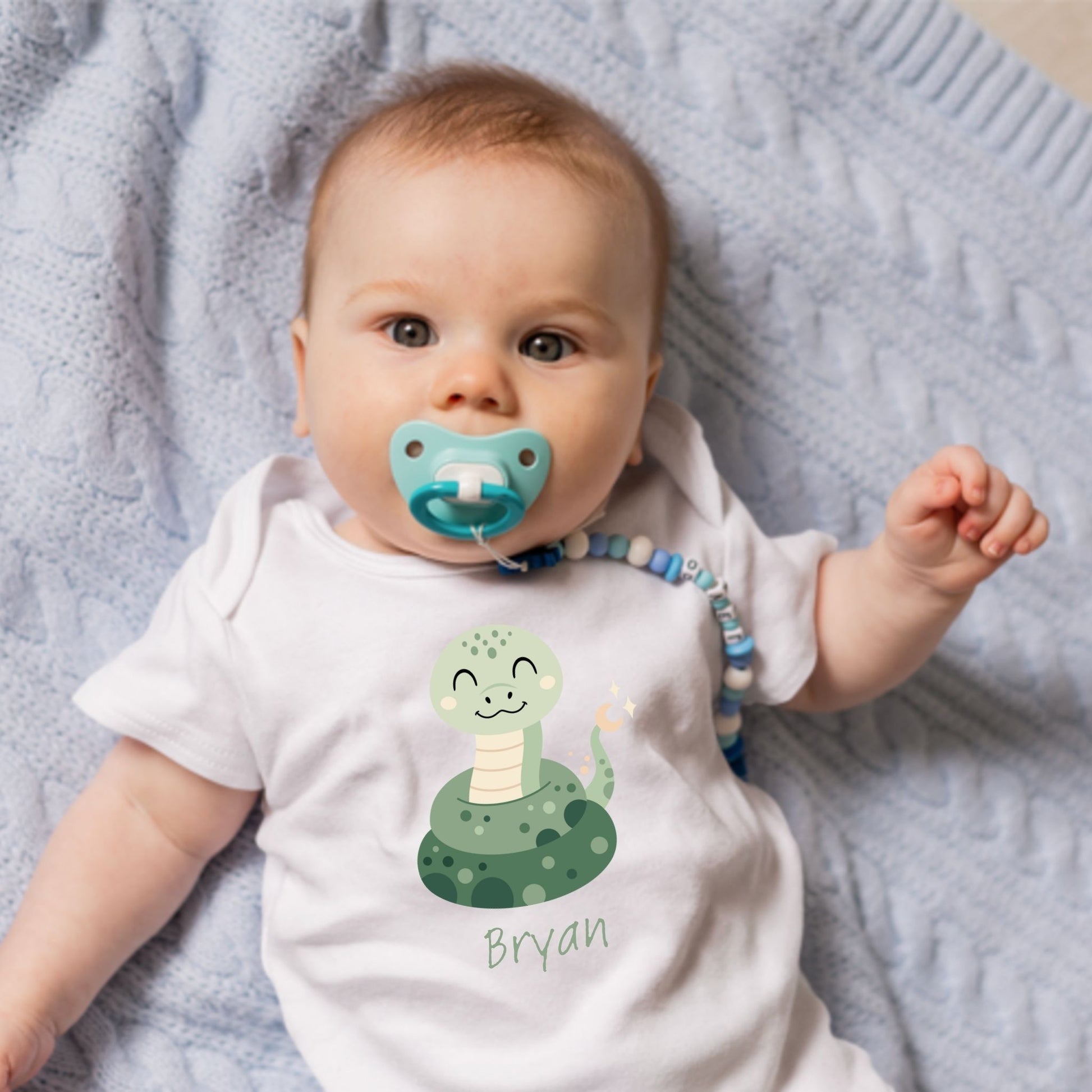 Celebrate the arrival of an adorable baby with this Snake onesie. Made from soft, breathable fabric, this white onesie features a charming snake illustration that embodies both cuteness and playfulness. The design is not only eye-catching but also holds special significance for babies born in the Year of the Snake, making it a thoughtful addition to their wardrobe. The personalized touch of the baby's name printed below the adorable snake adds a unique flair that every parent will love.