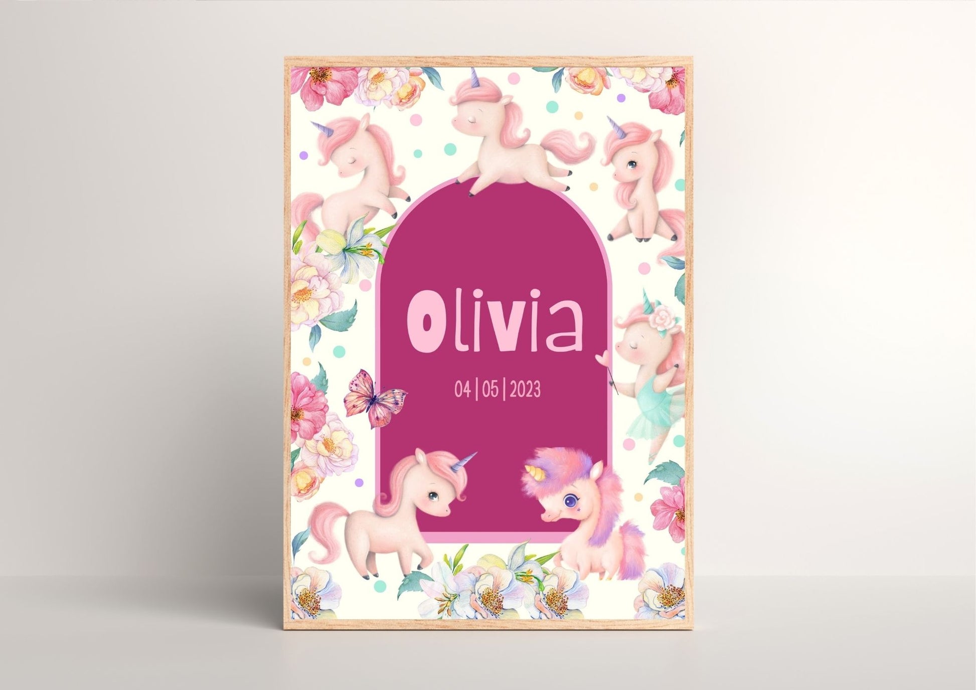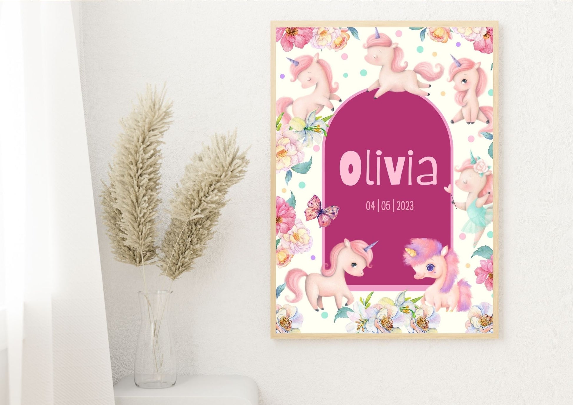 Transform your baby's nursery into a magical wonderland with our Unicorn Name and Birthdate Poster. This enchanting custom poster features your little one's name in a charming font, surrounded by playful unicorns, colorful flowers, and fluttering butterflies. Add a touch of whimsy and sweetness to their space while commemorating their special day with the addition of their birthdate. Perfect for unicorn lovers and those who adore all things magical, this personalized poster is a delightful addition to any nursery decor.