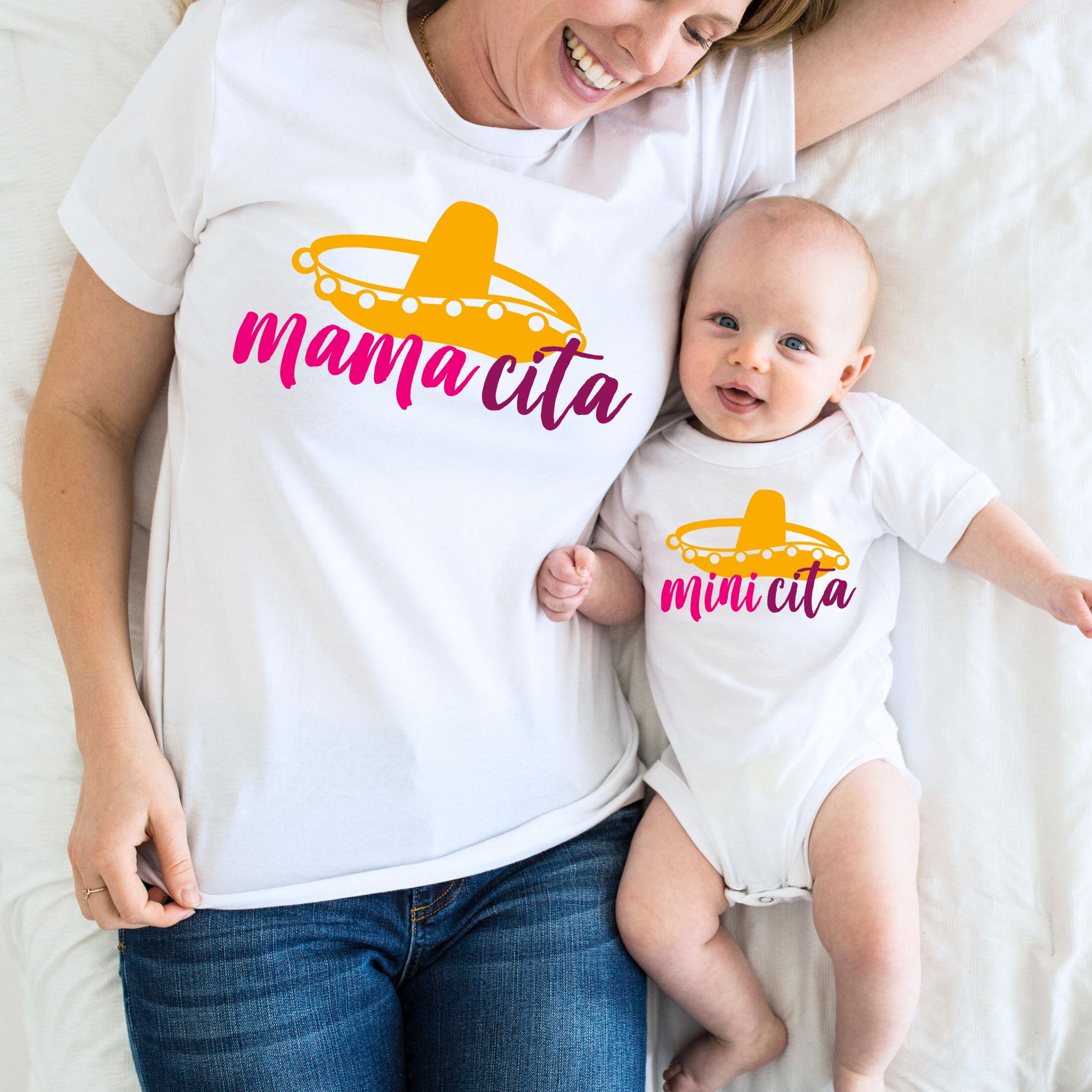 ¡Hola, mamis y bebés! Get ready to turn heads with our adorable "Mamacita" and "Minicita" matching set! This white tee and onesie combo is made from super-soft cotton and features a sassy, playful print that celebrates your Latina roots. You and your little one will be the cutest duo in town!