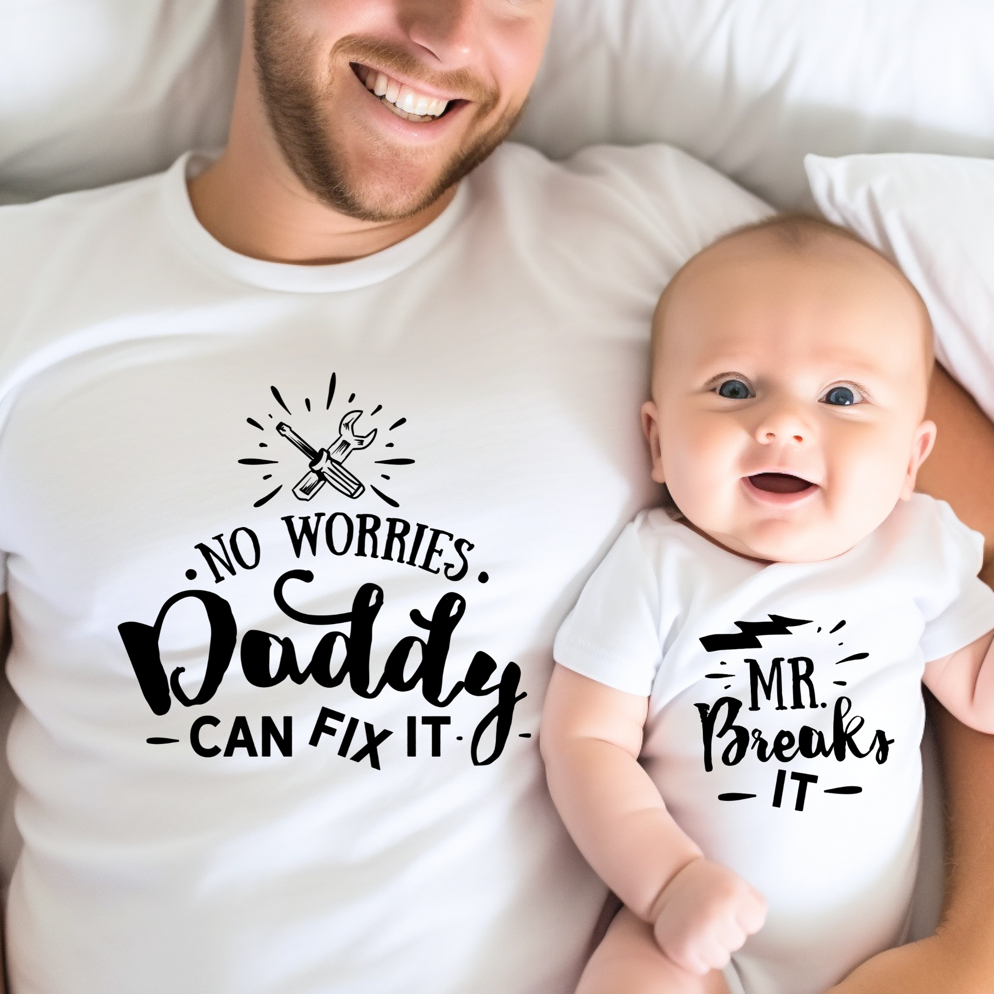 Celebrate the unbreakable bond between dad and baby with our charming 'Mr. Breaks It' and 'No Worries Daddy Will Fix It' matching outfit set. This heartwarming duo shows the world that dad will always be there, ready to tackle any challenge with love and a smile. Wear it with pride and capture those precious moments! πͺπ οΈπ¨βπ¦π