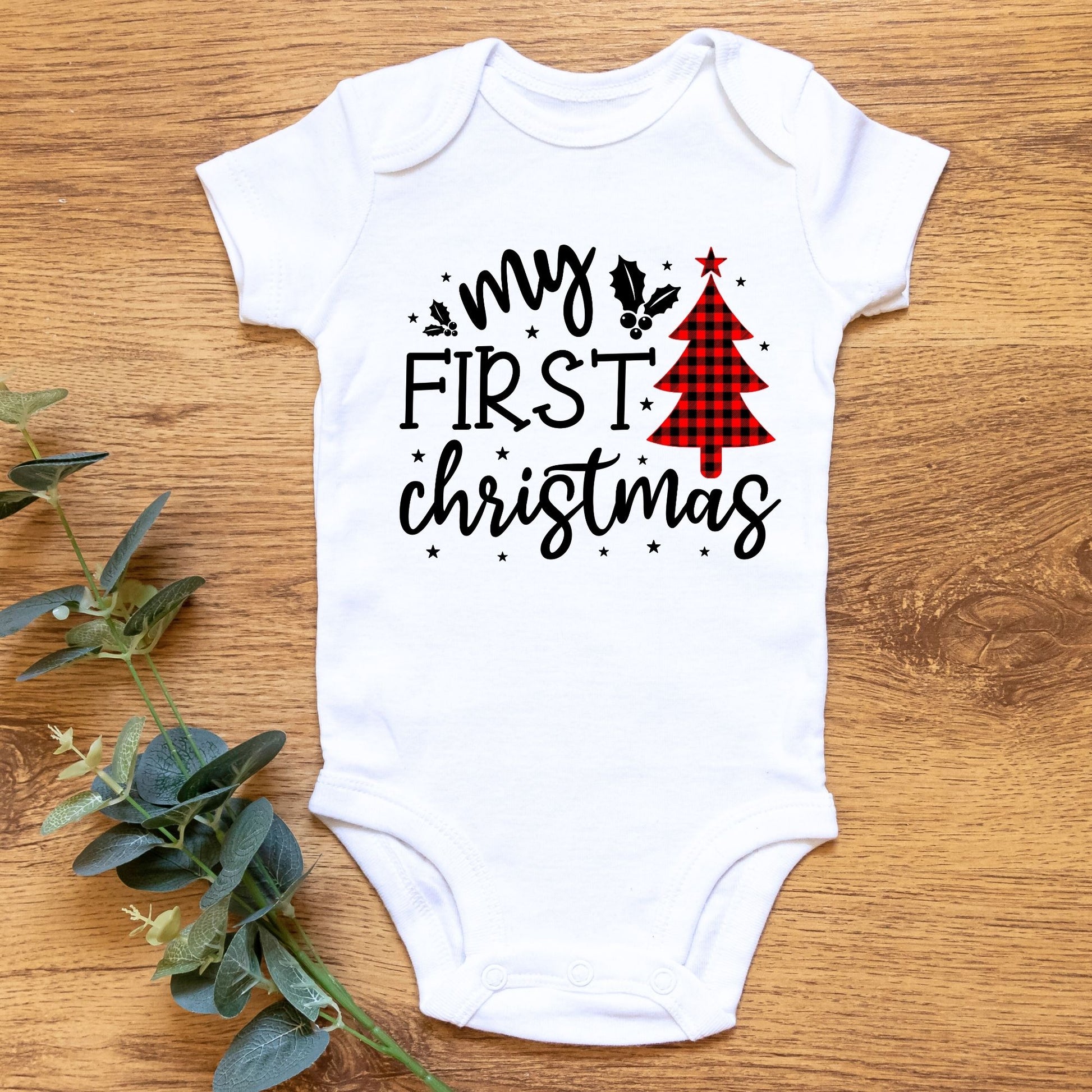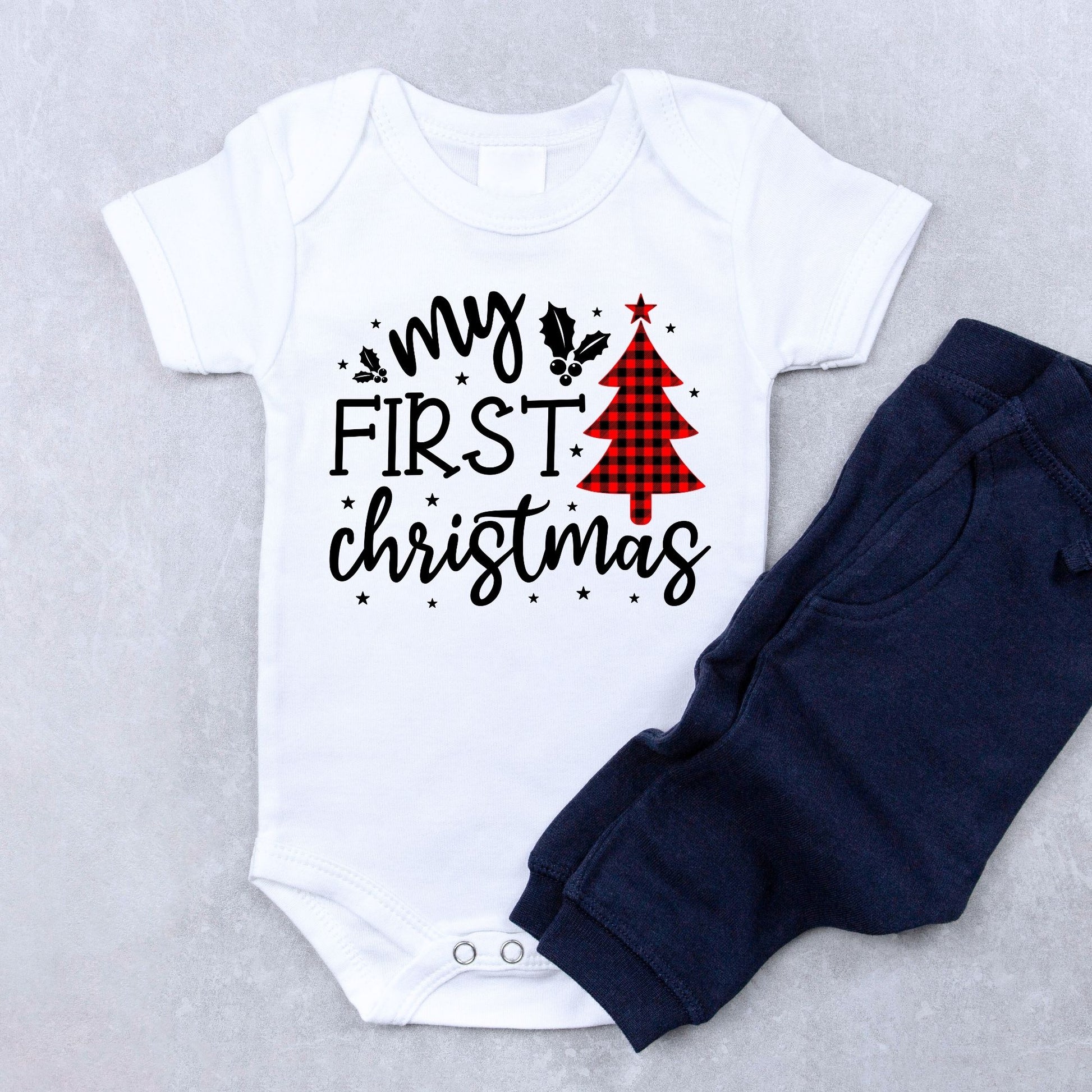 - Chic Checked Design: The charming "My First Christmas" text paired with a trendy red and black checked Christmas tree adds a modern twist to traditional holiday attire, making it a must-have for your baby’s wardrobe!