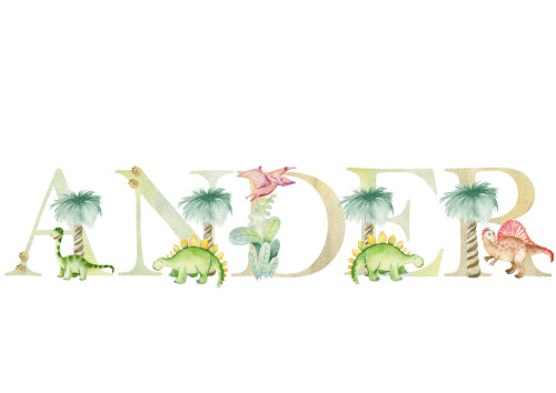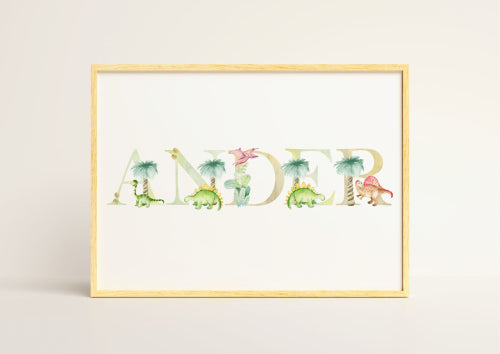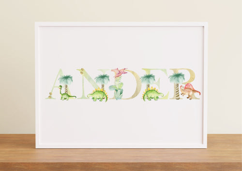 Calling all little paleontologists! This adorable prehistoric-themed poster is perfect for your budding dinosaur enthusiast. Watch their name come to life amongst a playful scene of baby dinosaurs frolicking and exploring their prehistoric world.