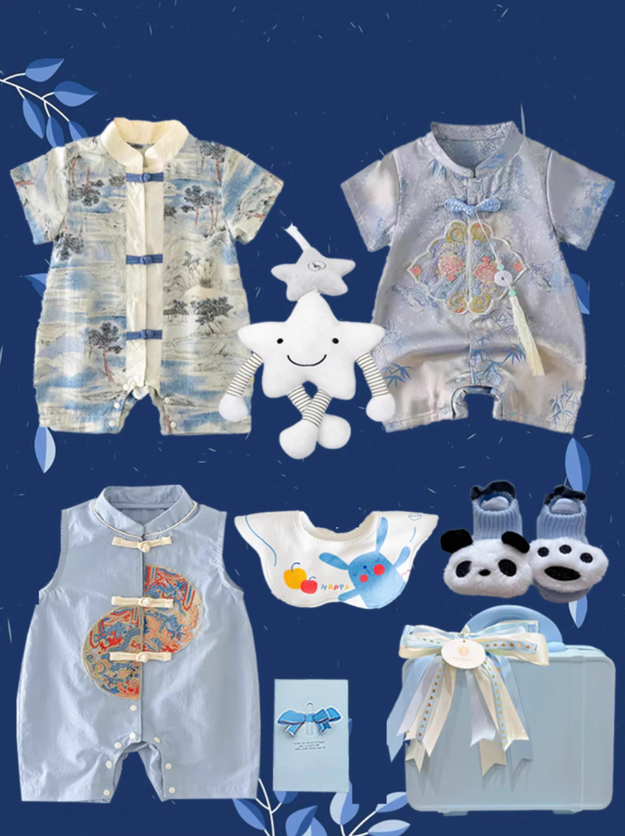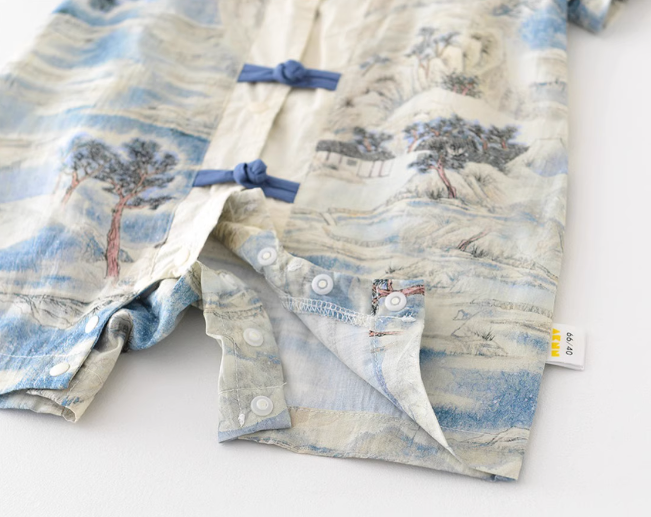 Inspired by classic tradition, this set blends the sophistication of Mandarin collars with a handsome, blue-toned print featuring stately Oriental motifs (such as auspicious clouds or knots), lending a touch of refined elegance to your baby boy's wardrobe.