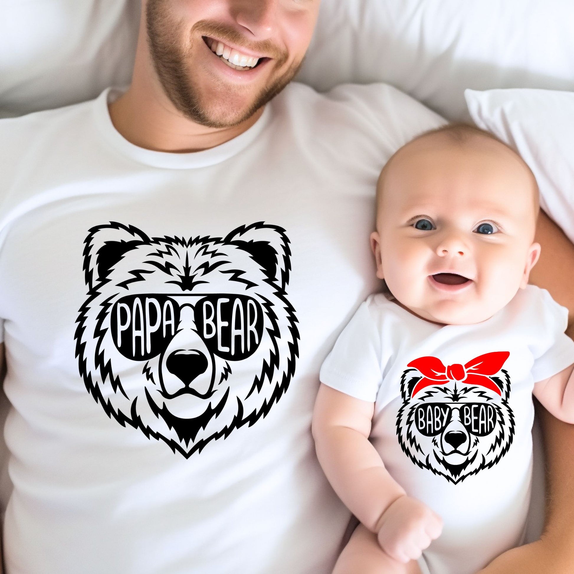 - Baby's Romper: Complements Dad's with a sweet "Baby Bear" text printed on a charming bear face design, highlighting their playful connection.