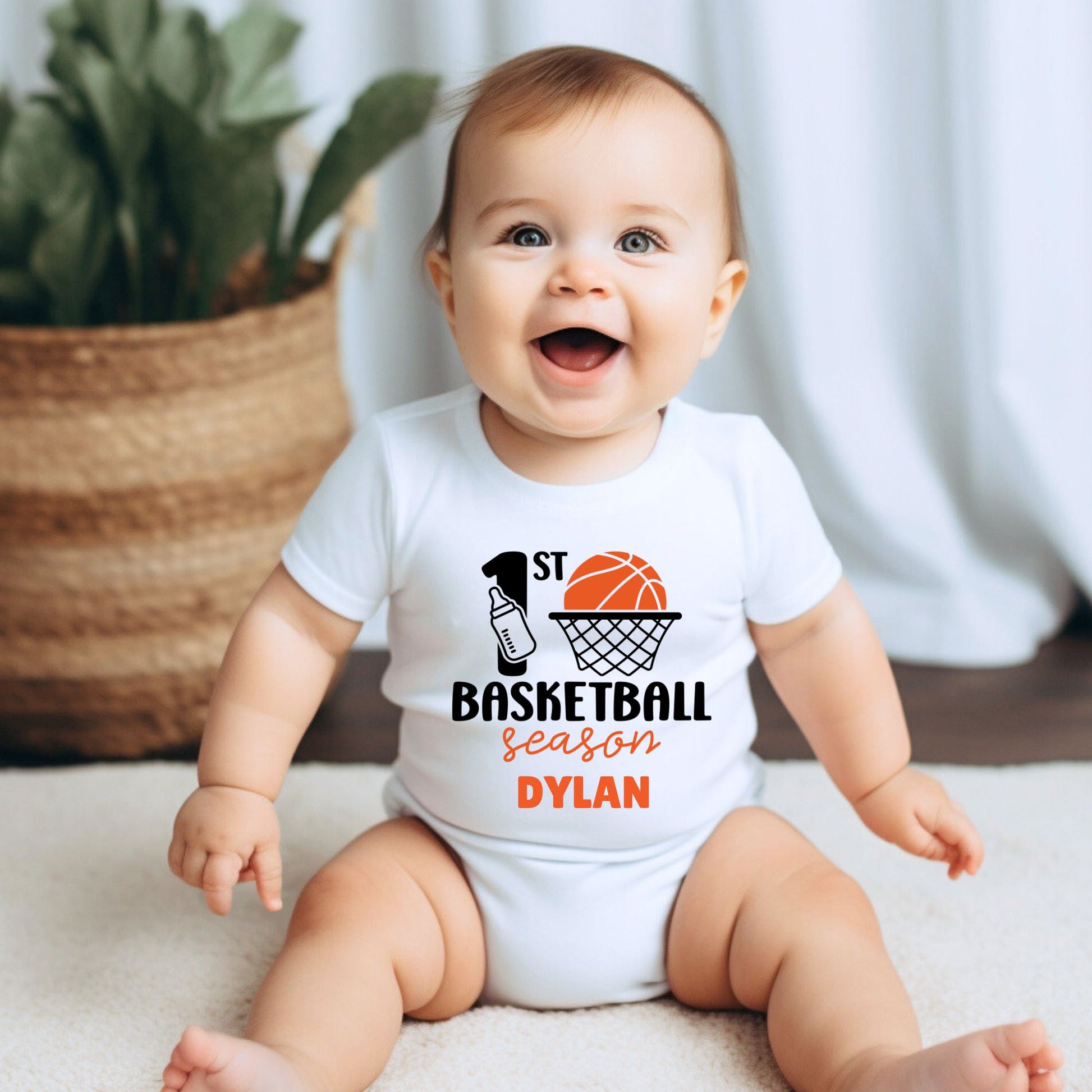 Celebrate your baby's debut on the court with our Personalized "1st Basketball Season" Baby Romper! Perfect for playtime, family gatherings, and game days, this sporty romper features "1st Basketball Season" boldly printed with your baby's name displayed below. Designed for comfort and style, it's the ideal outfit for your little athlete's first season.