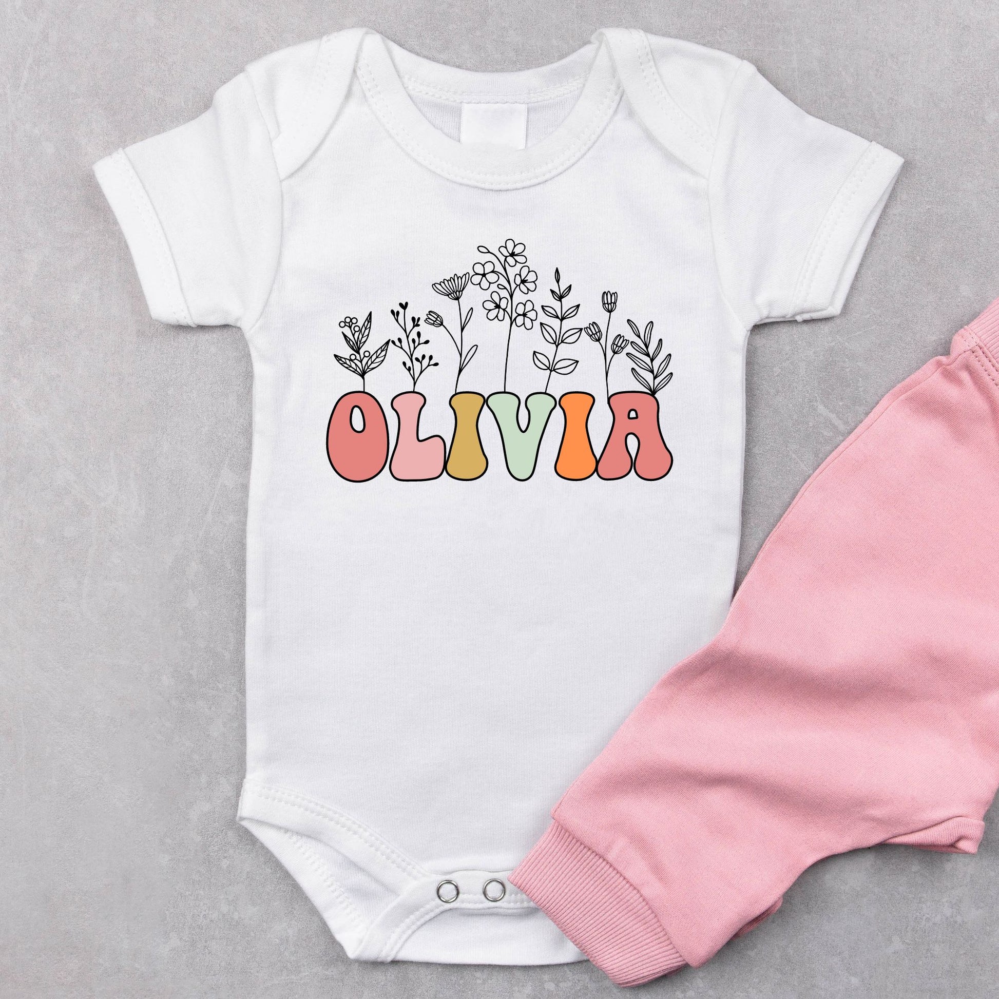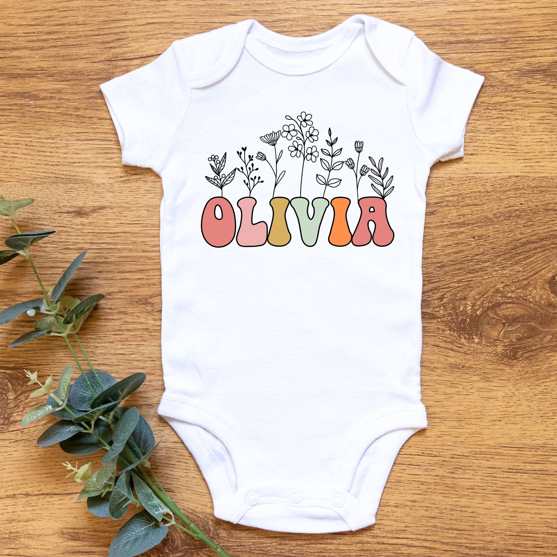 Add a touch of floral magic to your baby's wardrobe with this adorable romper or tee shirt. Order now and let your baby's name bloom in style!