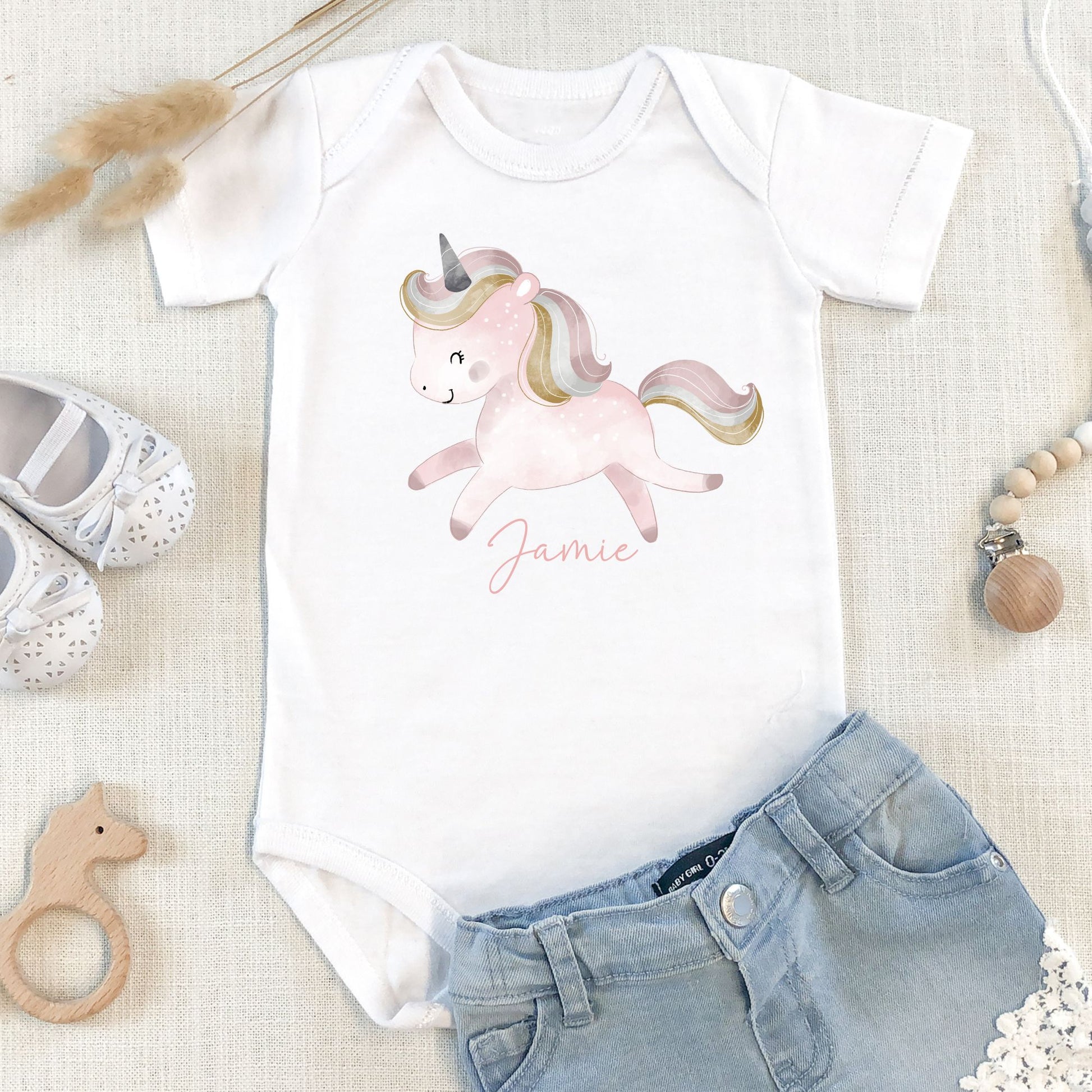 - Print: Adorable unicorn and rainbow design with personalized name