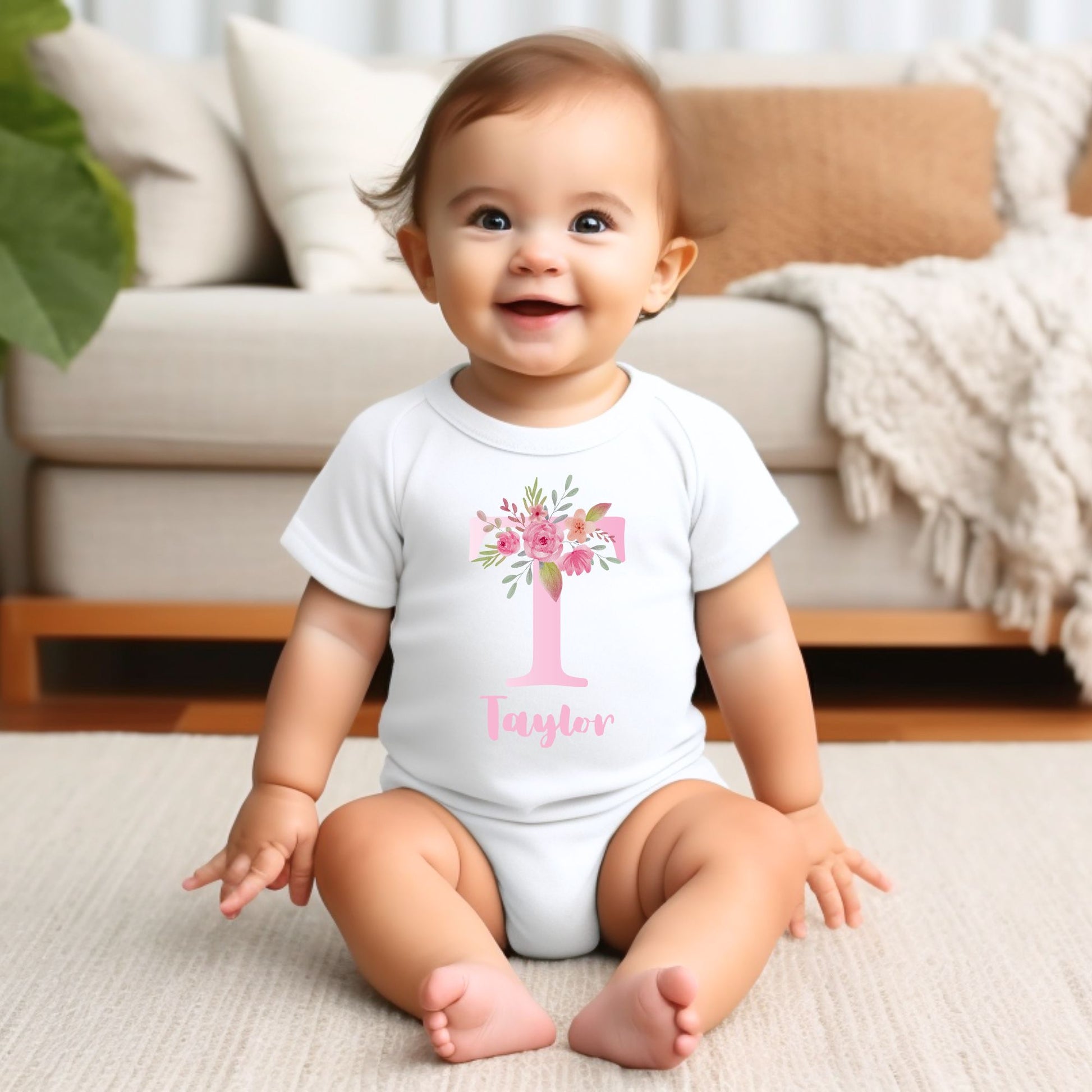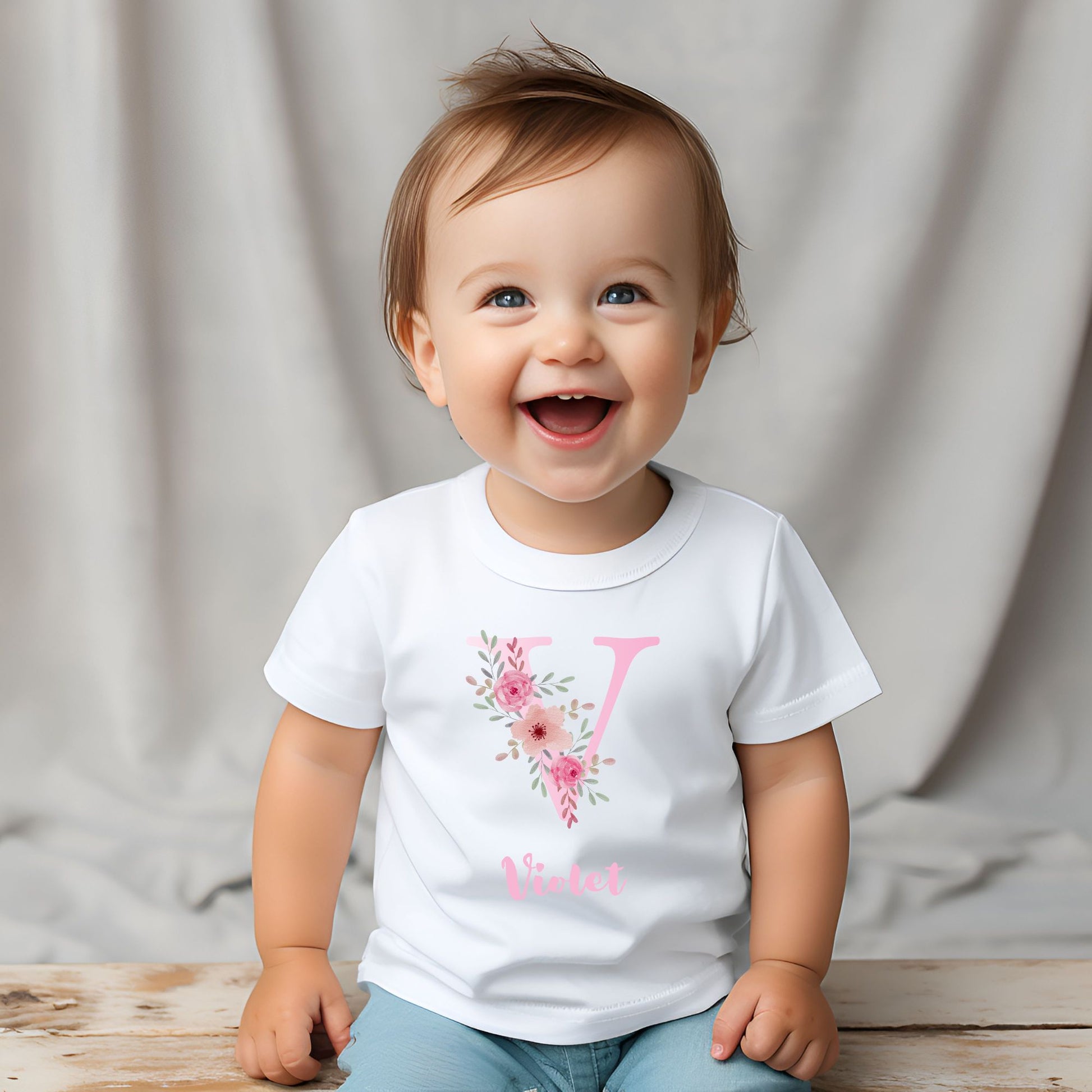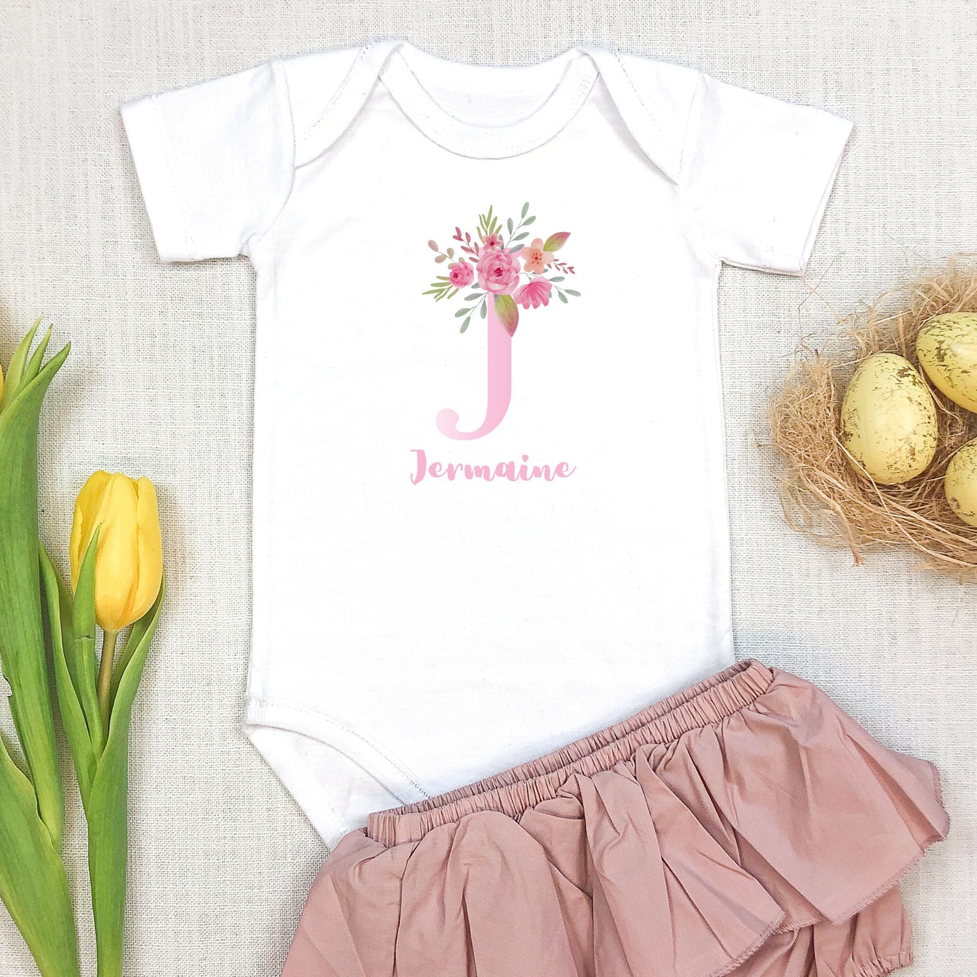 Order now and let your baby's name and personality shine in our "Floral Initial Name" romper or tee shirt. Perfect for any day!