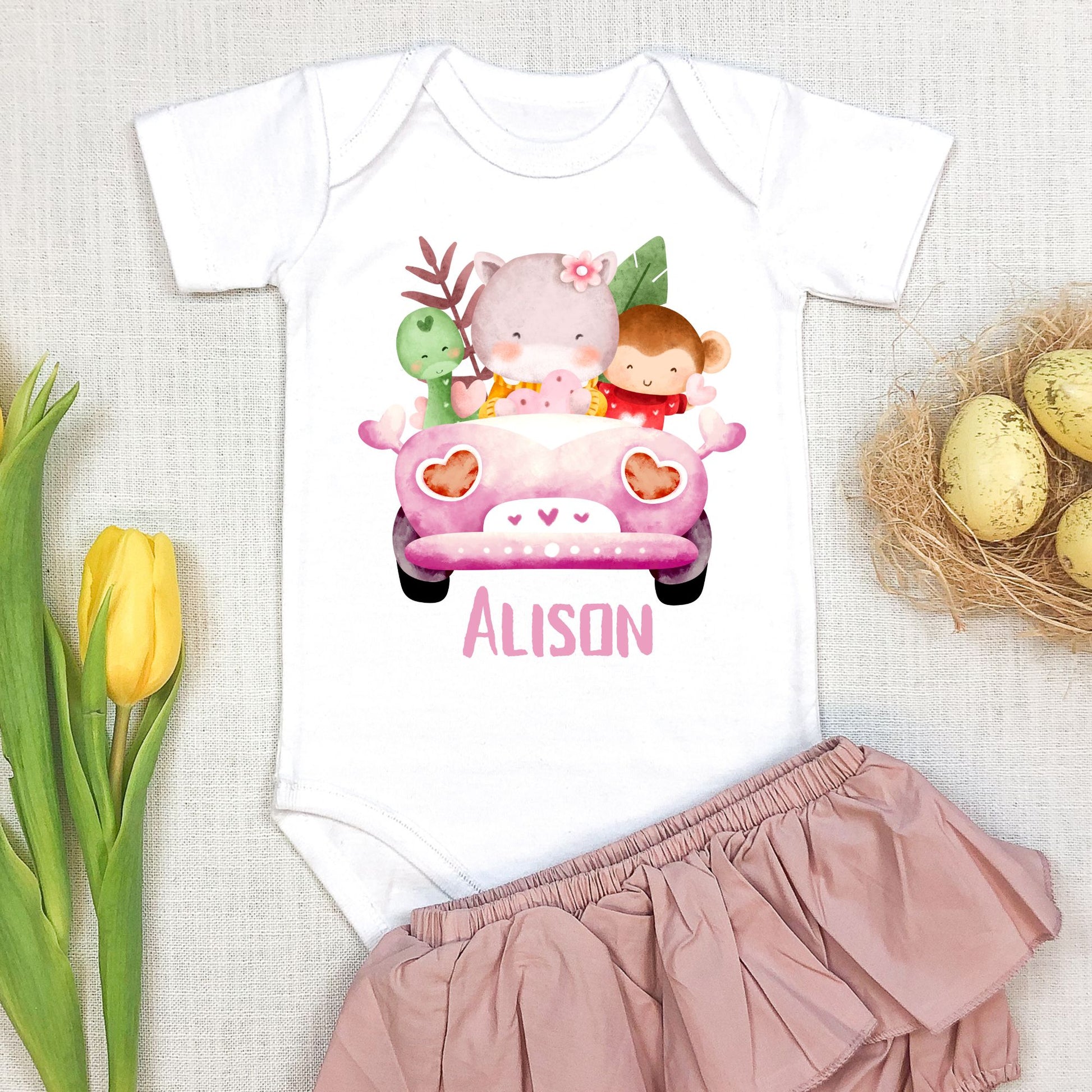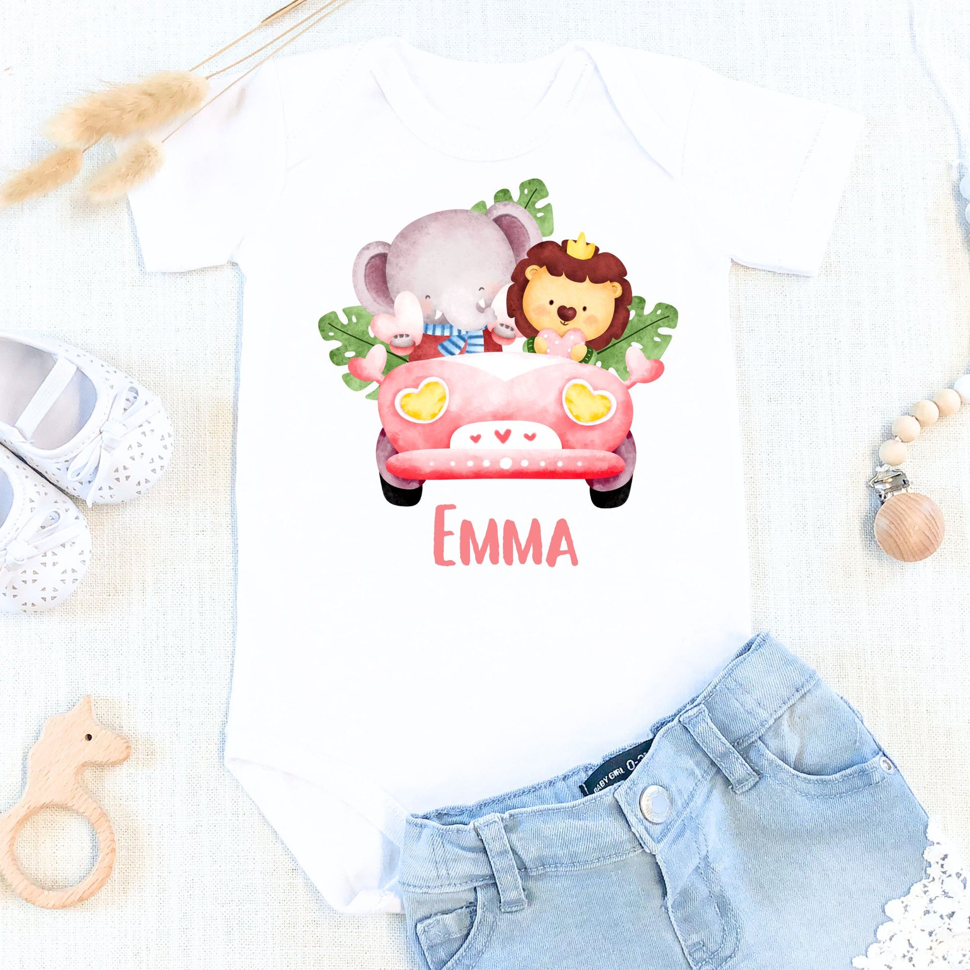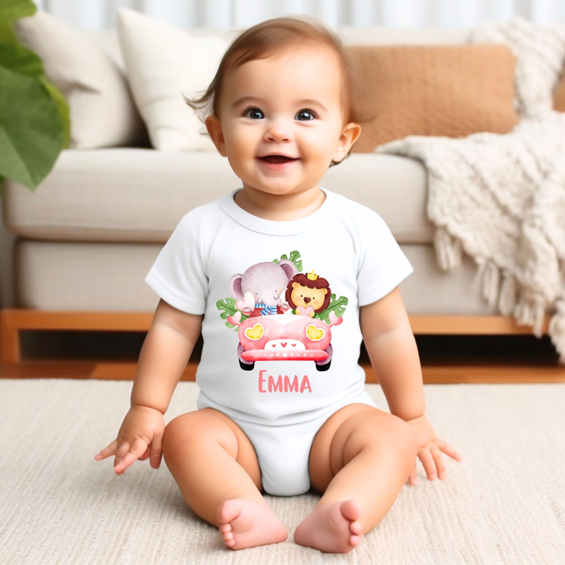 Set off on a delightful journey with our Custom Safari Friends Road Trip Baby Romper! Featuring an adorable design of friendly safari animals in a cute car, this romper is perfect for little adventurers with a love for the wild. Personalized with your baby's name, it makes for a unique and charming outfit that's perfect for everyday wear, special occasions, and capturing magical moments in photos.