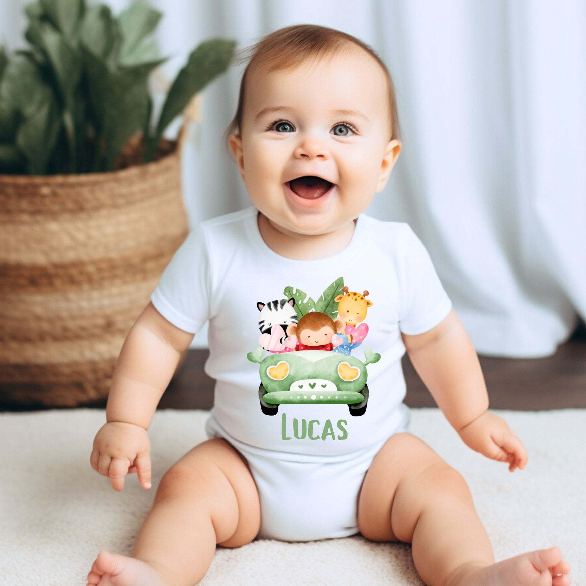 Let your baby embark on a safari road trip in style with this personalized romper. Order now and make their wardrobe a bit more adventurous and fun!