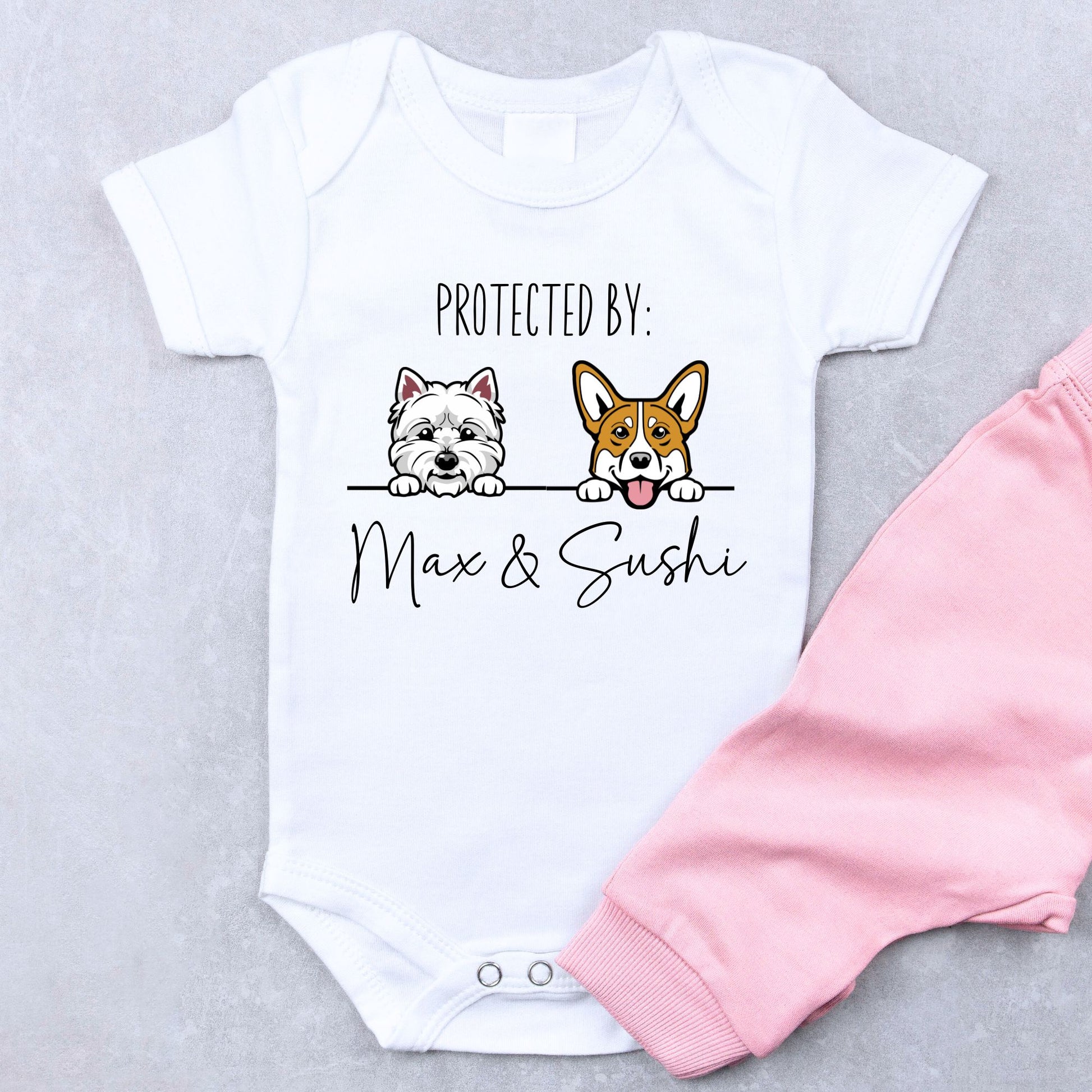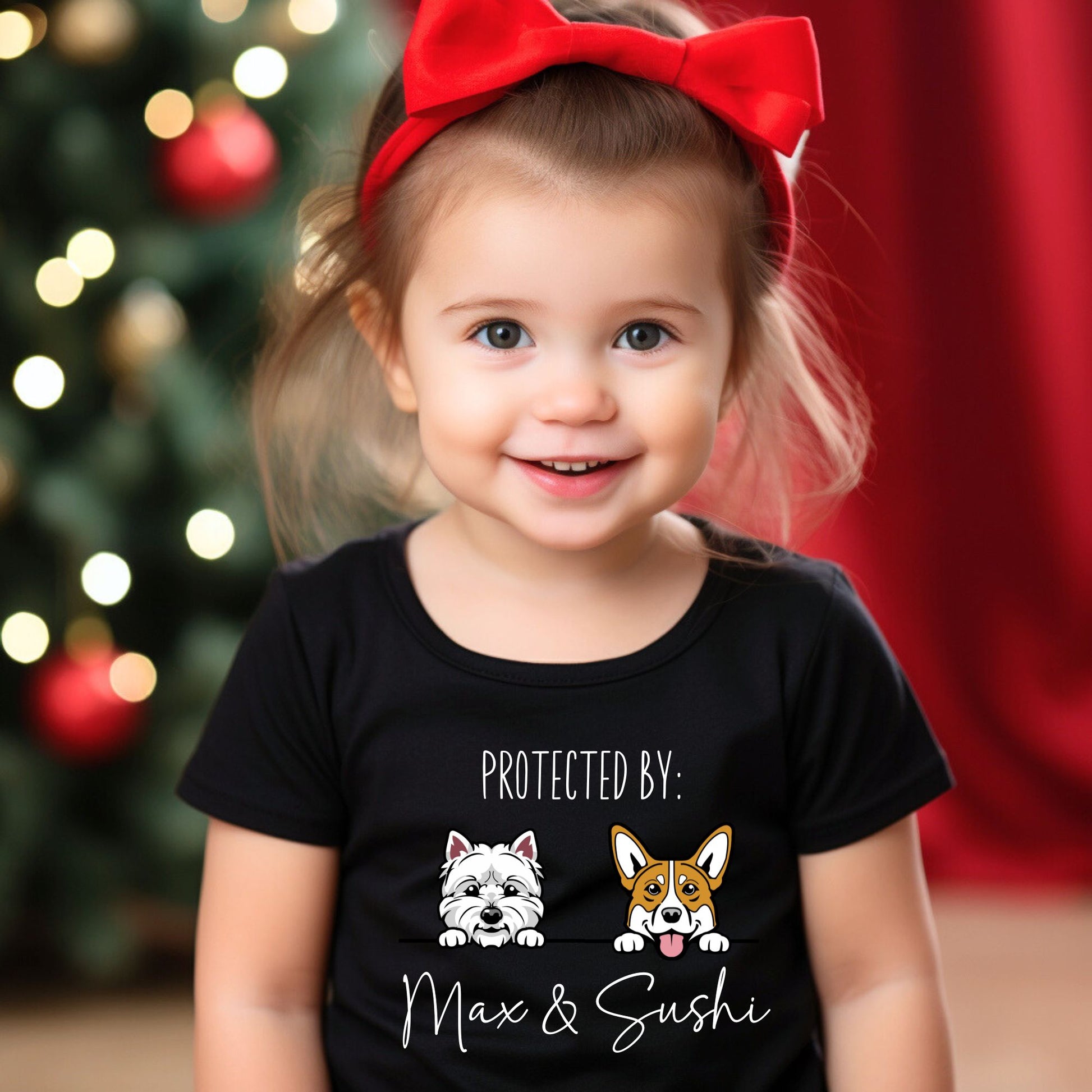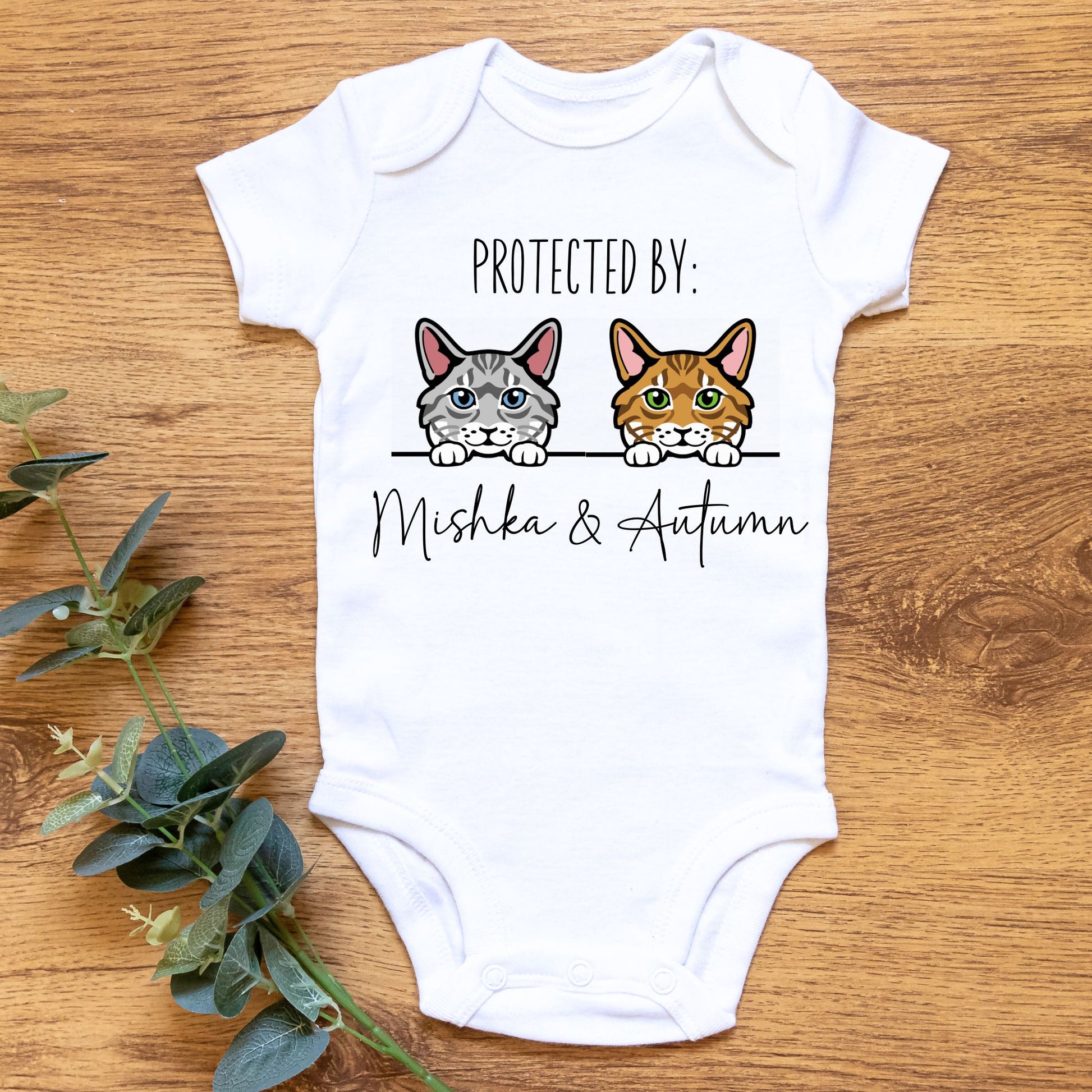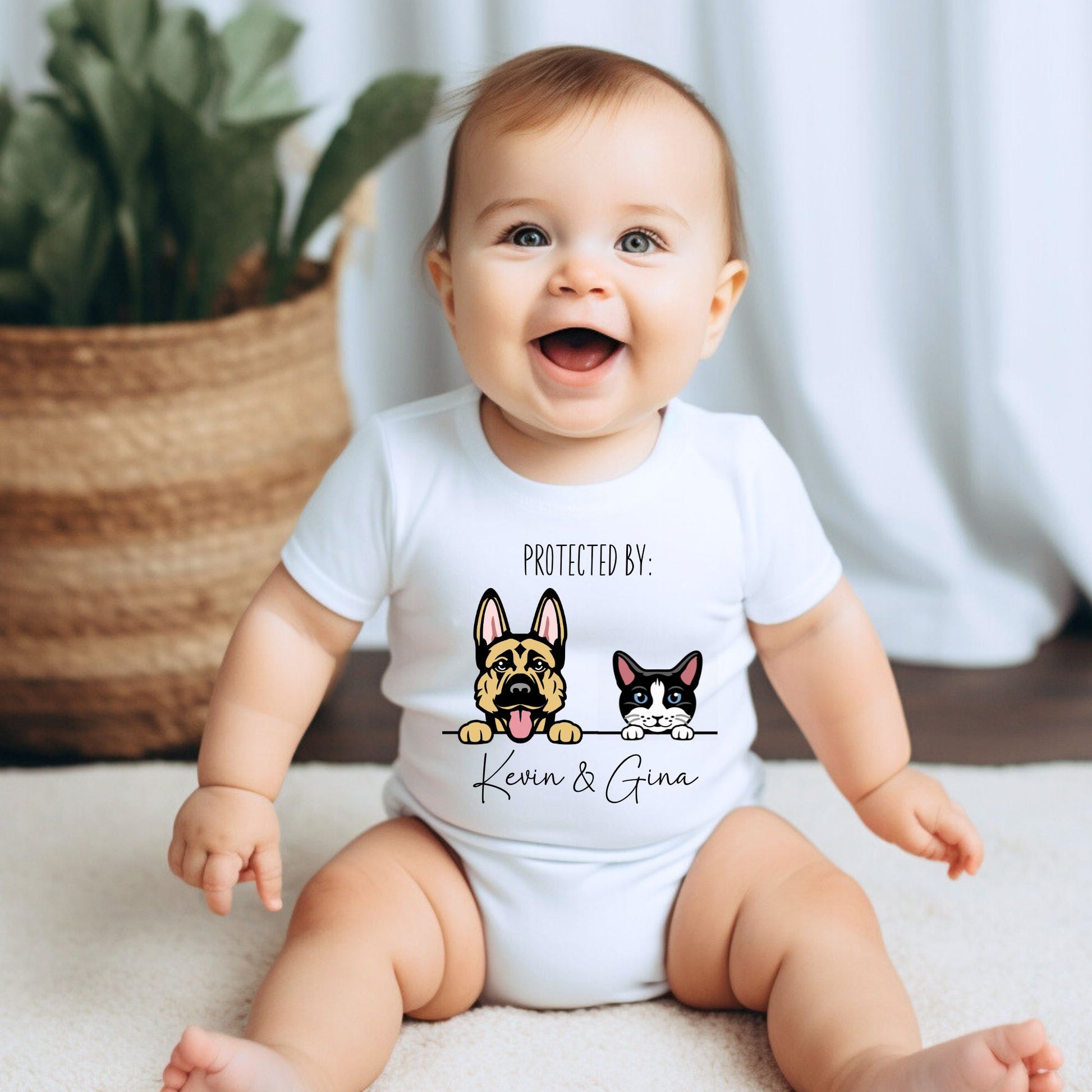 Wrap your baby in the love of their furry friends with our Personalized 'Furry Friends Protection' Baby Romper / Tee Shirt. With cute peeking cat and dog designs personalized with your pet's names, this outfit is a delightful choice for any pet-loving family.