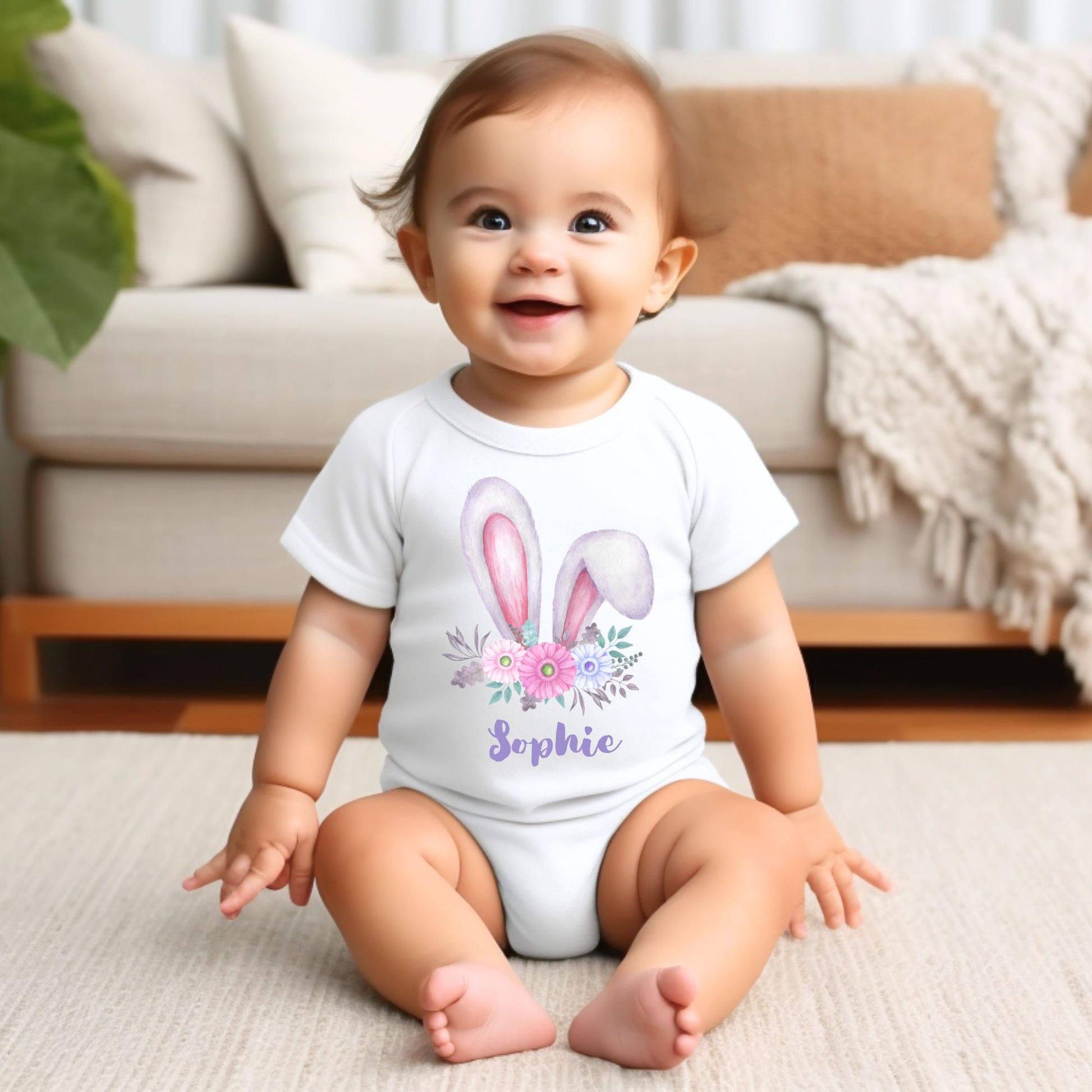 Celebrate your baby’s gentle nature with our Personalized "Gentle Floral Charm" Bunny Baby Romper. Featuring a delightful bunny ears and floral design with your baby’s name, this romper is perfect for everyday wear and special occasions.