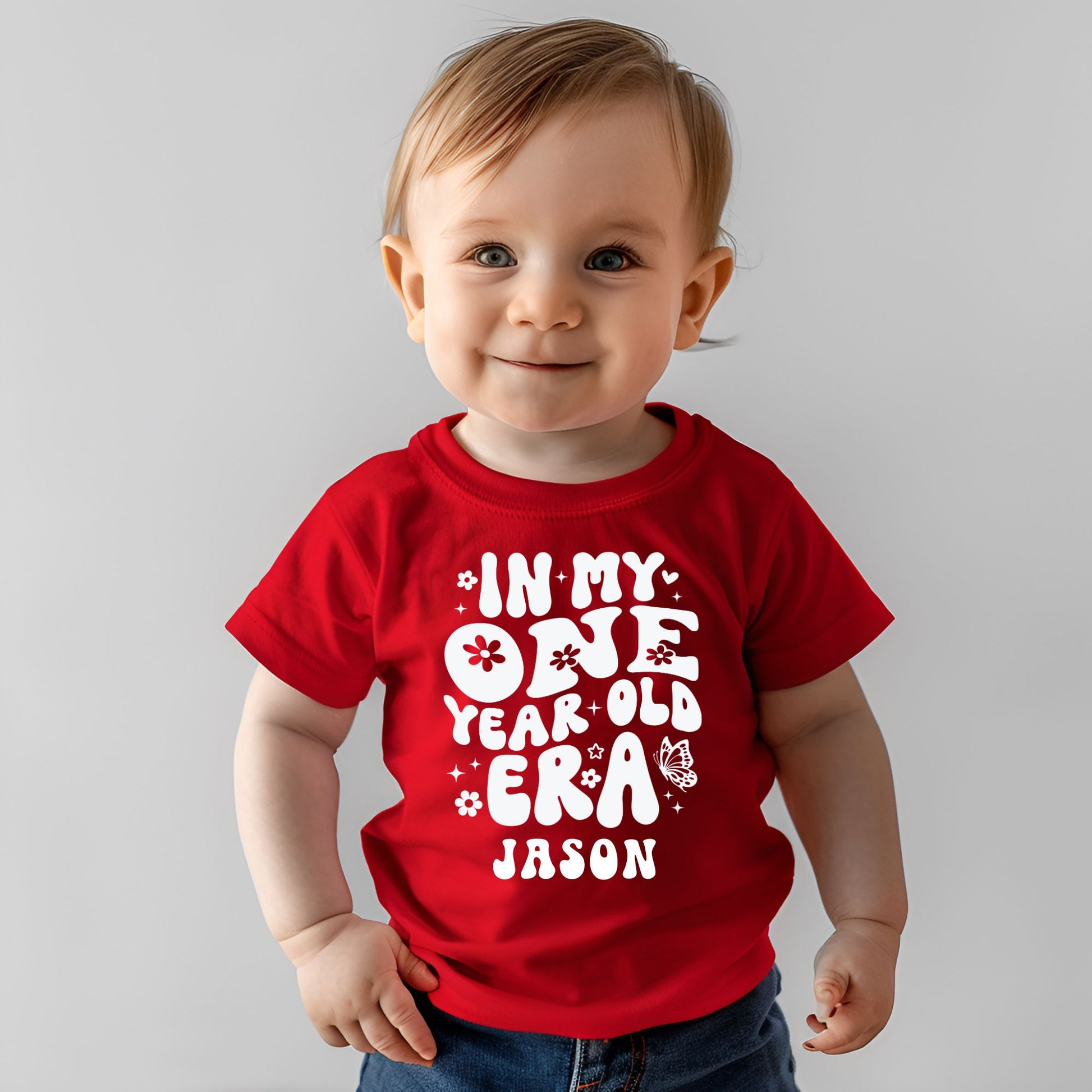 - Design: 'In My One Year Old Era' in colorful fonts with custom name.