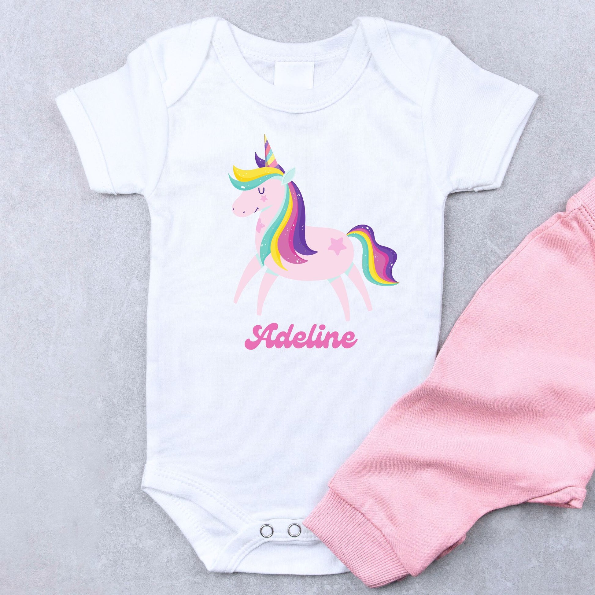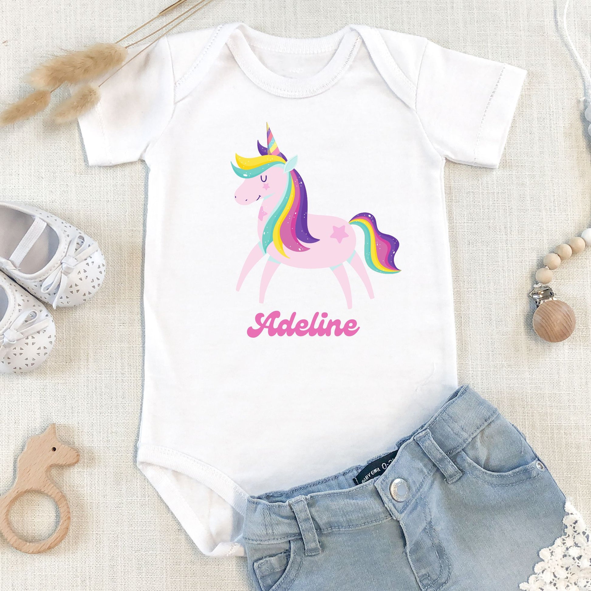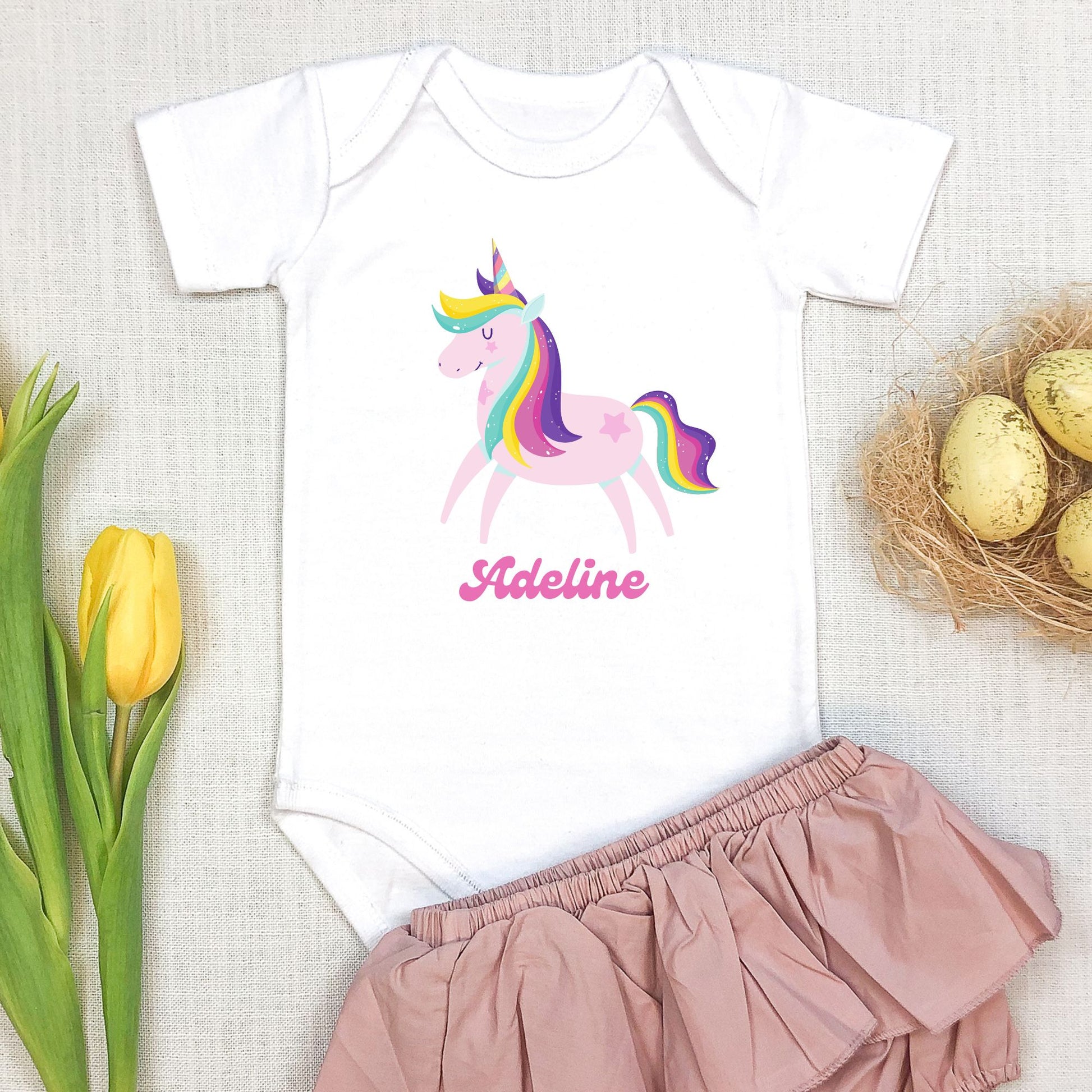 - Print: Adorable unicorn and rainbow design with personalized name