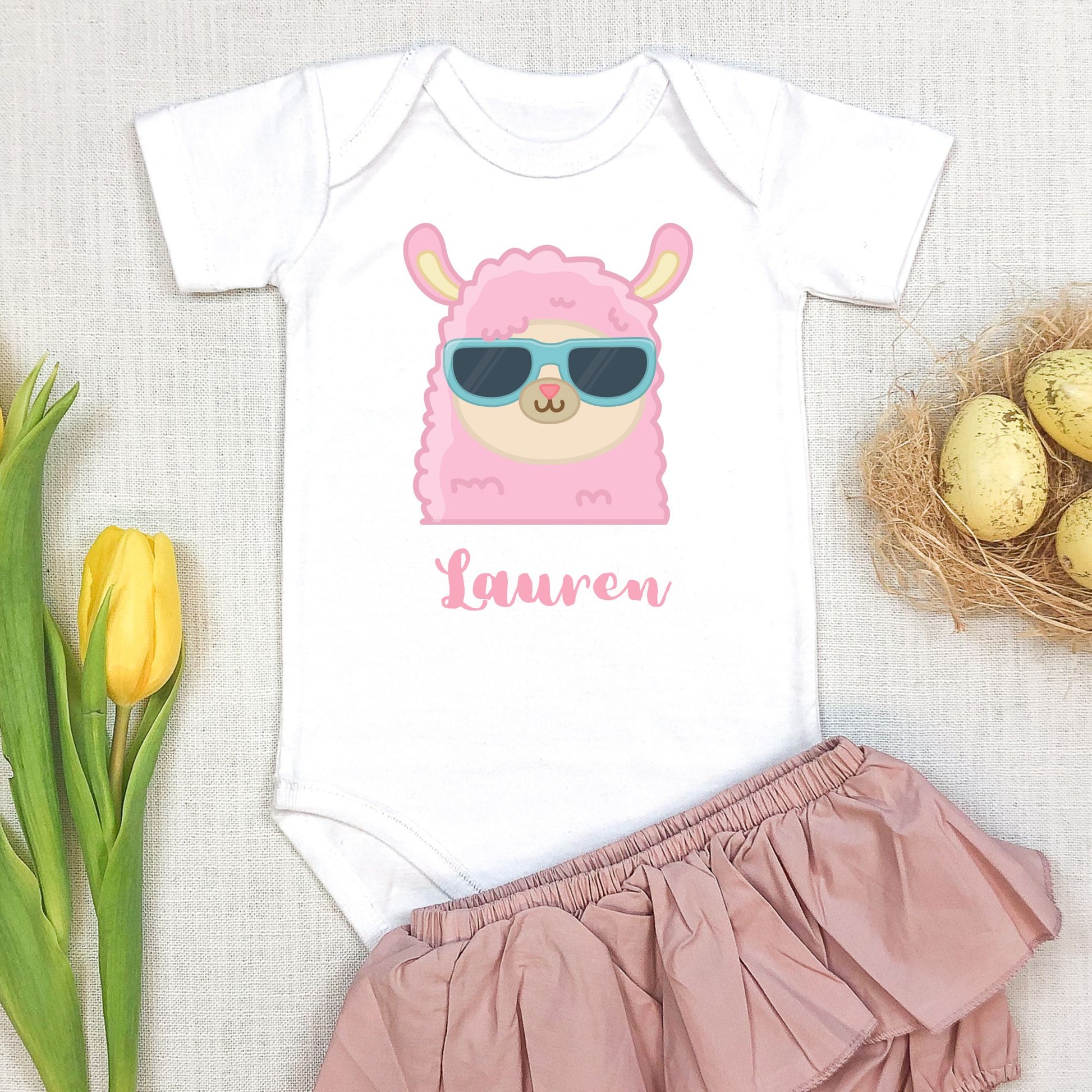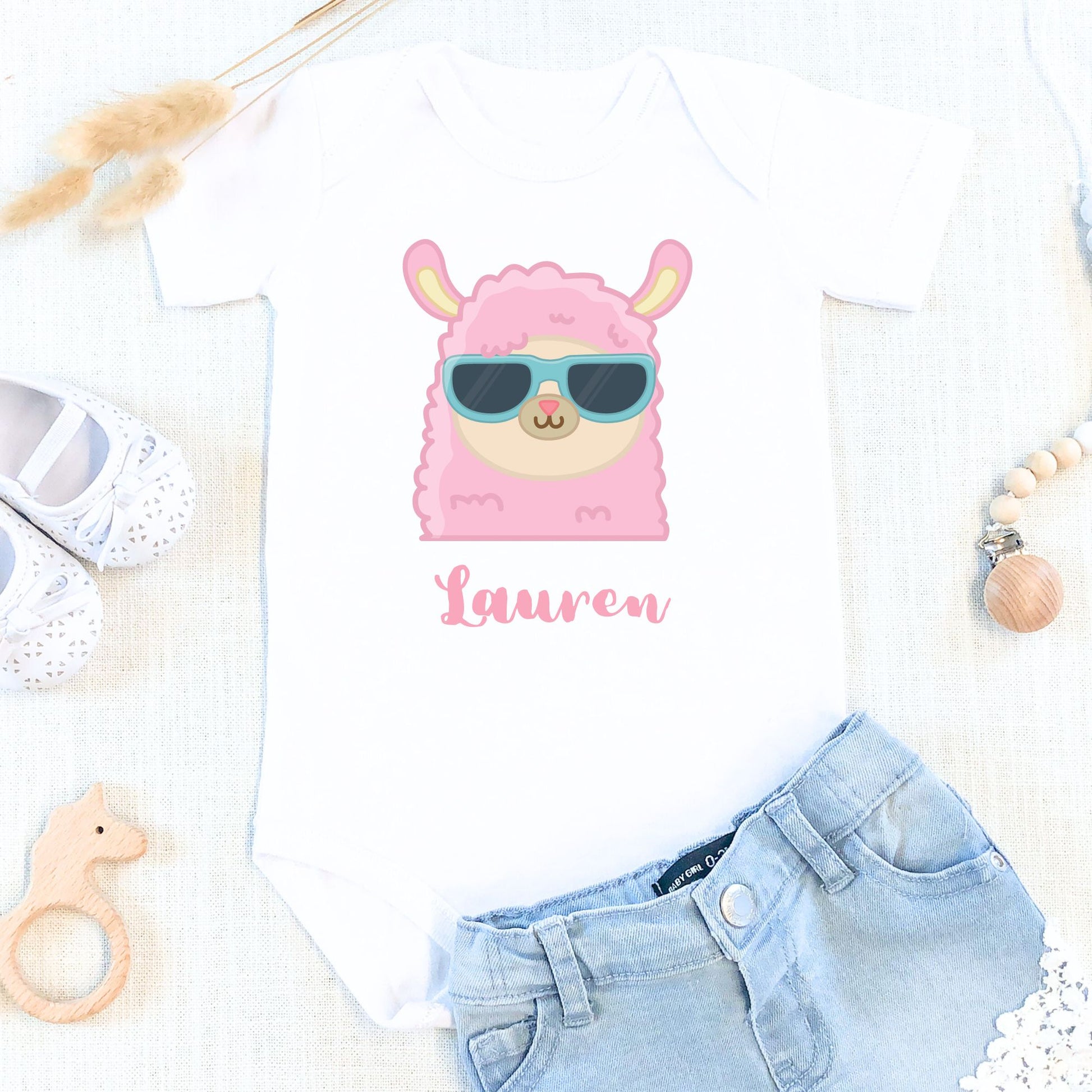 The adorable print includes a cute pink llama wearing cool sunglasses, adding a fun and trendy touch. Below the Llama design, your baby's name is printed in a lovely script font, making it uniquely theirs.