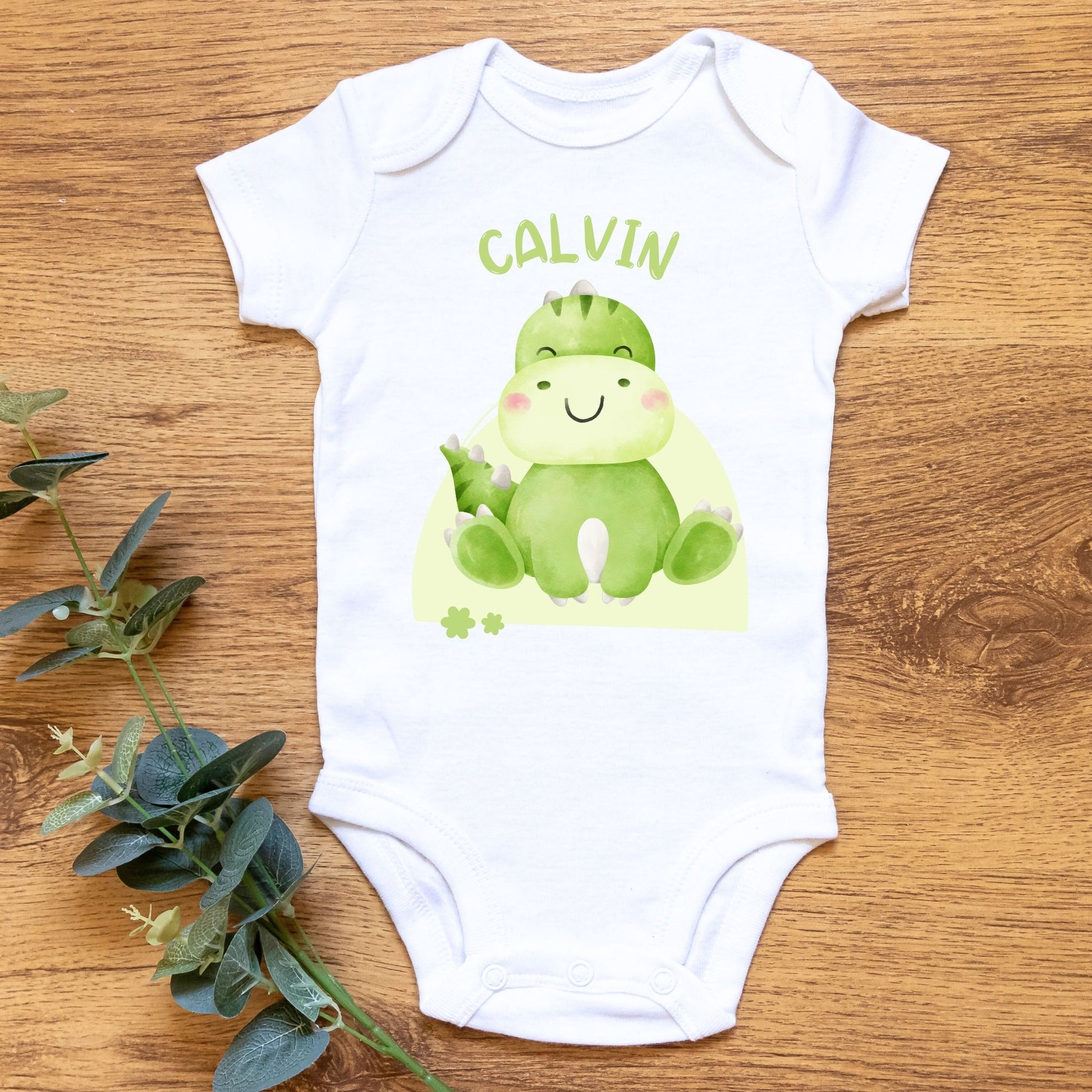 Featuring a cute green dinosaur and your baby's name printed right below, this romper is perfect for adding a fun and unique touch to your little one’s wardrobe. The cheerful dino design and personalized name make it a special piece that will be treasured for years to come.