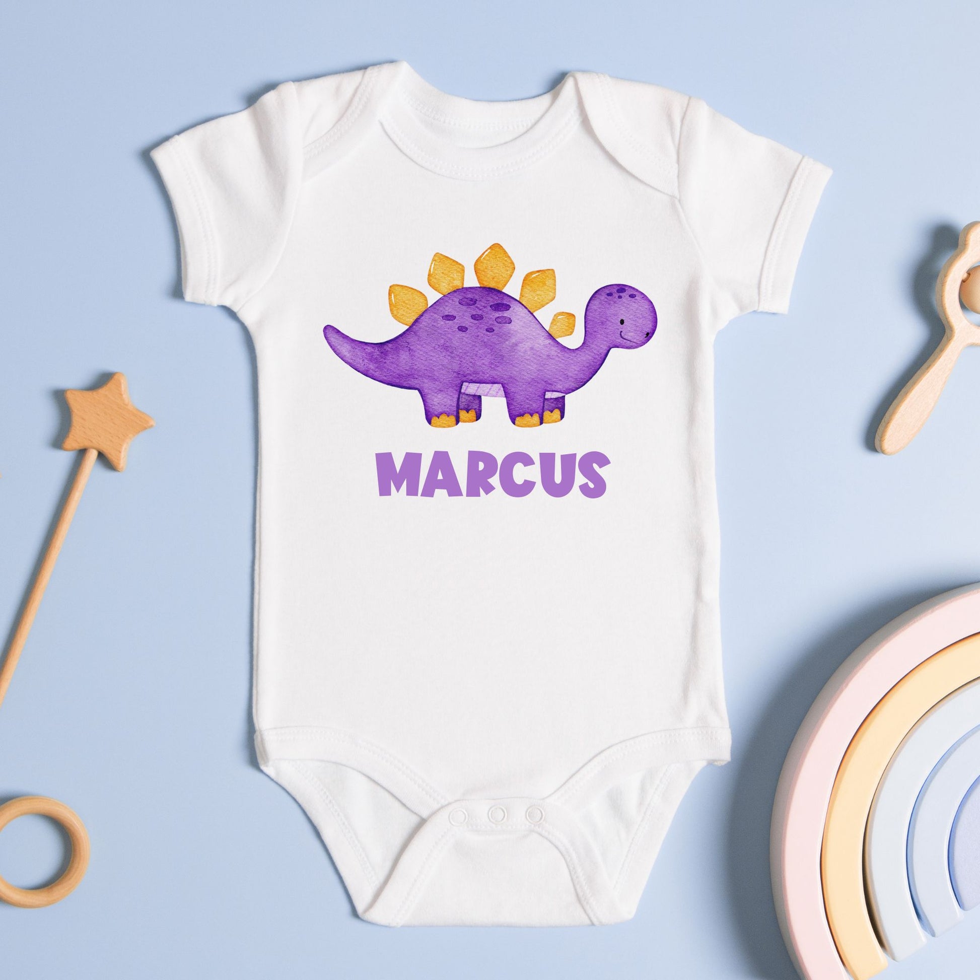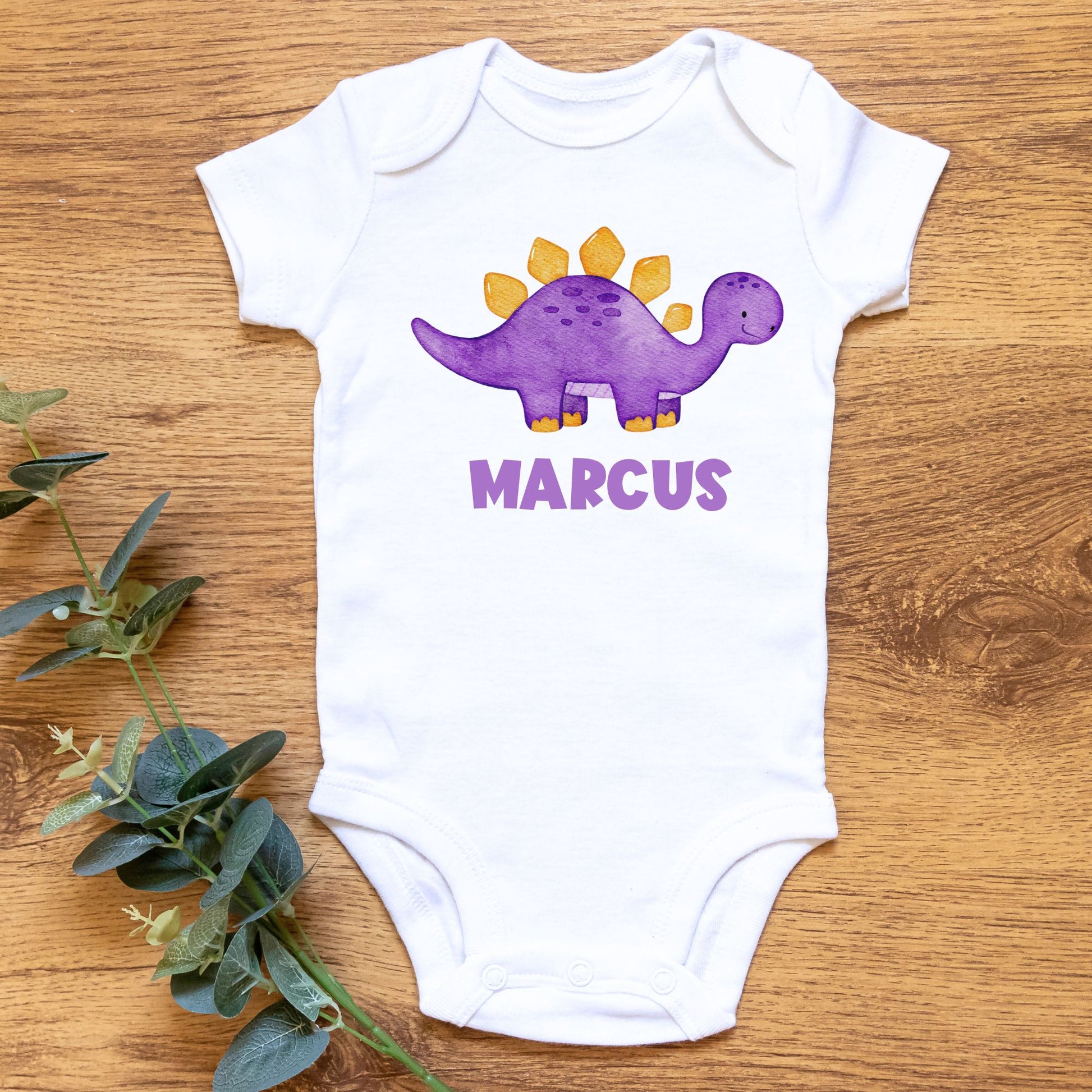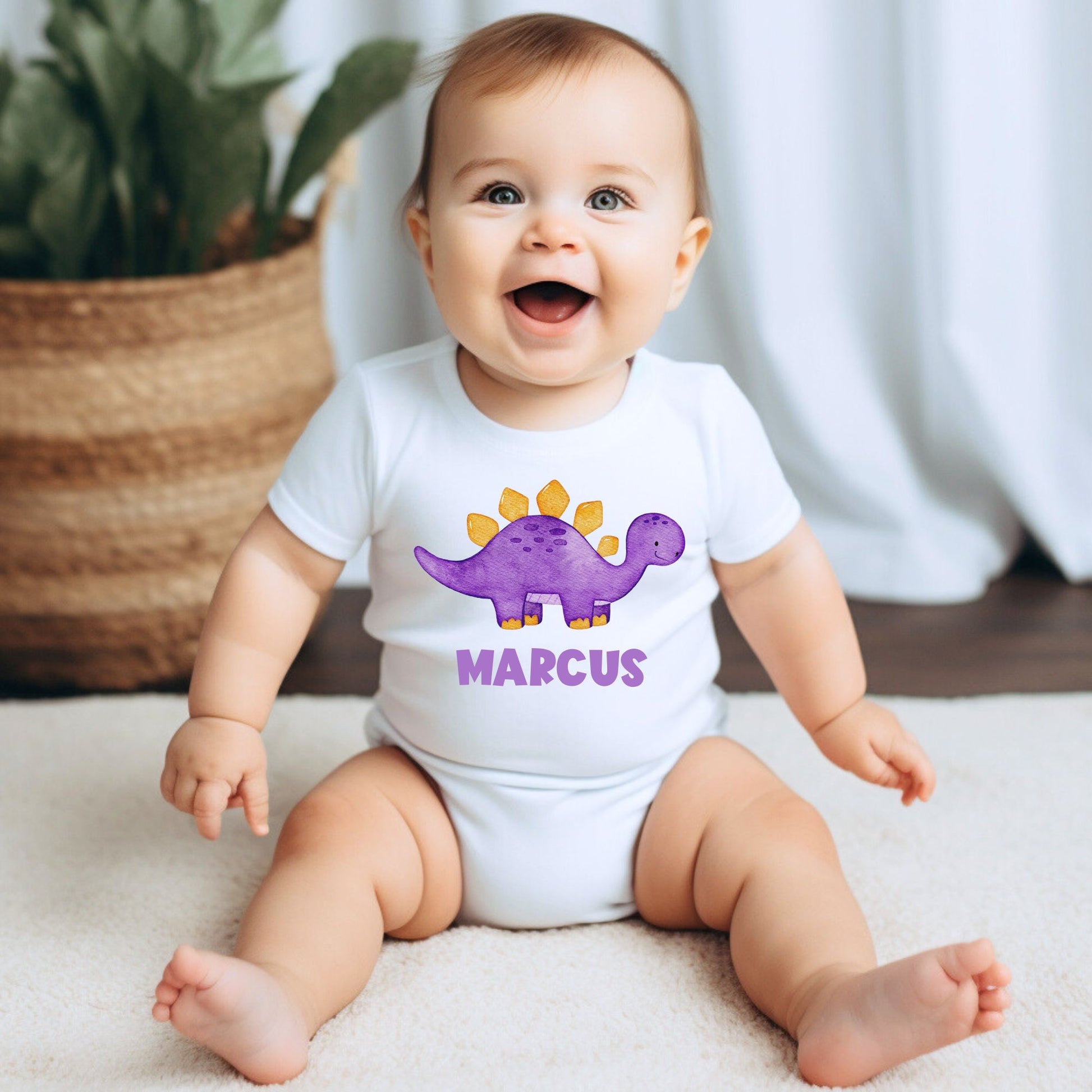 This adorable romper features a playful purple Stegosaurus and your baby’s name printed just below, creating a unique and delightful outfit that’s perfect for your little one. The vibrant dino design is sure to bring giggles and grins wherever your baby goes!