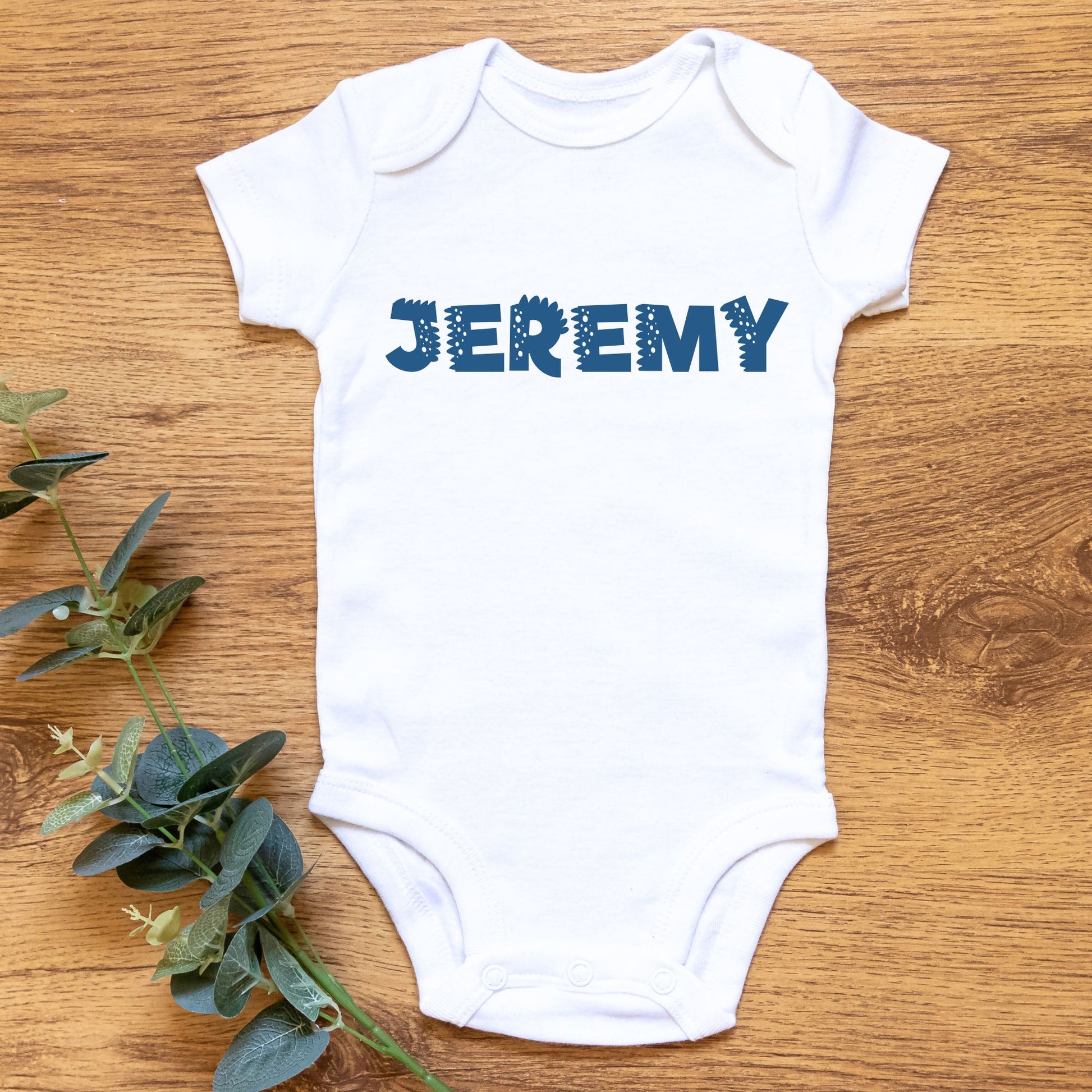 Your little one will be ready for fun in this delightful romper, featuring a playful dinosaur design and their name in a fun blue font. Perfect for all their playful moments and adventures!