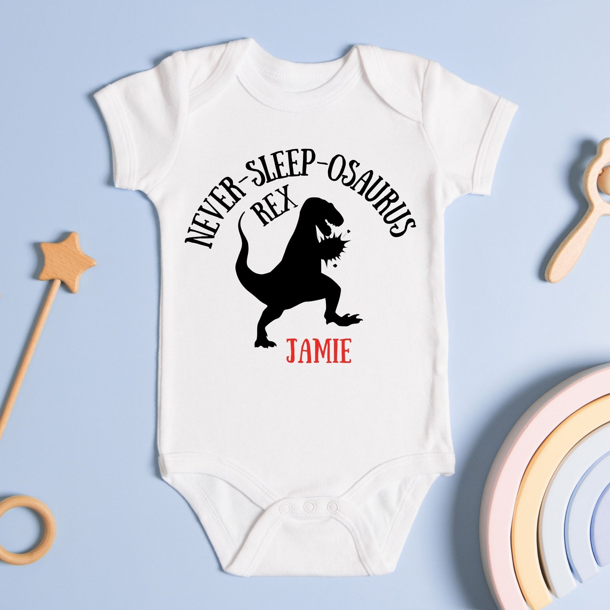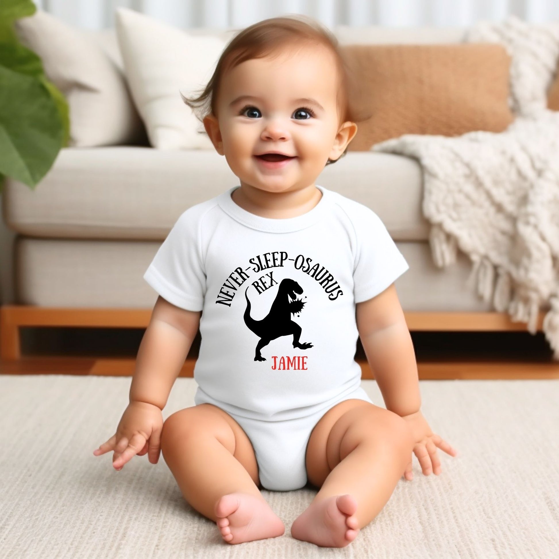 Personalized Name "Never-Sleep-O-Saurus Rex" Baby Romper
