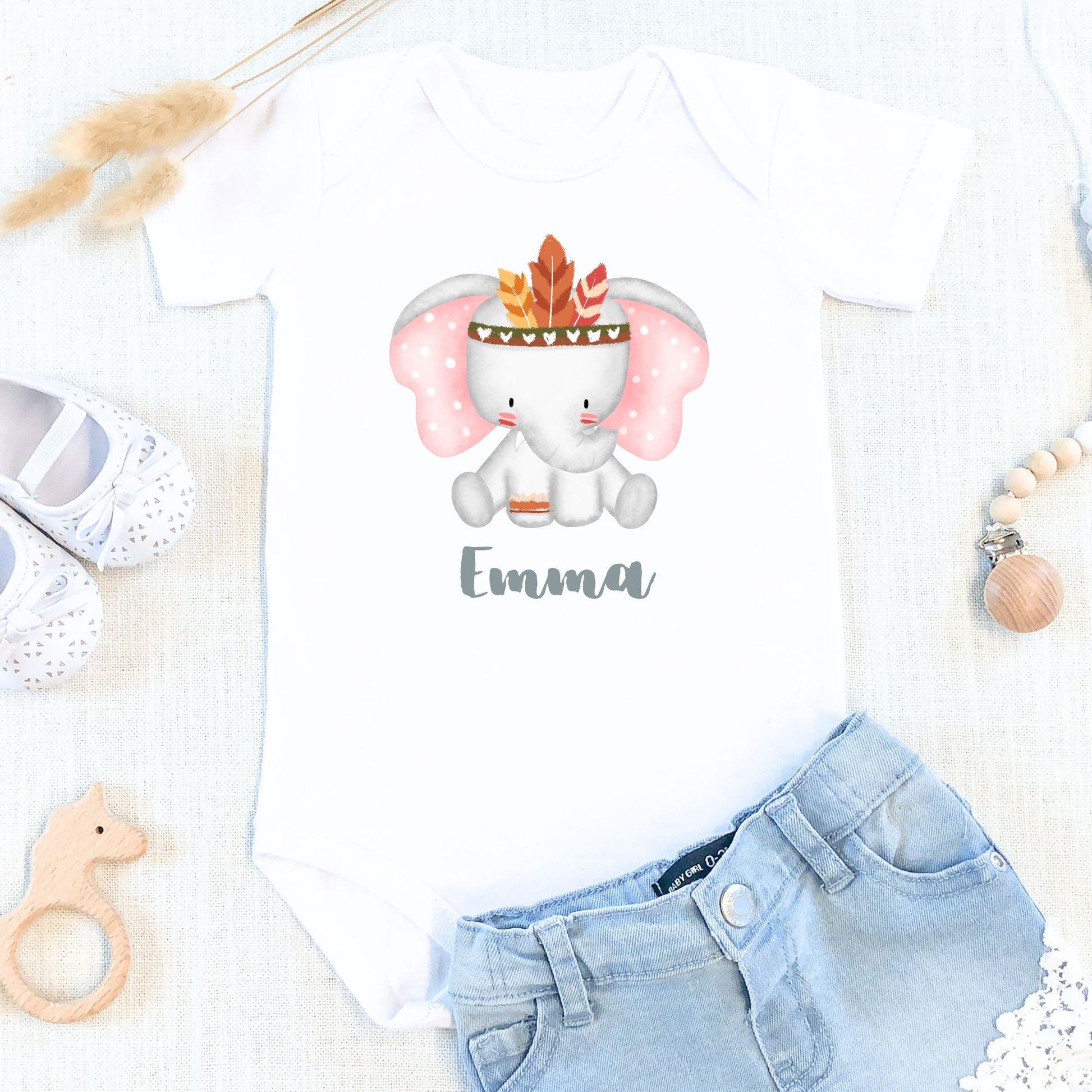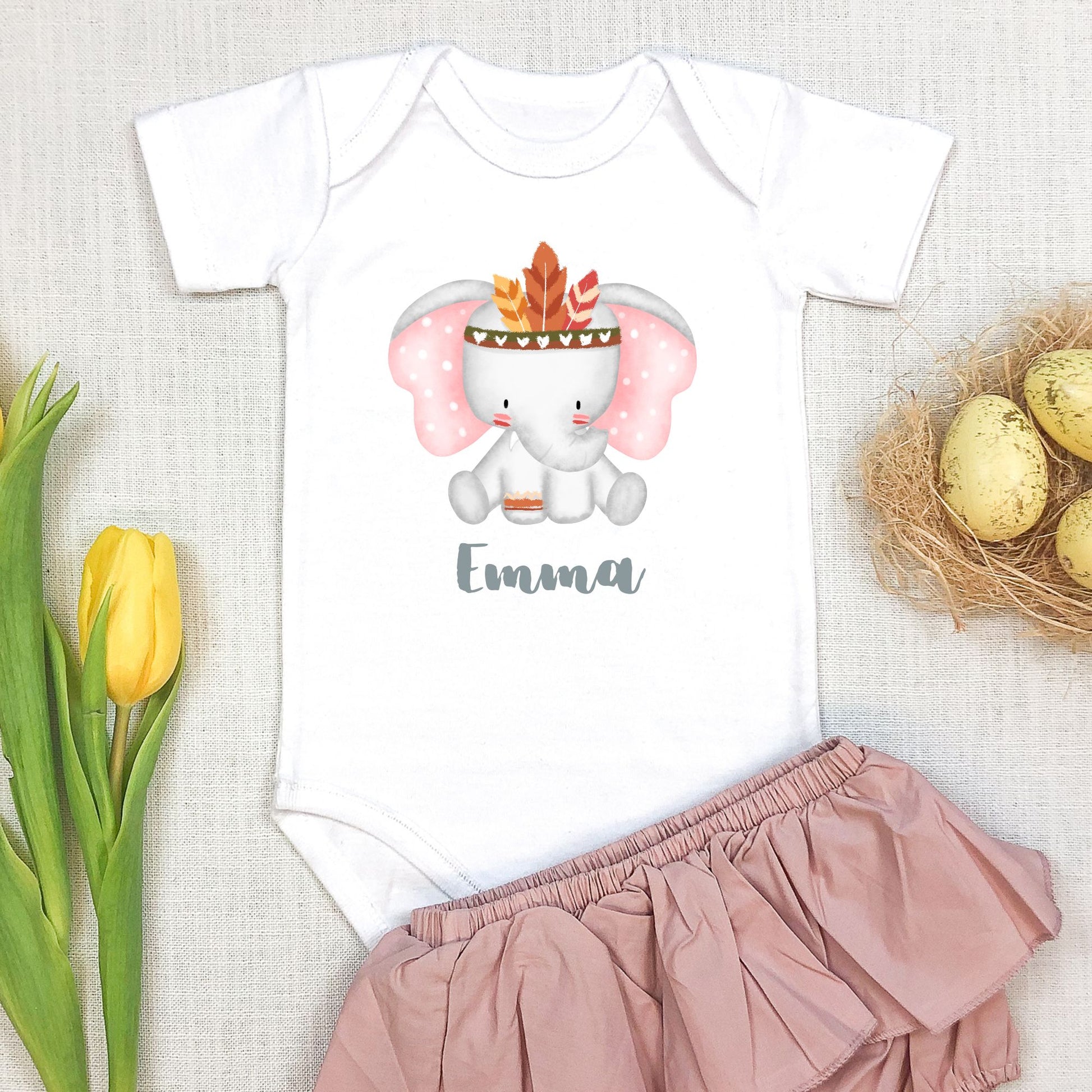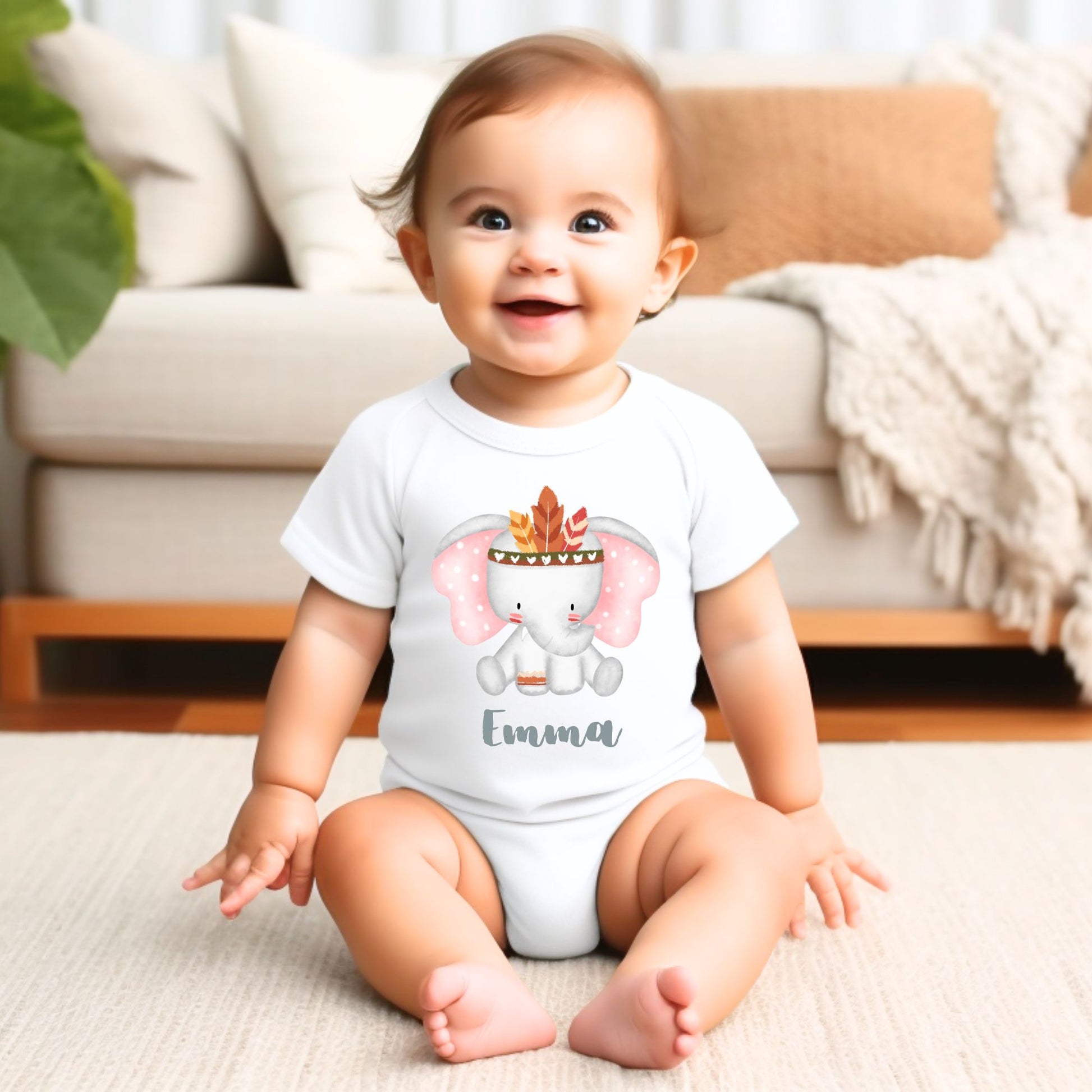 Celebrate your baby's gentle nature with our Personalized Safari Elephant Baby Romper. Featuring a sweet elephant design and your baby's name printed below, this romper is perfect for little ones who adore these gentle giants. Ideal for everyday wear, special occasions, and capturing those precious moments, this romper is an essential addition to your baby's wardrobe.