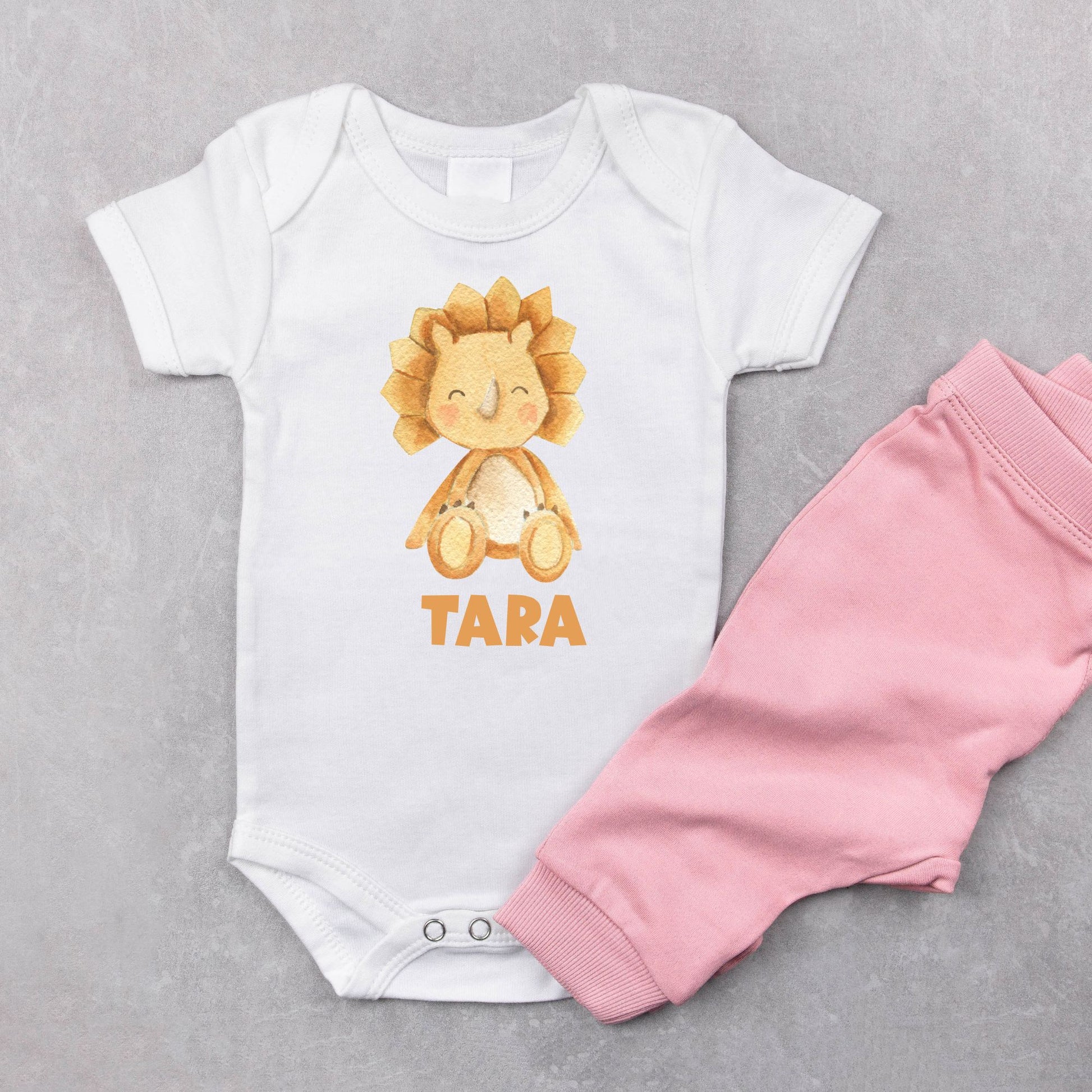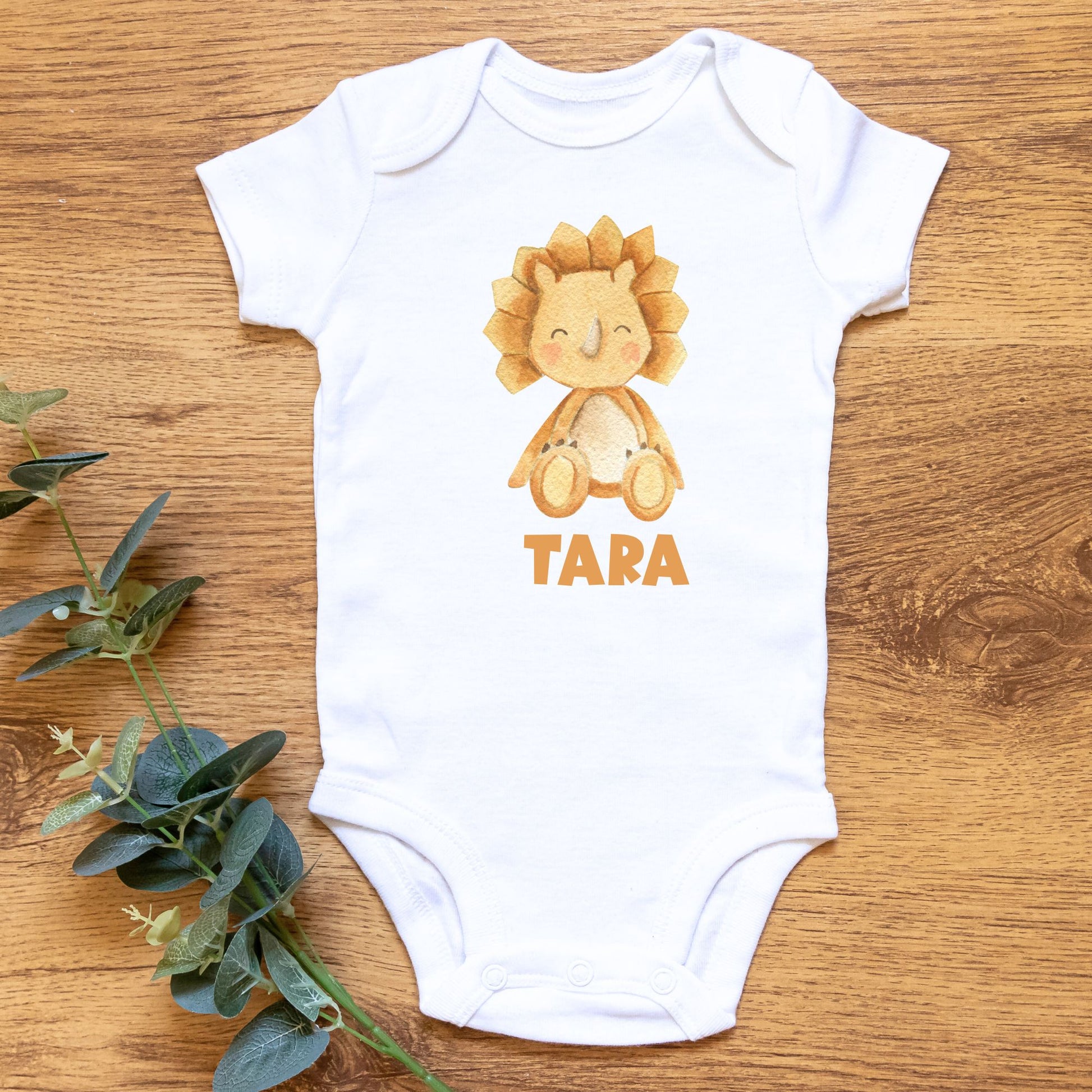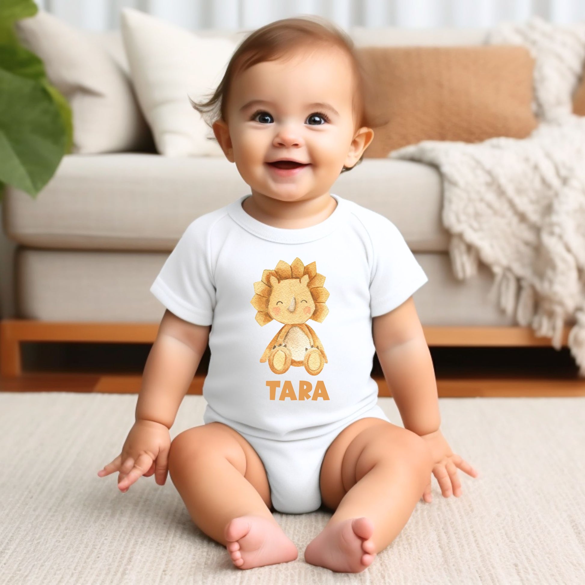Transform your little one’s wardrobe with our Sunny Dino Personalized Baby Romper! Featuring an adorable, smiling dino with a radiant mane of spikes, this romper adds a splash of prehistoric charm to your baby’s outfit.