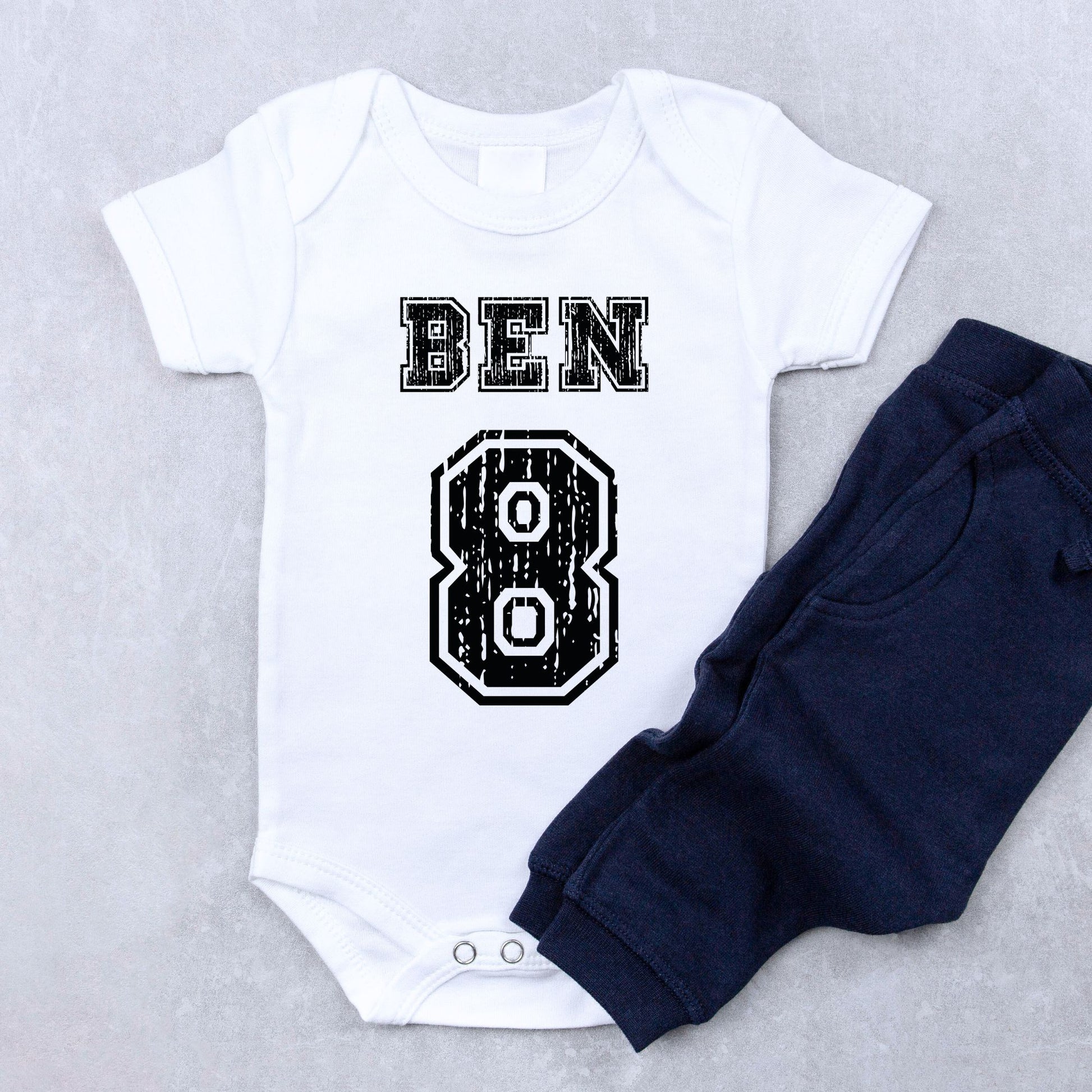 Show your team spirit with this charming romper. Order now and let your baby join the team with their personalized "Team Jersey" romper!