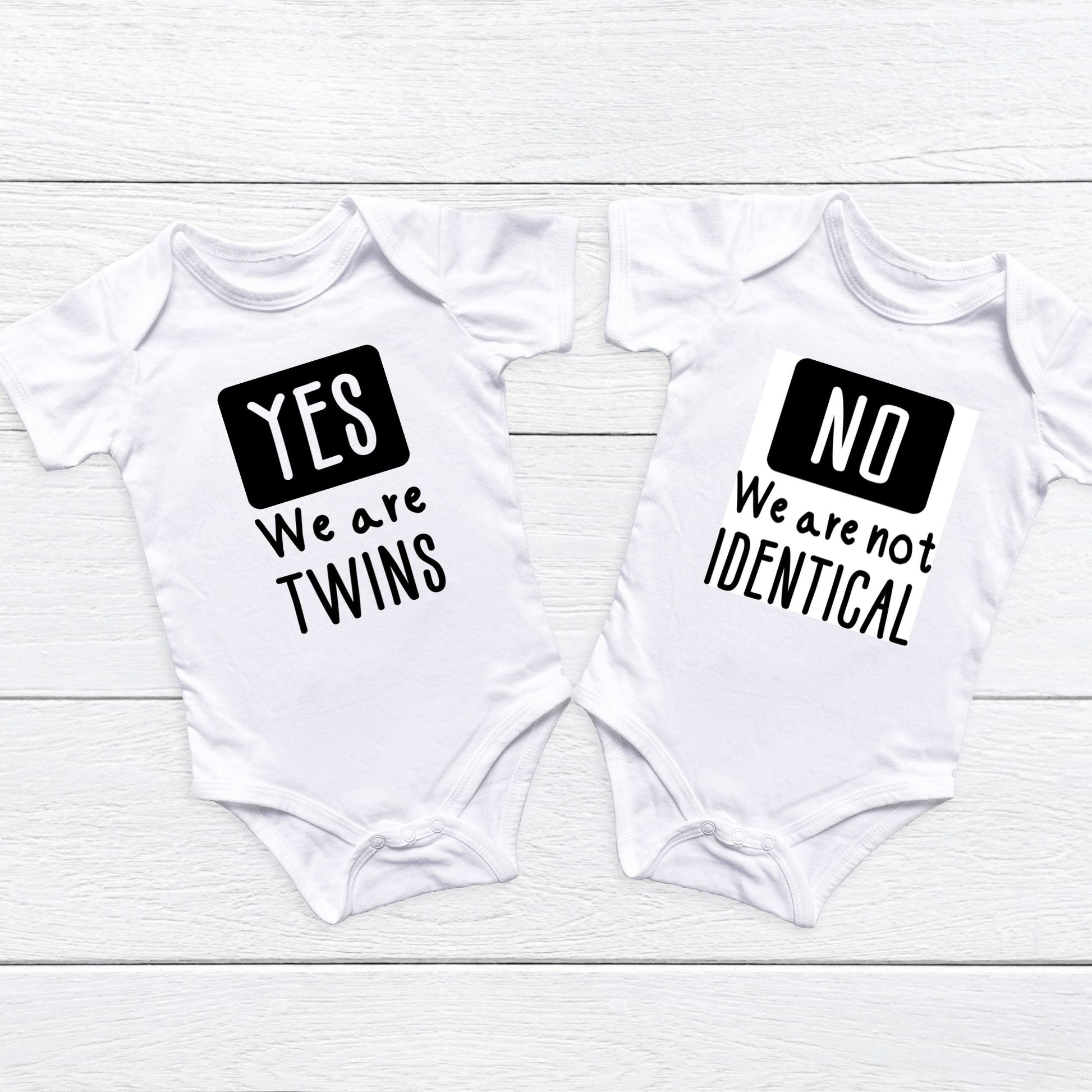 Let your twins do the talking with this adorable and witty onesie set! One says, "YES, We Are Twins," while the other clears up any confusion with, "NO, We Are Not Identical." It's the perfect way to answer the most common twin questions—without saying a word!