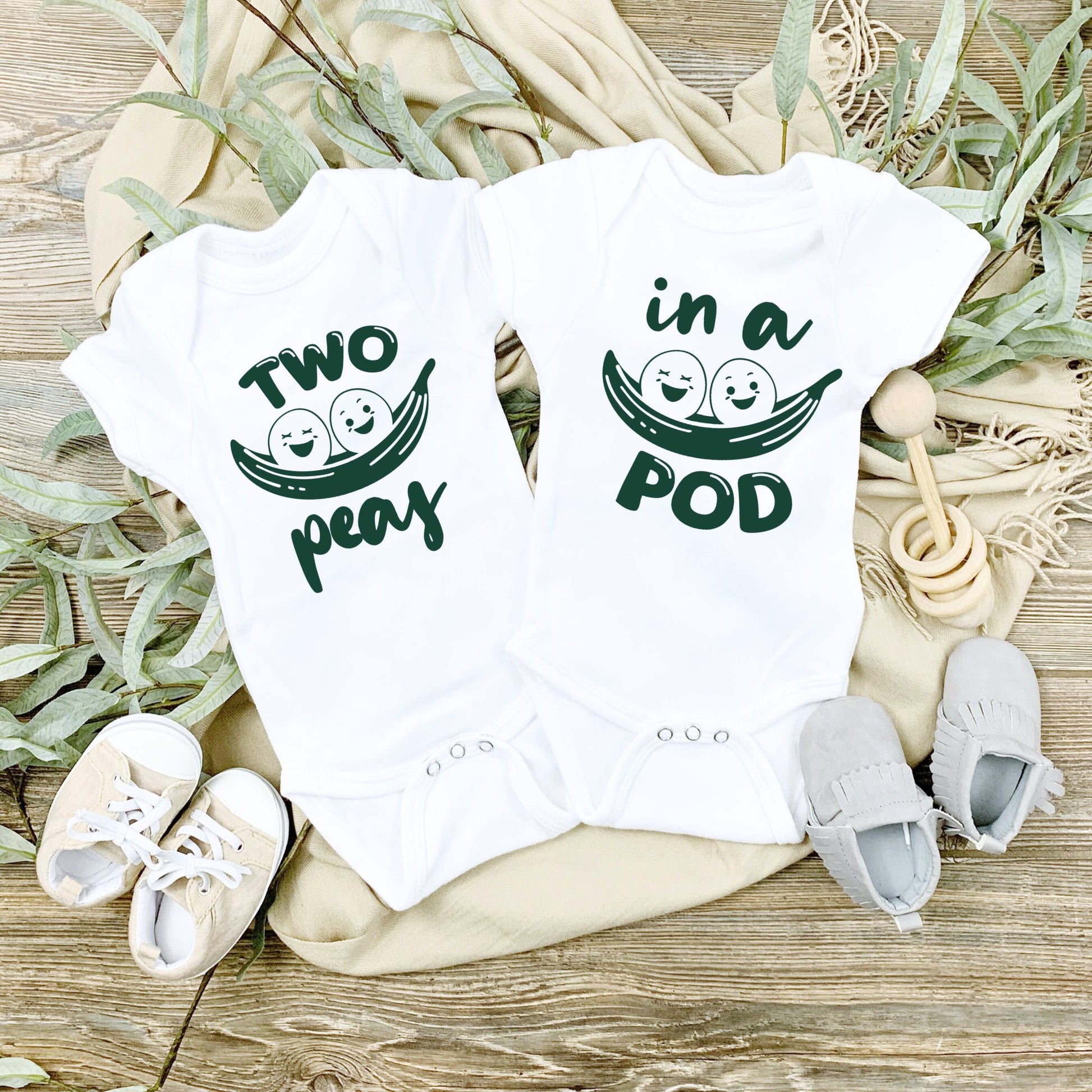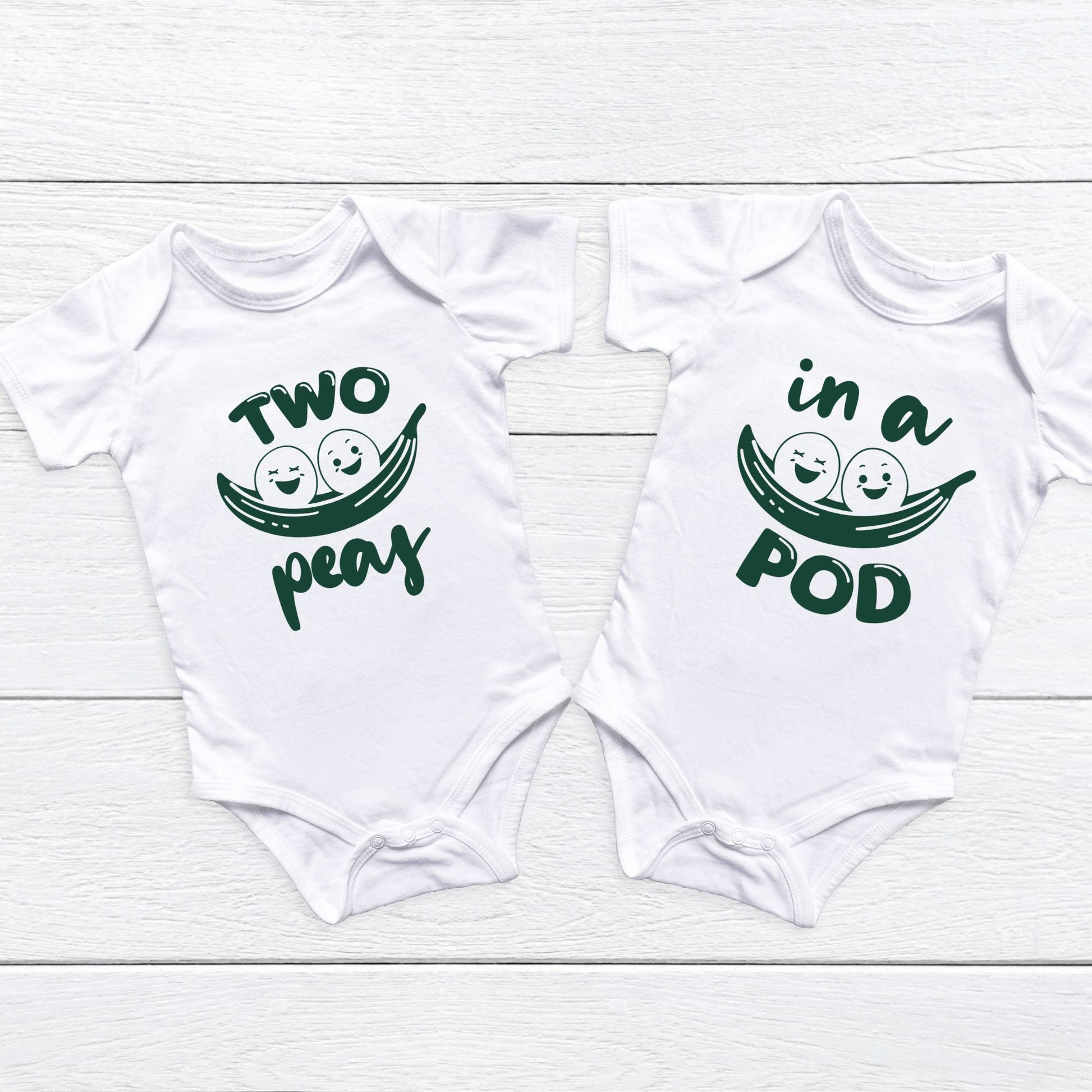 Double the giggles, double the fun—because your little duo truly is "Two Peas in a Pod!" This adorable twin onesie set features a sweet matching design: one onesie says “Two Peas” and the other completes the phrase with “In a Pod.” Perfect for twins who share everything—including cuteness overload!