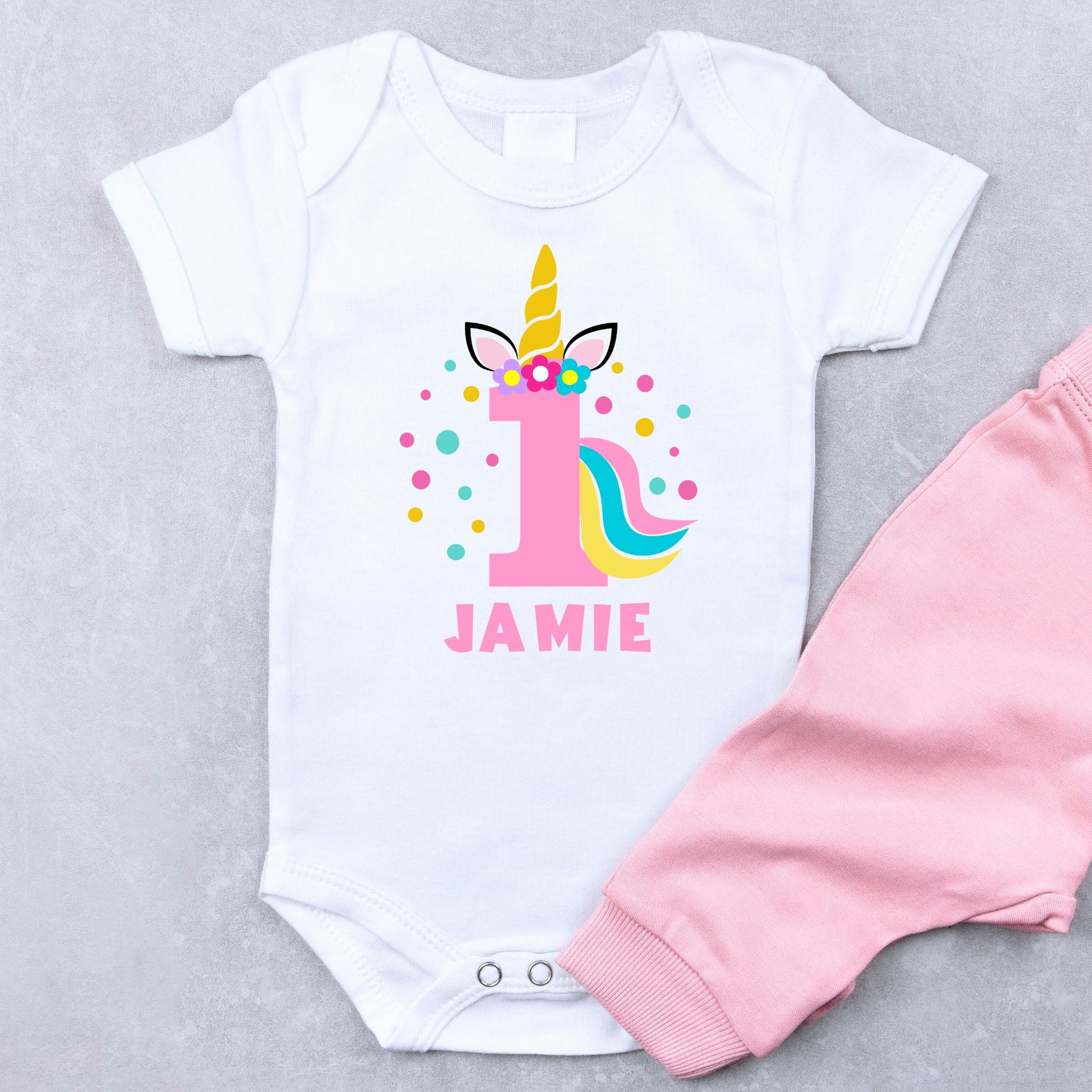 - Design: Cute unicorn-themed number "1" with personalized name below.