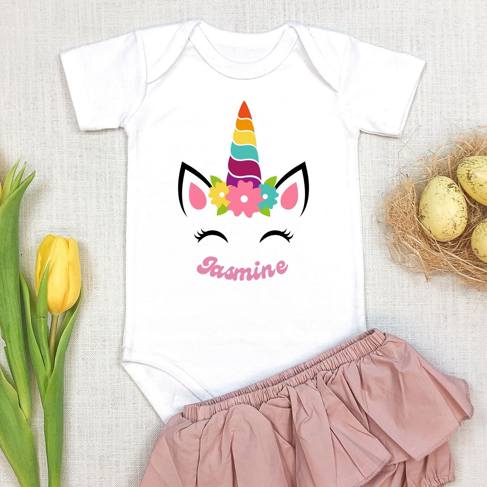 Enchant your baby's wardrobe with our Whimsical Unicorn Personalized Baby Romper. Featuring a delightful unicorn and rainbow design with your baby's name printed below, this romper is perfect for everyday adventures, special celebrations, and charming photo sessions.