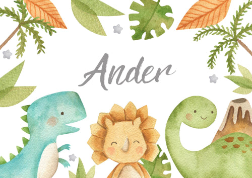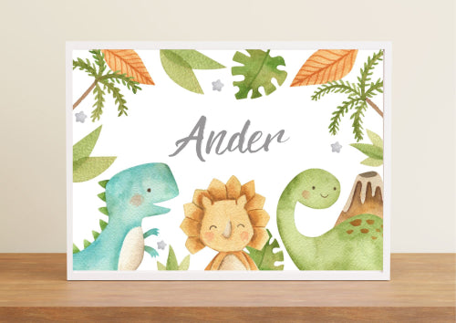 Ignite your child's imagination with our personalized dinosaur poster, perfect for little explorers who love all things prehistoric! This vibrant design showcases a playful scene of baby dinosaurs, with your child's name taking center stage in a charming, custom integration.