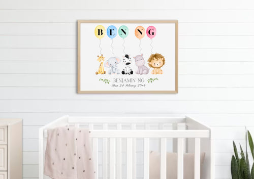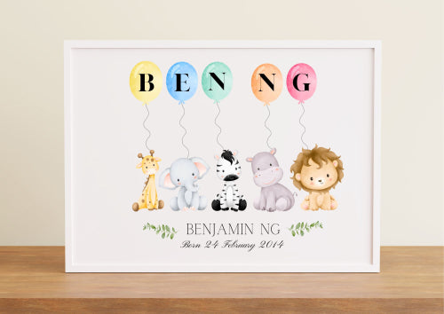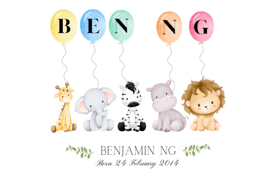 This charming poster features a delightful crew of baby safari animals – lions, giraffes, elephants, and more – each holding a colorful balloon with your little one's name on it. It's a whimsical and personalized way to celebrate your baby's love for animals and their adventurous spirit.