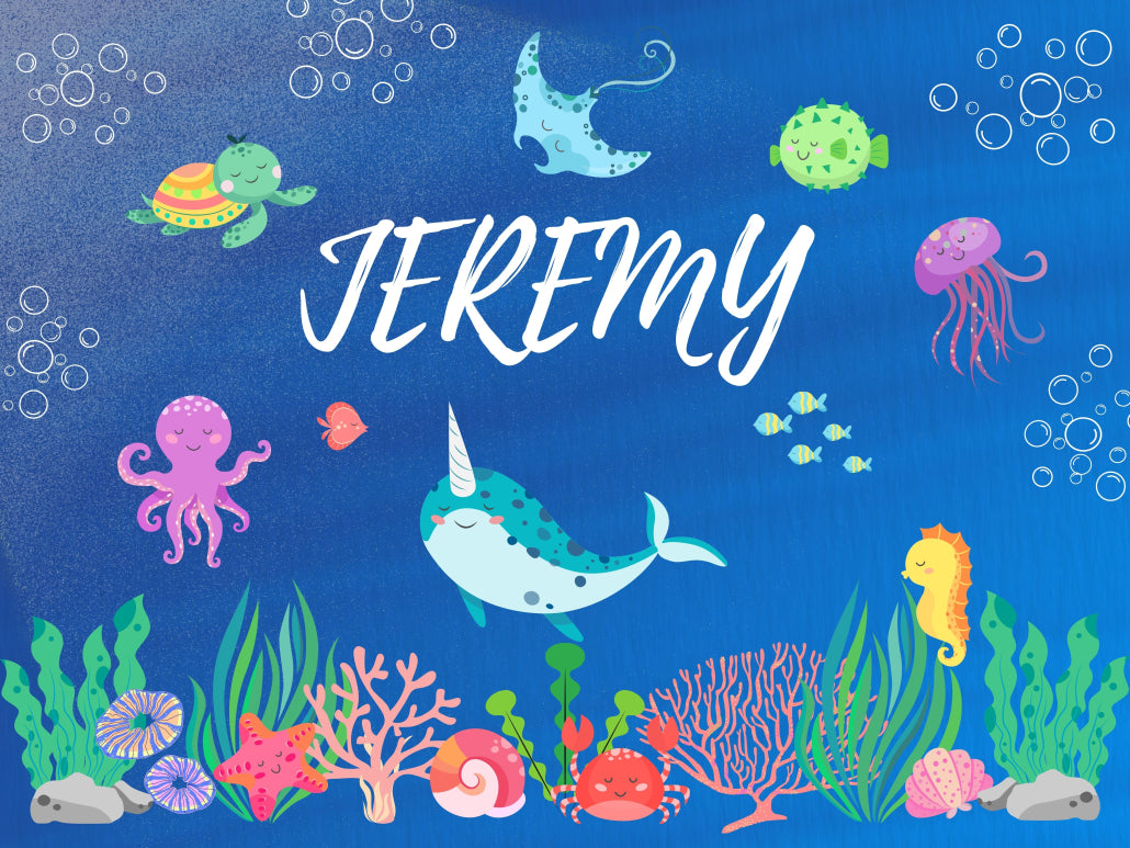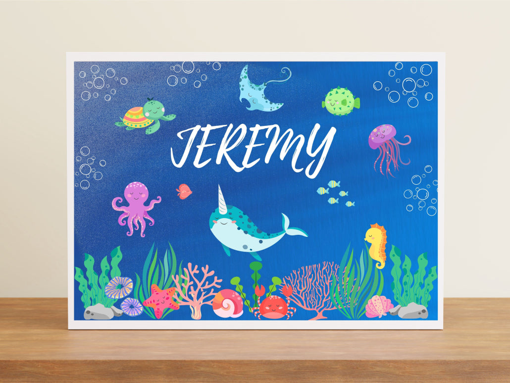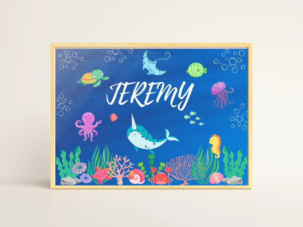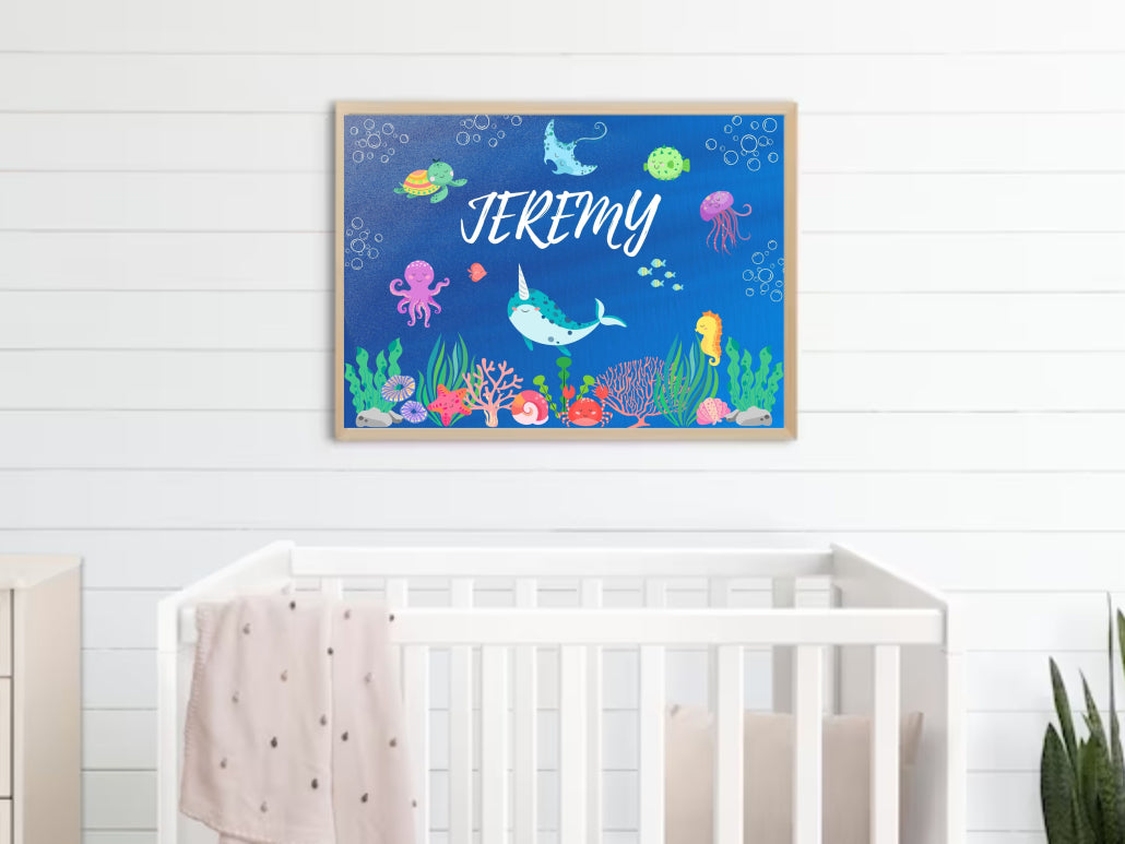 Dive into a world of wonder with our enchanting "Sea Animals Adventure" poster, perfect for personalizing your little one's nursery! This delightful design features a vibrant array of friendly sea creatures, including playful narwhals, curious turtles, colorful fish, and graceful seahorses.