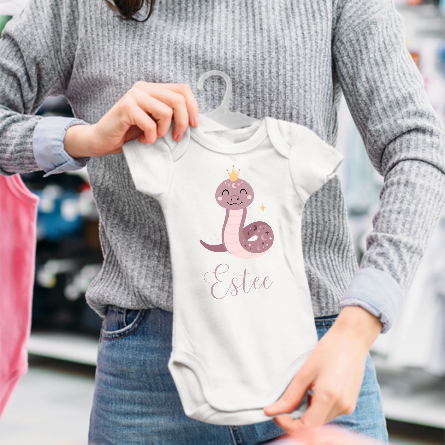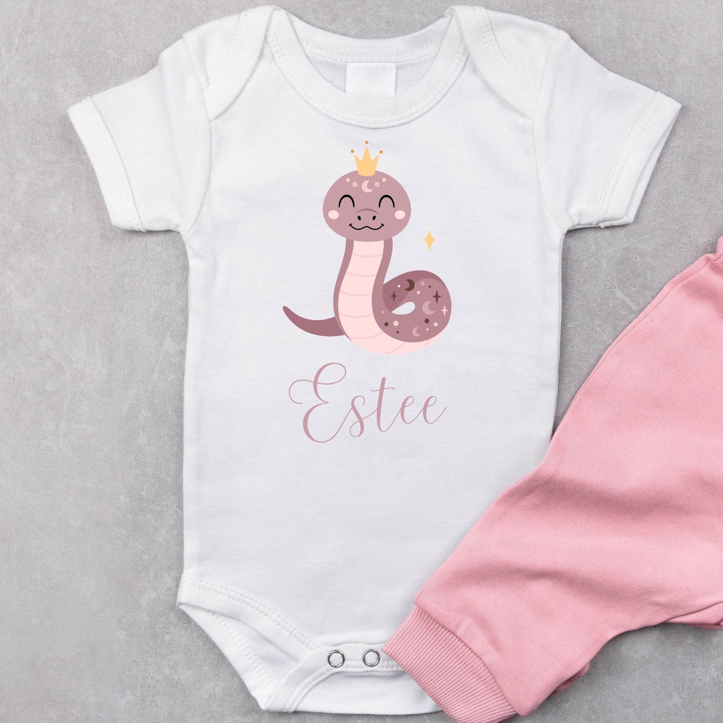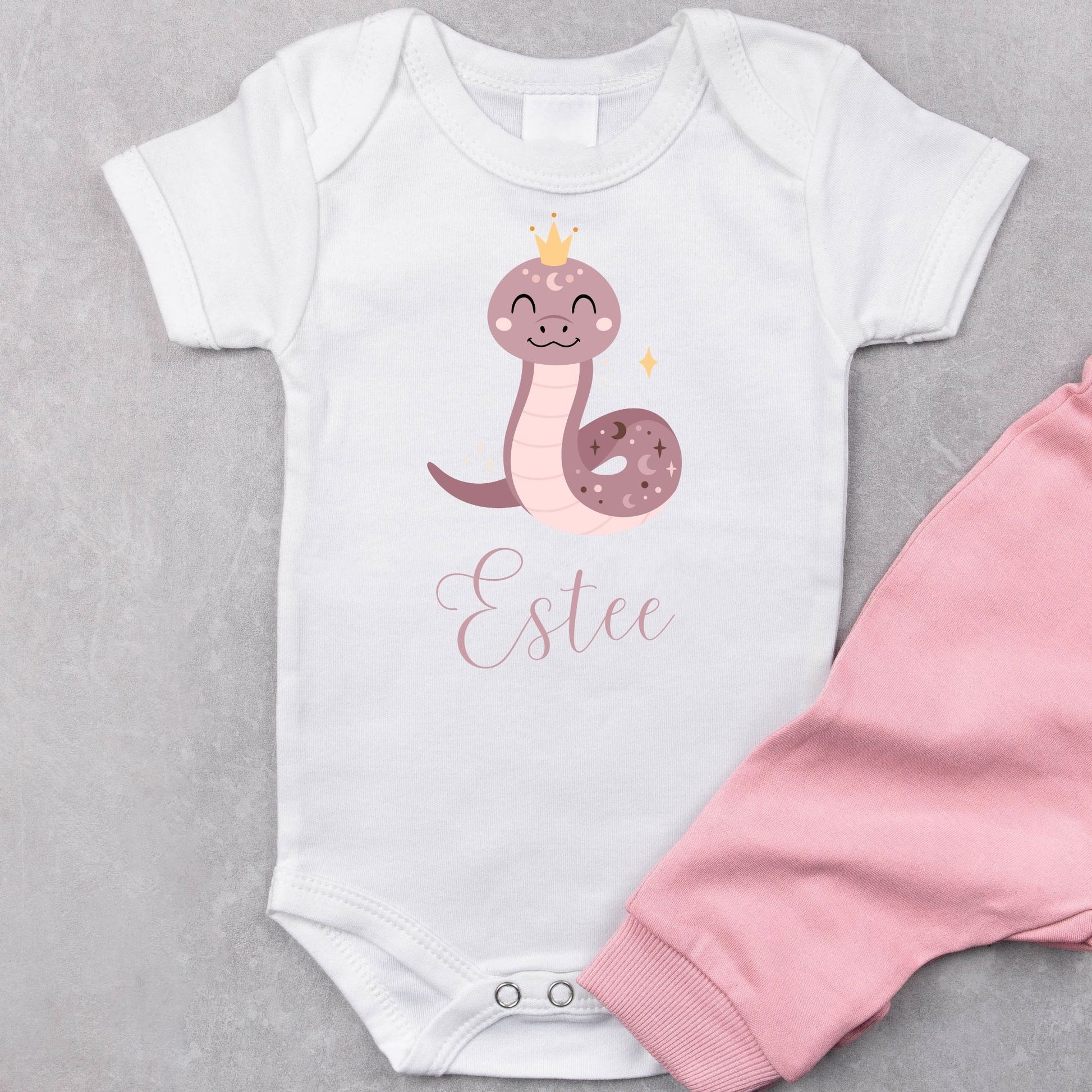 This adorable personalized baby romper is the perfect way to celebrate your little one’s arrival. Featuring a playful snake princess design and customizable with your baby’s name, it’s a great gift for baby showers or birthdays. The unique snake theme adds a touch of fun while making the romper a special keepsake for the parents.