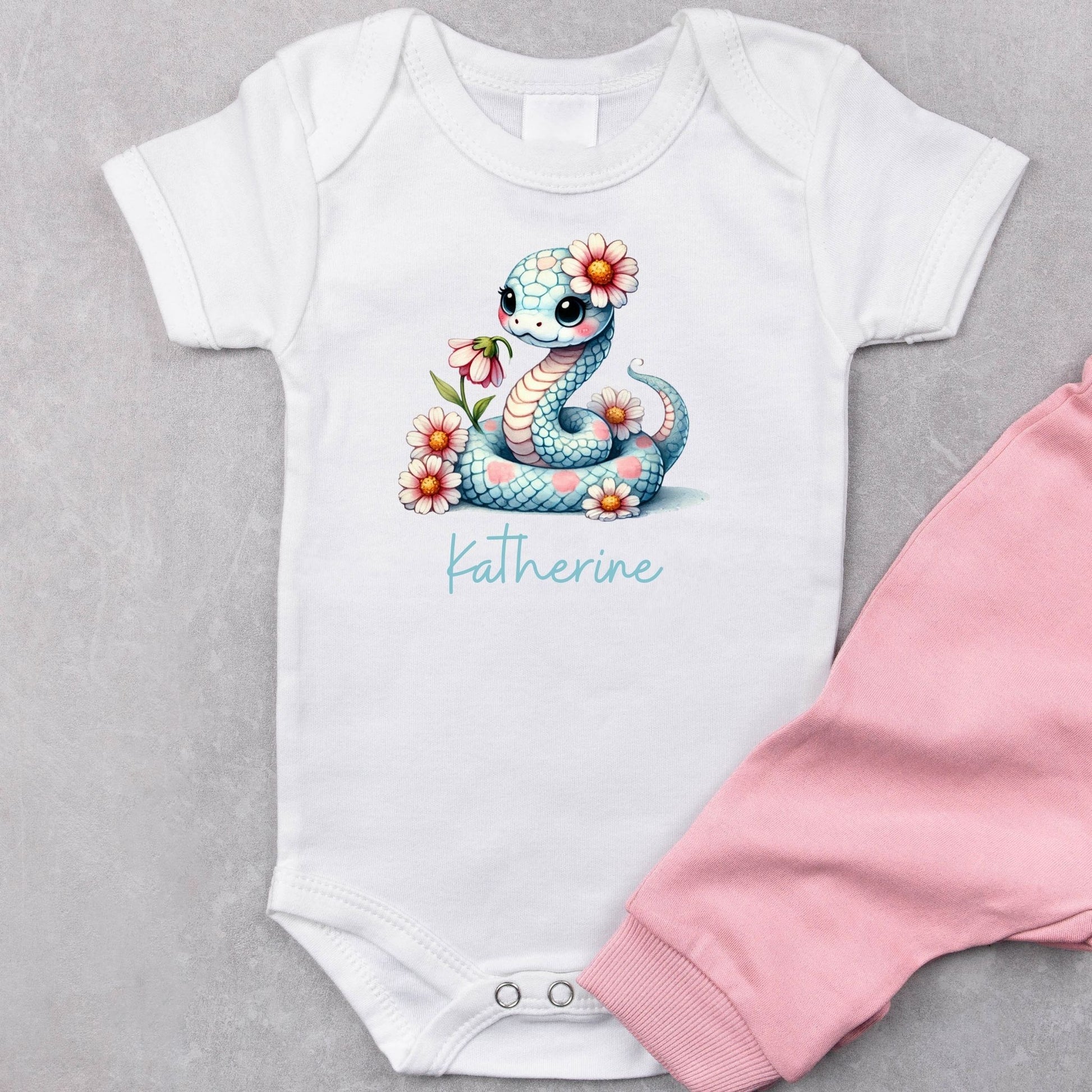 Celebrate your little one in style with this unique personalized baby romper. Designed with an adorable snake and flowers graphic and personalized with your baby’s name, it’s a memorable gift that’s perfect for any occasion, from baby showers to birthdays.