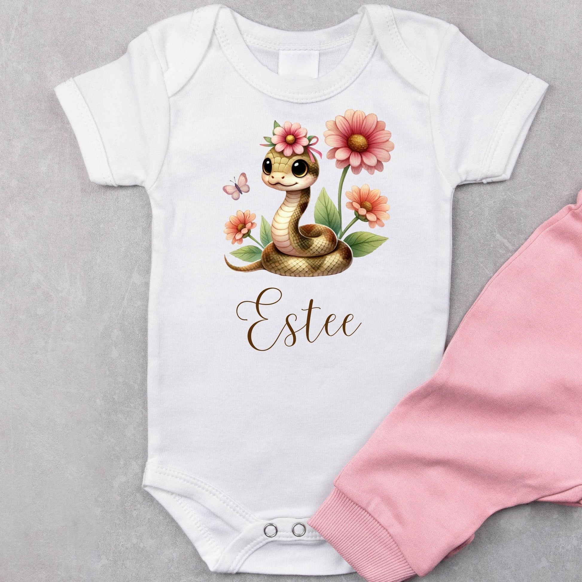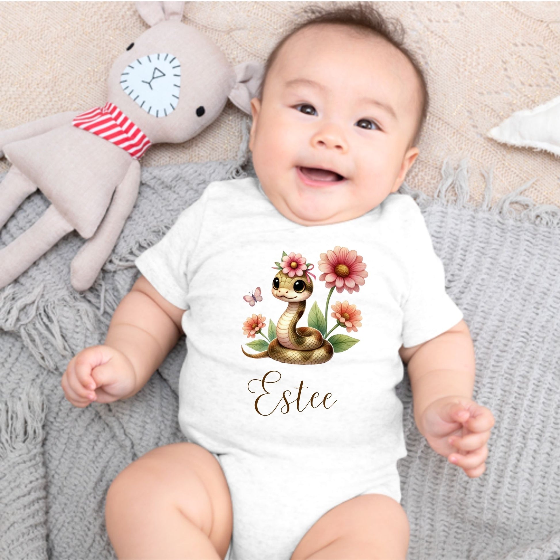 Looking for a unique gift to celebrate a baby girl’s special day? This personalized baby romper, featuring a playful snake design, is a perfect choice.