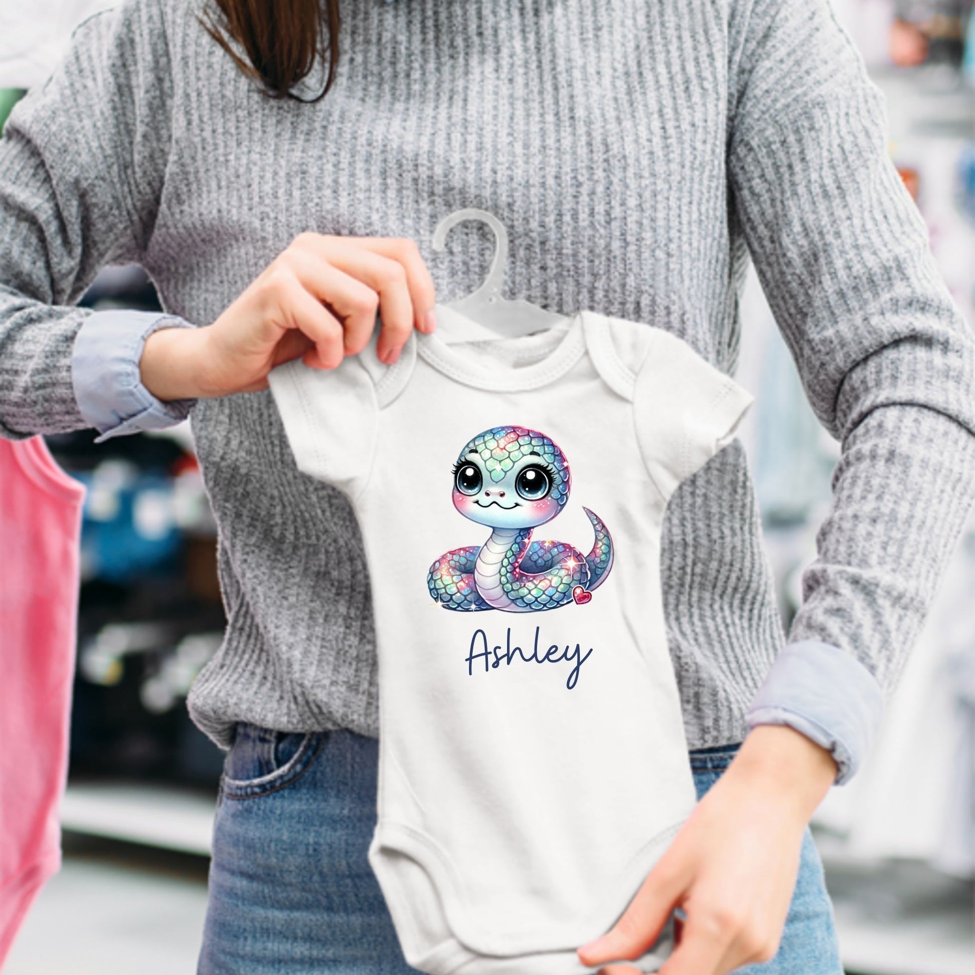 Bring a little sparkle to your baby girl’s wardrobe with the "Sssparkling Snake" personalized romper. This unique design features a charming snake that's sparkling, offering a fresh and fun look for your little one. Customize it with her name to make it a one-of-a-kind gift for baby showers, birthdays, or any special event.