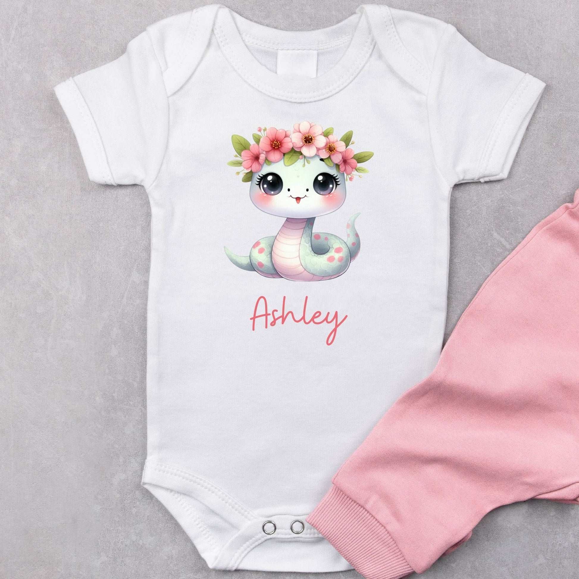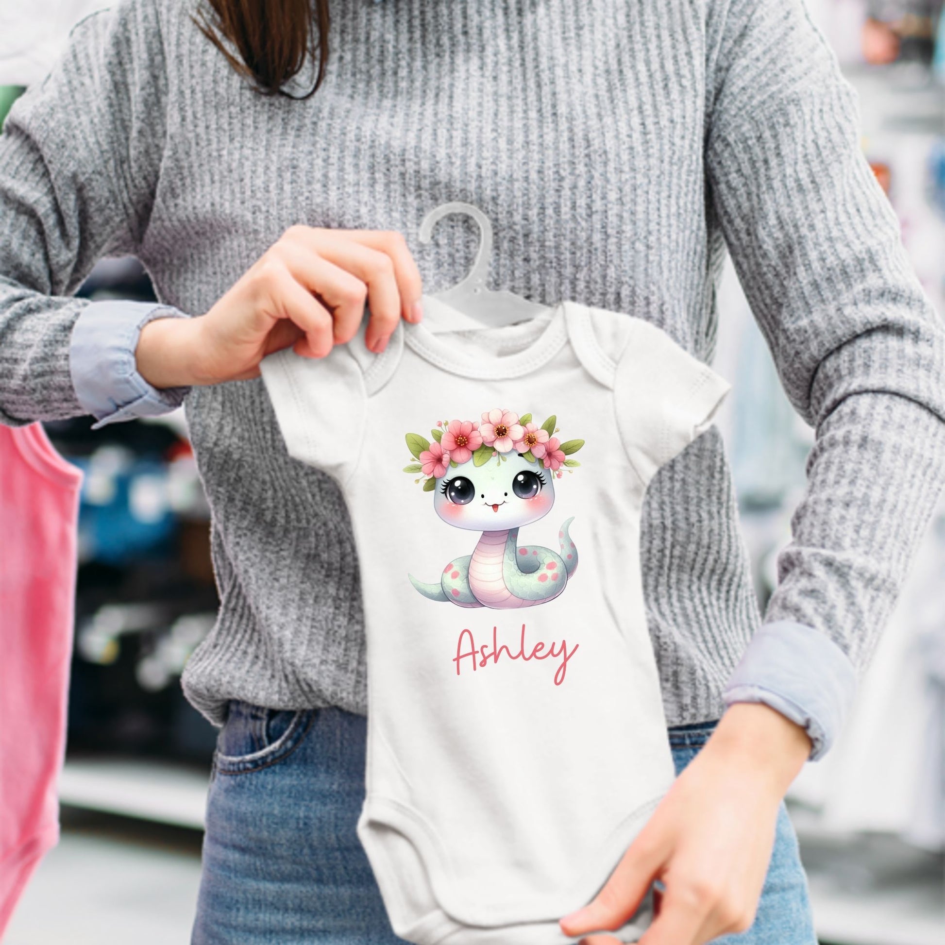 This romper is a great way to mark significant milestones like baby showers, birthdays, or simply the joy of having your little one around. The adorable snake wears a flower wreath on its head, adding a fun twist, while the custom name ensures that this piece is uniquely hers.