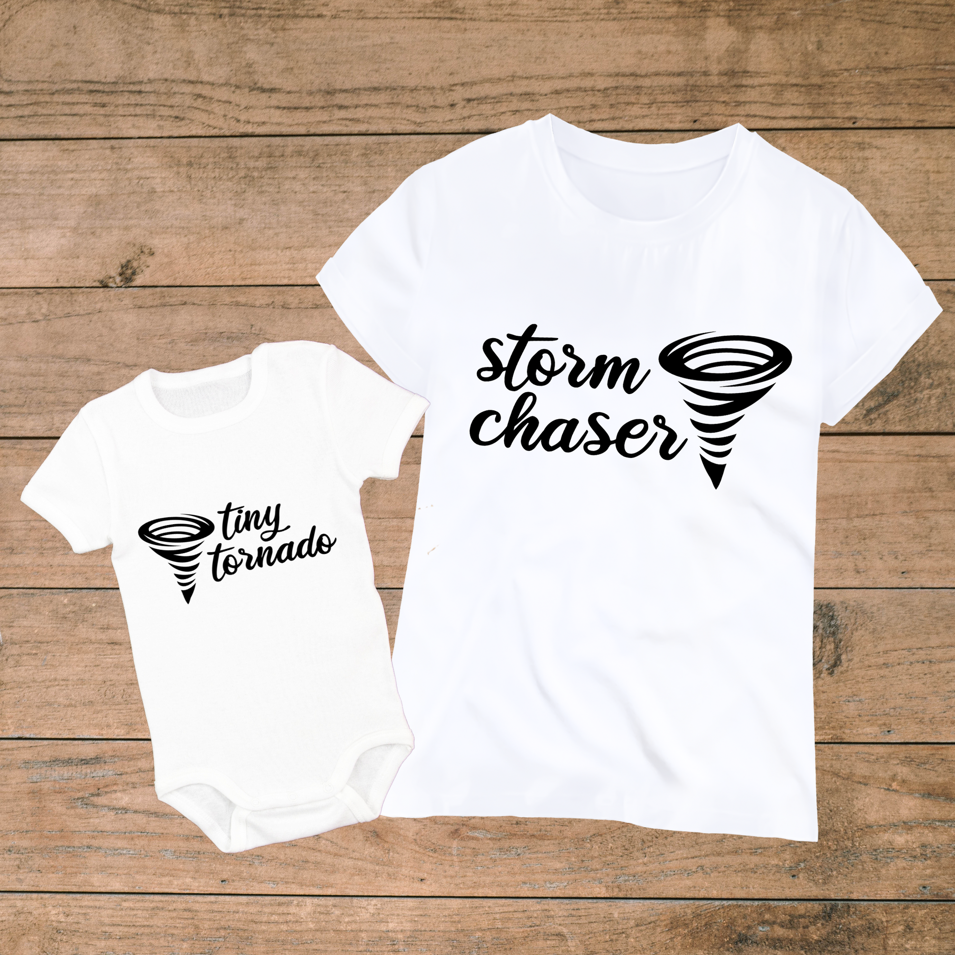 Get ready to chase adventures with our "Storm Chaser & Tiny Tornado" mommy & me matching outfits! These playful designs celebrate the unbreakable bond between moms and their energetic little ones. Choose from comfy tees, onesies, and more, perfect for everyday adventures. The ideal gift for baby showers, Mother's Day, or anyone embracing the whirlwind of parenthood with style. Shop now and let the good times roll!