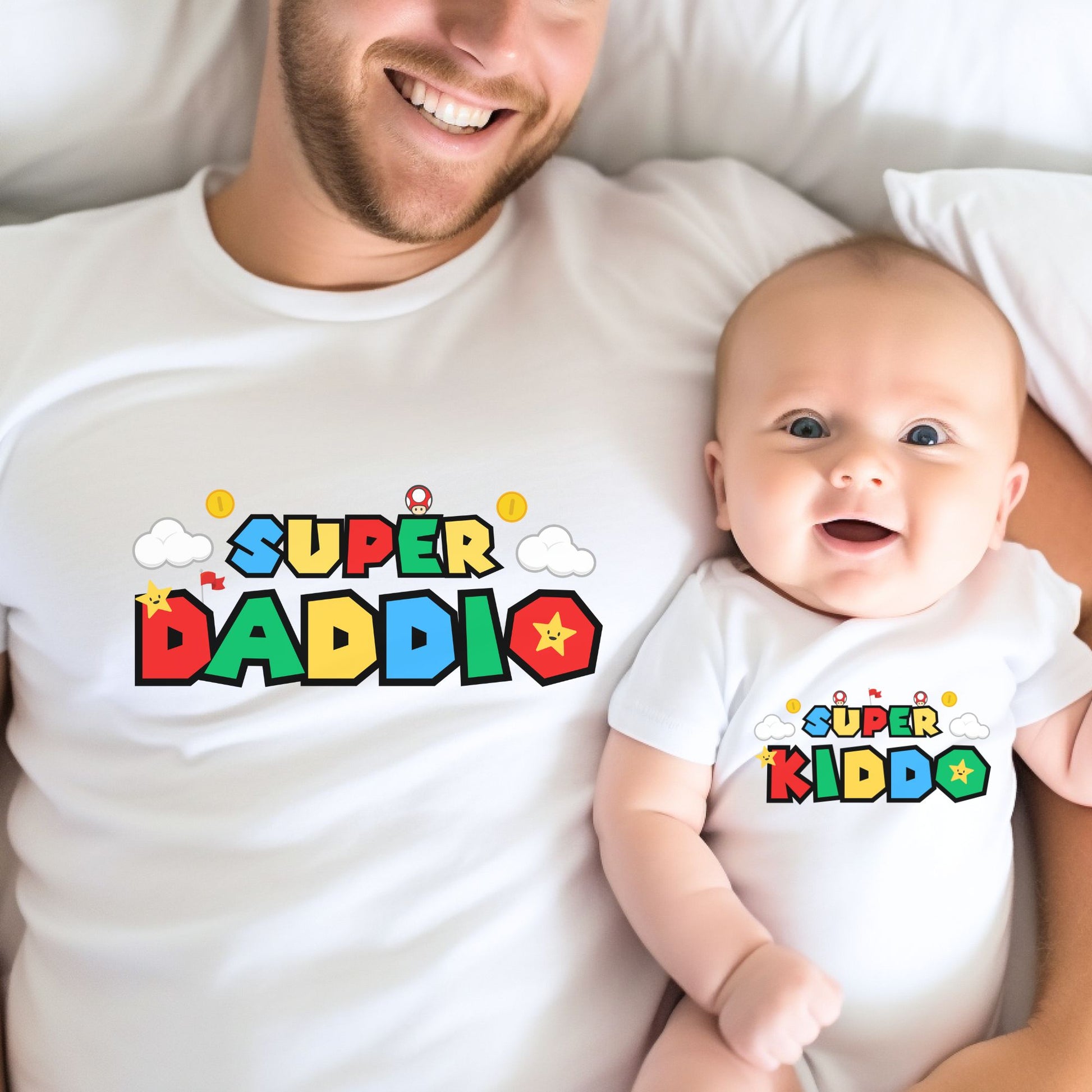 - Unique Design: Features the vibrant and playful "Super Daddio" and "Super Kiddo" graphics, inspired by classic video games, printed on a crisp white background.