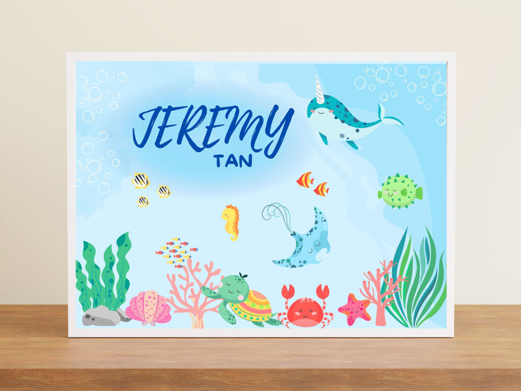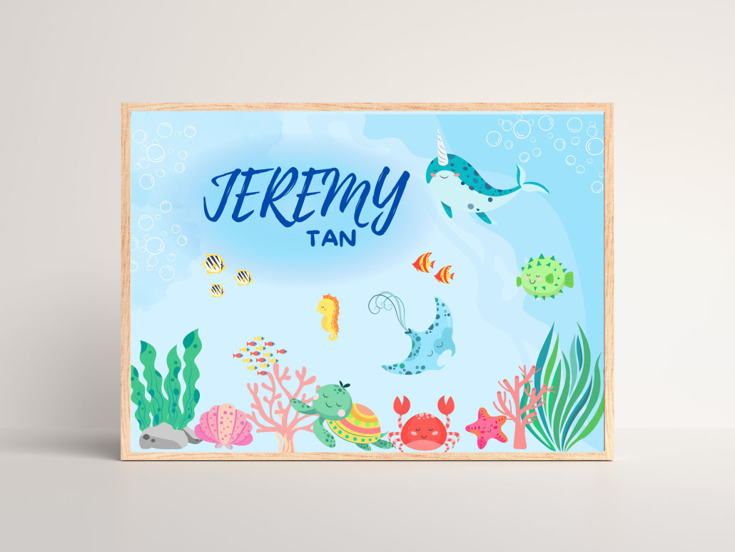 Make it truly special: Personalize the poster with your baby's name in a whimsical font, creating a unique keepsake that celebrates their arrival and their very own ocean adventure.